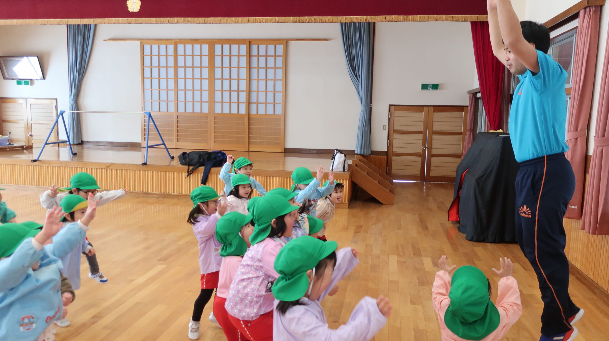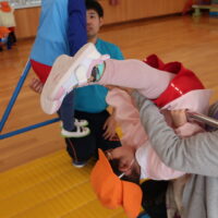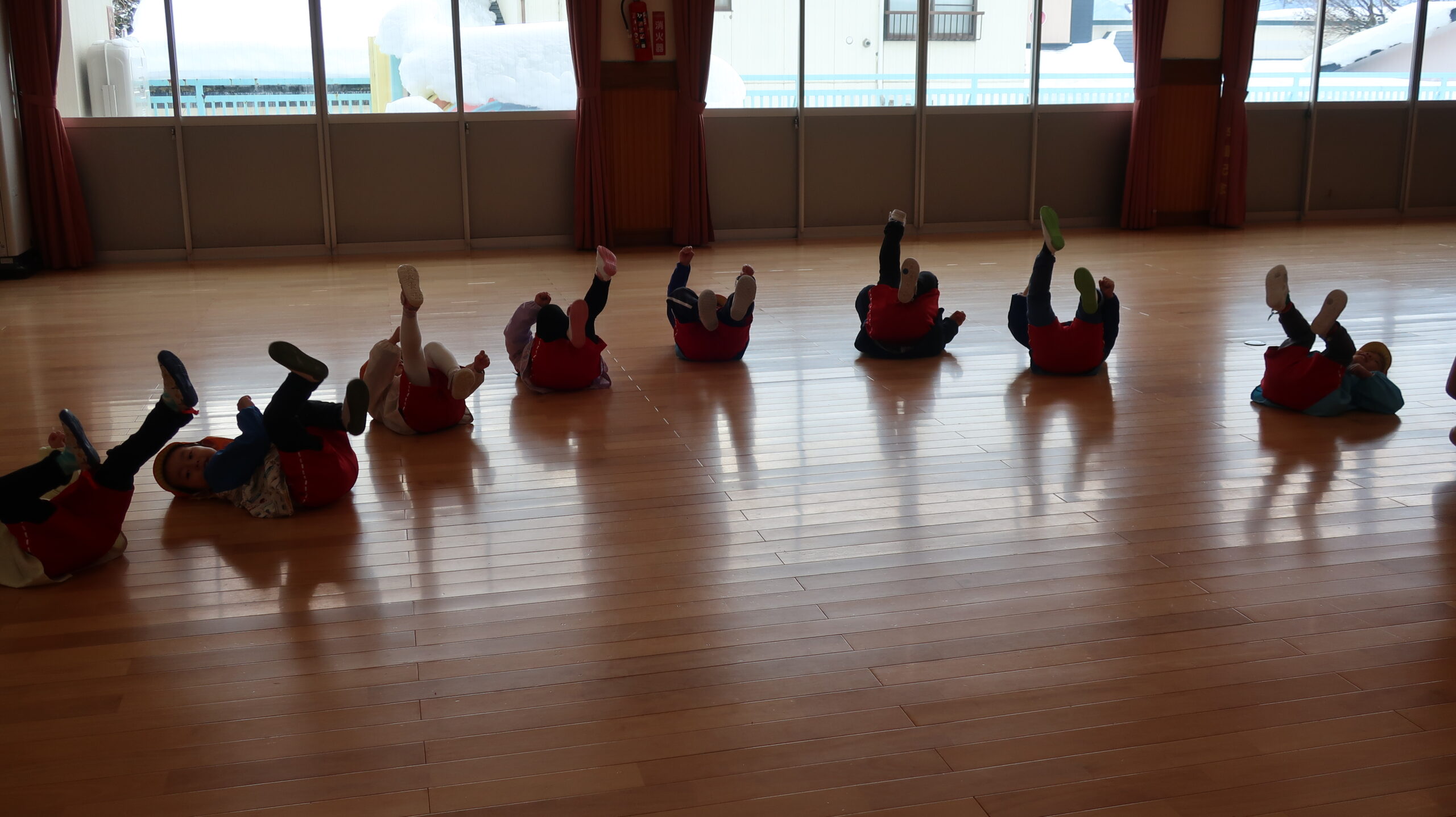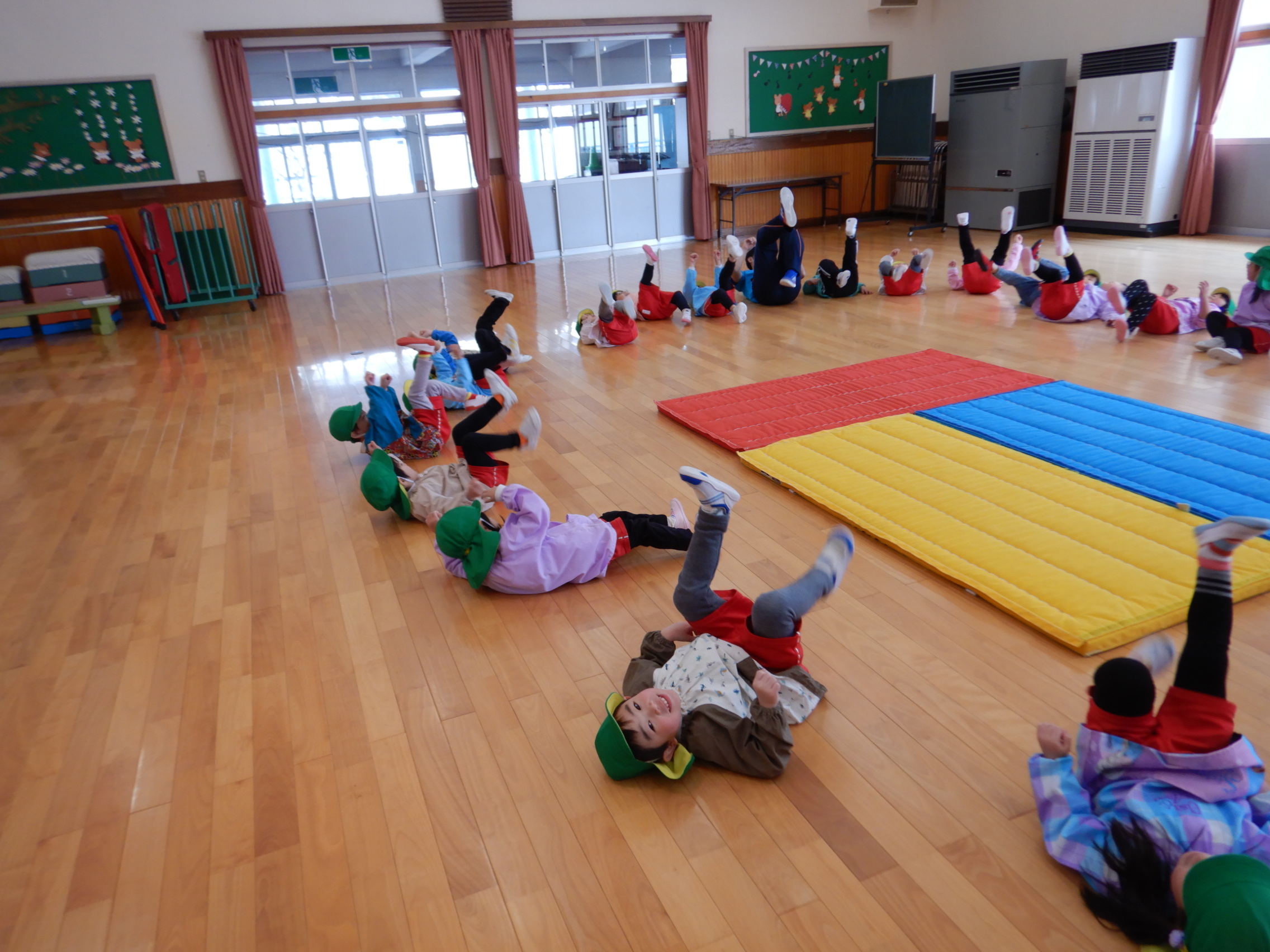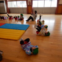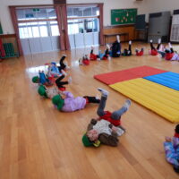 体育館に移動して早速準備運動開始!小さくしゃがんで大きくたか~~くジャンプ!!!したり、寝転んでバイク🏍に変身すると足をいっぱい動かして、後藤先生の「せーの!」の掛け声で起き上がるというちょっぴり難しいことにも挑戦☆何度か繰り返しているとあっという間に体はポカポカになりました☺