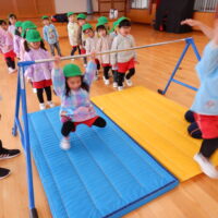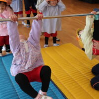『鉄棒はバイクの手(順手)でつかむ』『鉄棒から手は絶対に離さない』『ステーキのときは足から離す』などのお約束を聞いて、いよいよ皆の順番です。見ているときは簡単そうに見えたのですが、いざやってみるとこれがなかなかム・ズ・カ・シ・イ・・・でも、“”やってみたい!やってみよう!””という子ども達の意欲は満々!しっかりと鉄棒をつかんで挑戦する子ども達の姿が見られました。その頑張っているお友達の様子に「がんばれ~📣」と応援する声がたくさん聞こえてきました👏