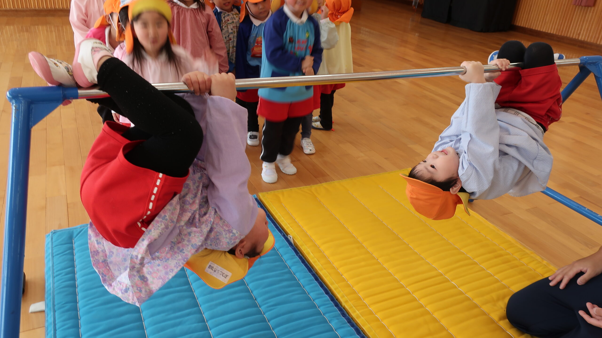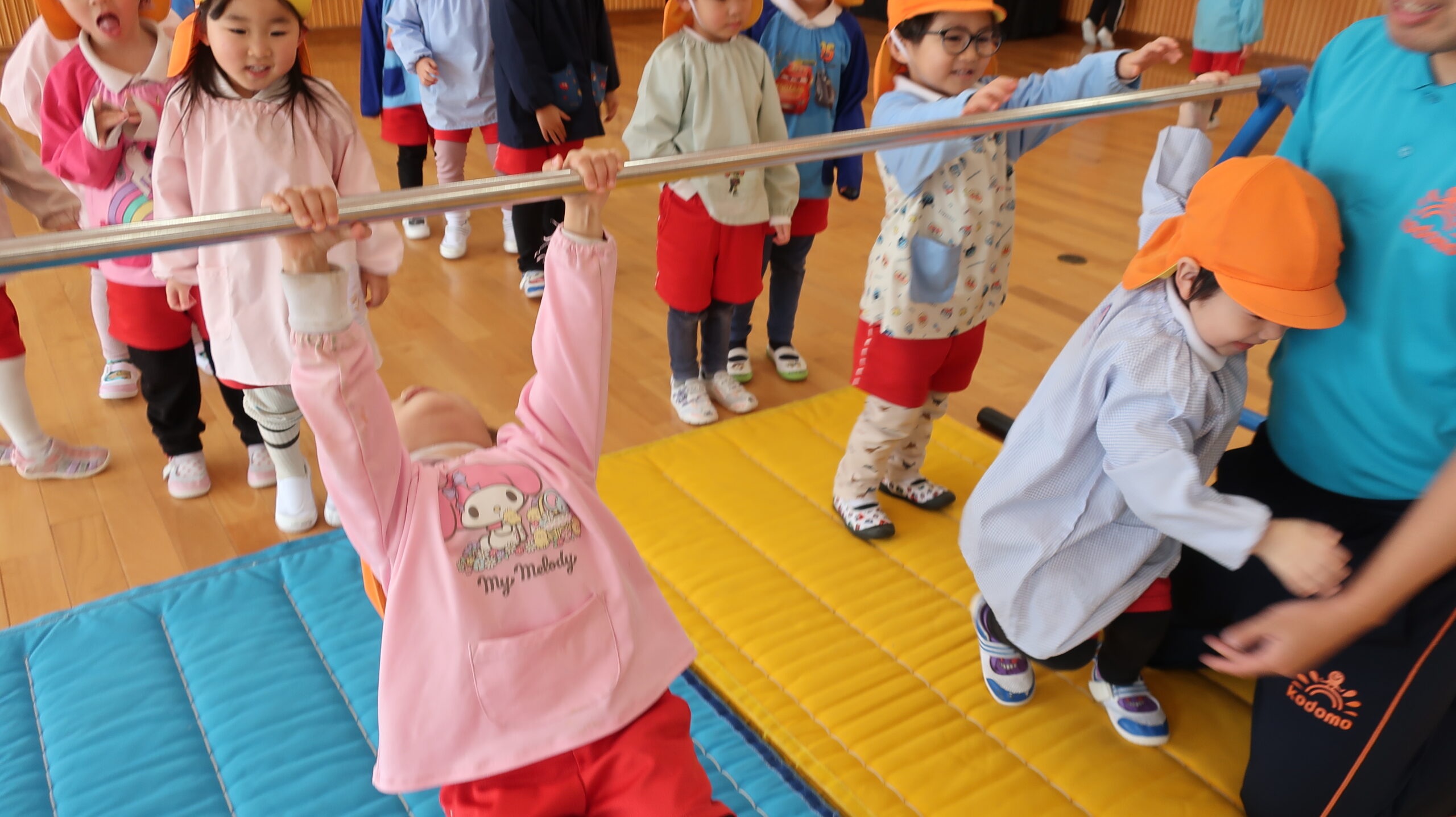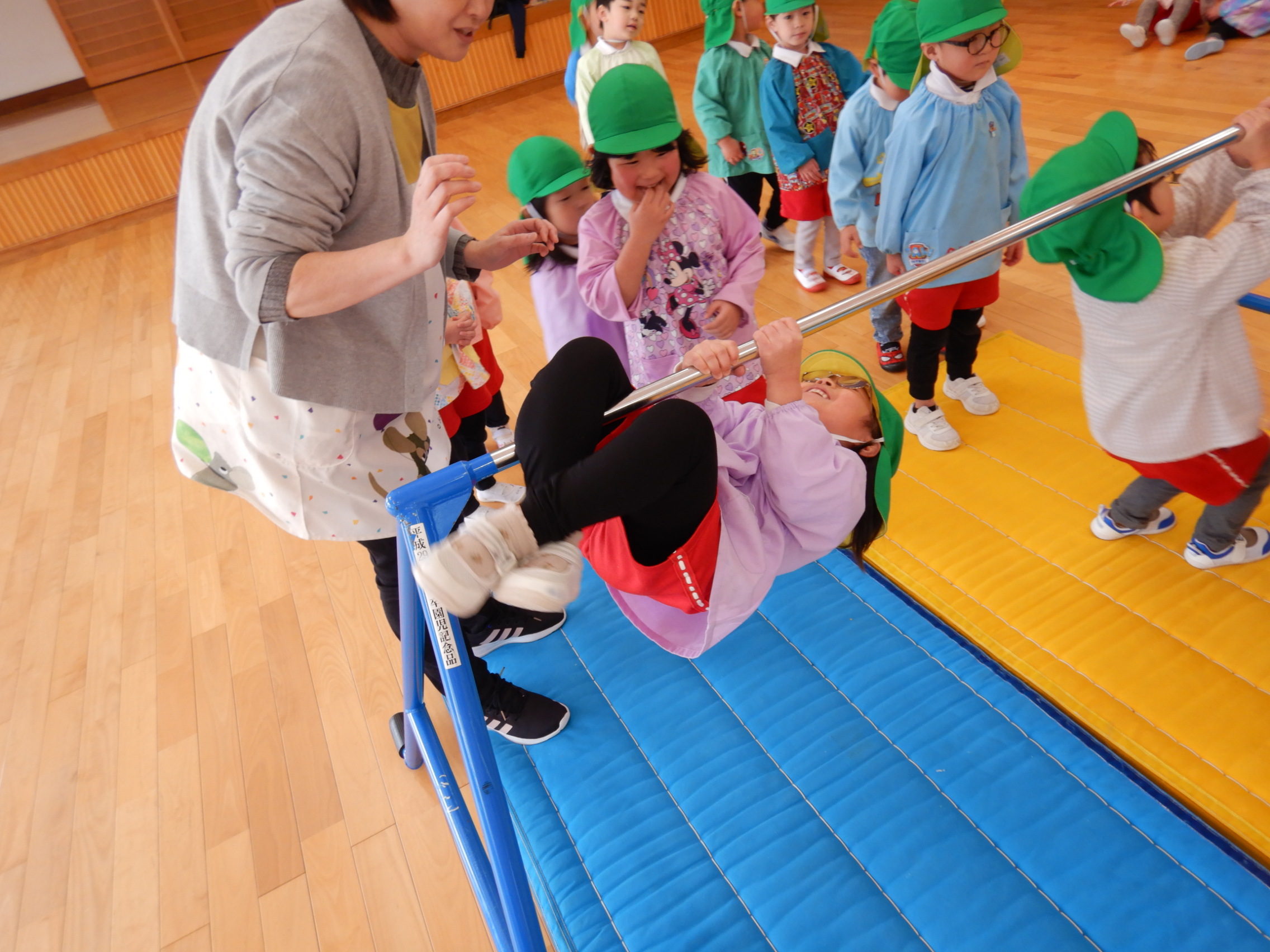 さあ、いよいよ鉄棒の登場です✨後藤先生が鉄棒にぶら下がる「焼き鳥」と手足でしがみつく「ステーキ」の2つの技をやってみせてくれました。