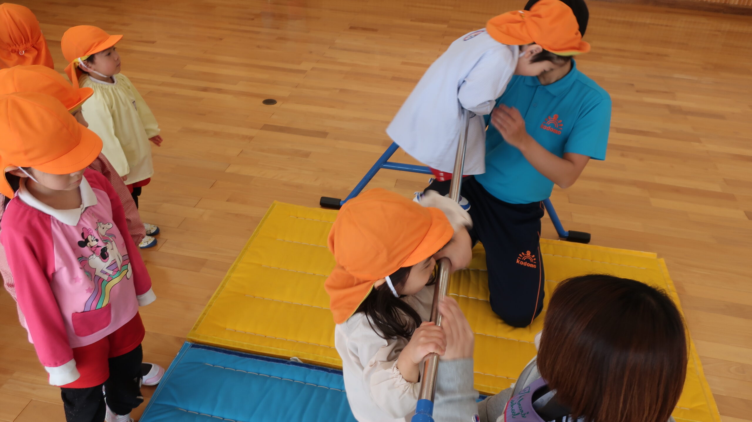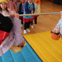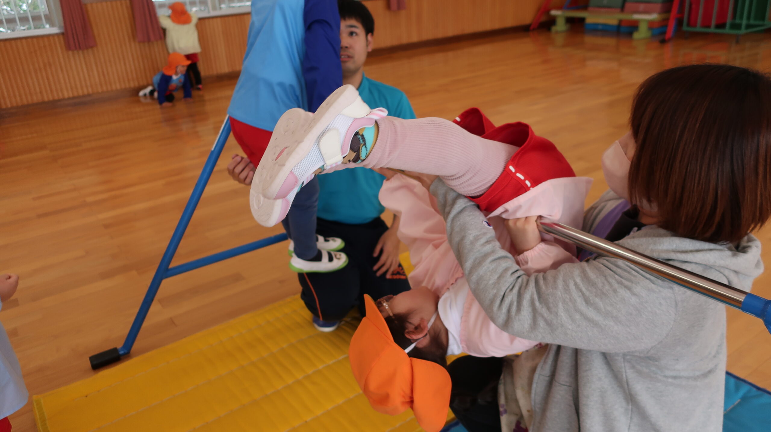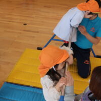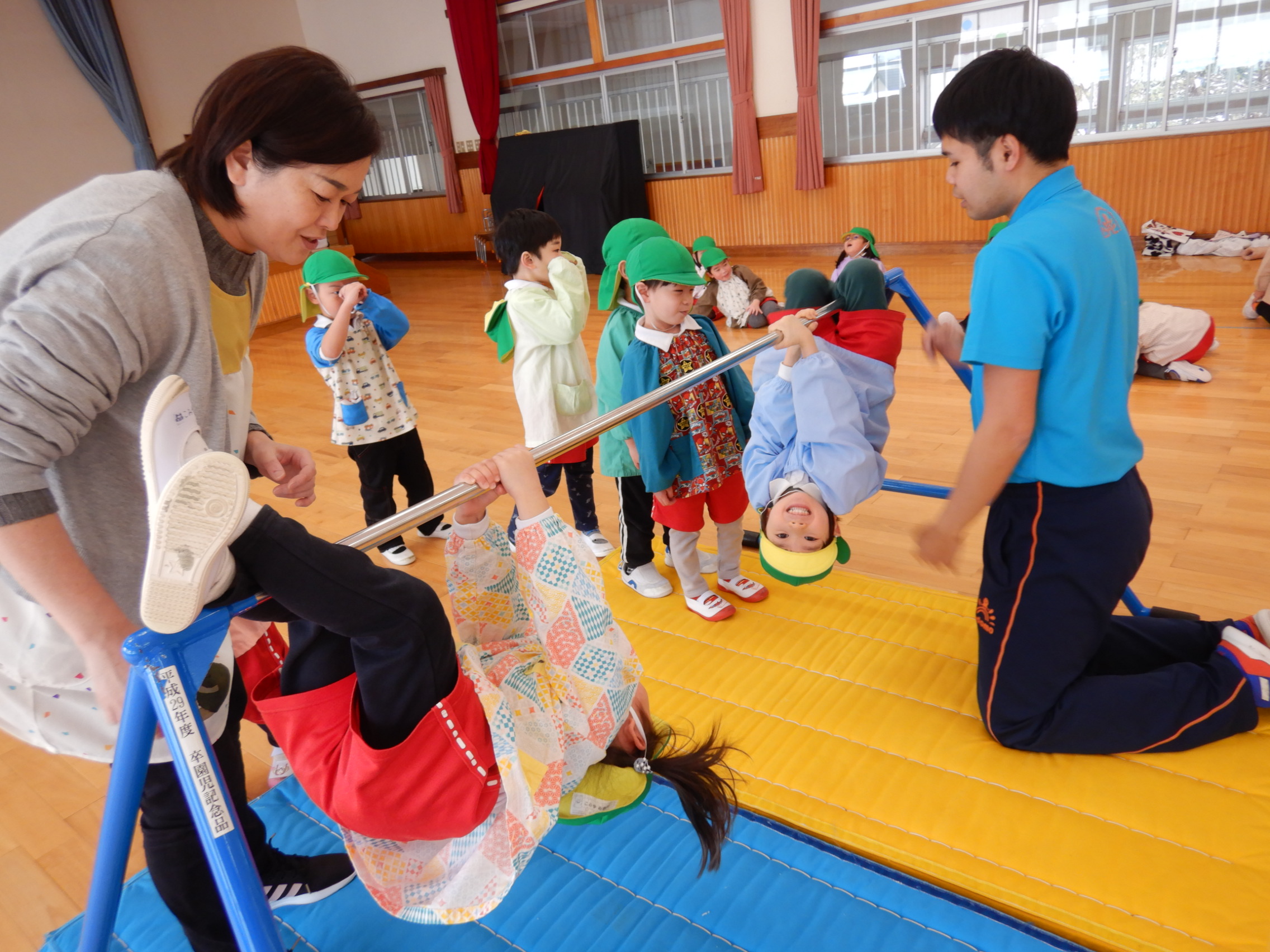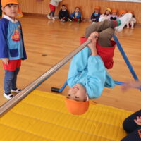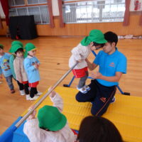 最後にぐっと鉄棒をつかみ、後藤先生に支えてもらいながらくるりんと一回転!くるっとまわる感覚にドキドキしながらもみ~んなくるりんっと前回りすることができました😊