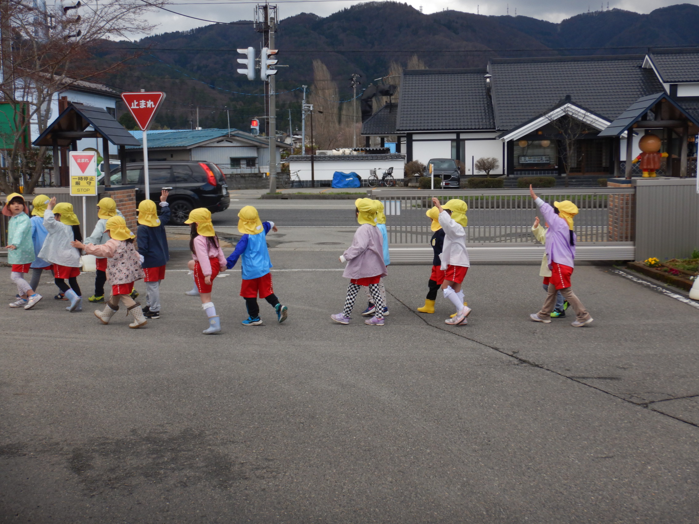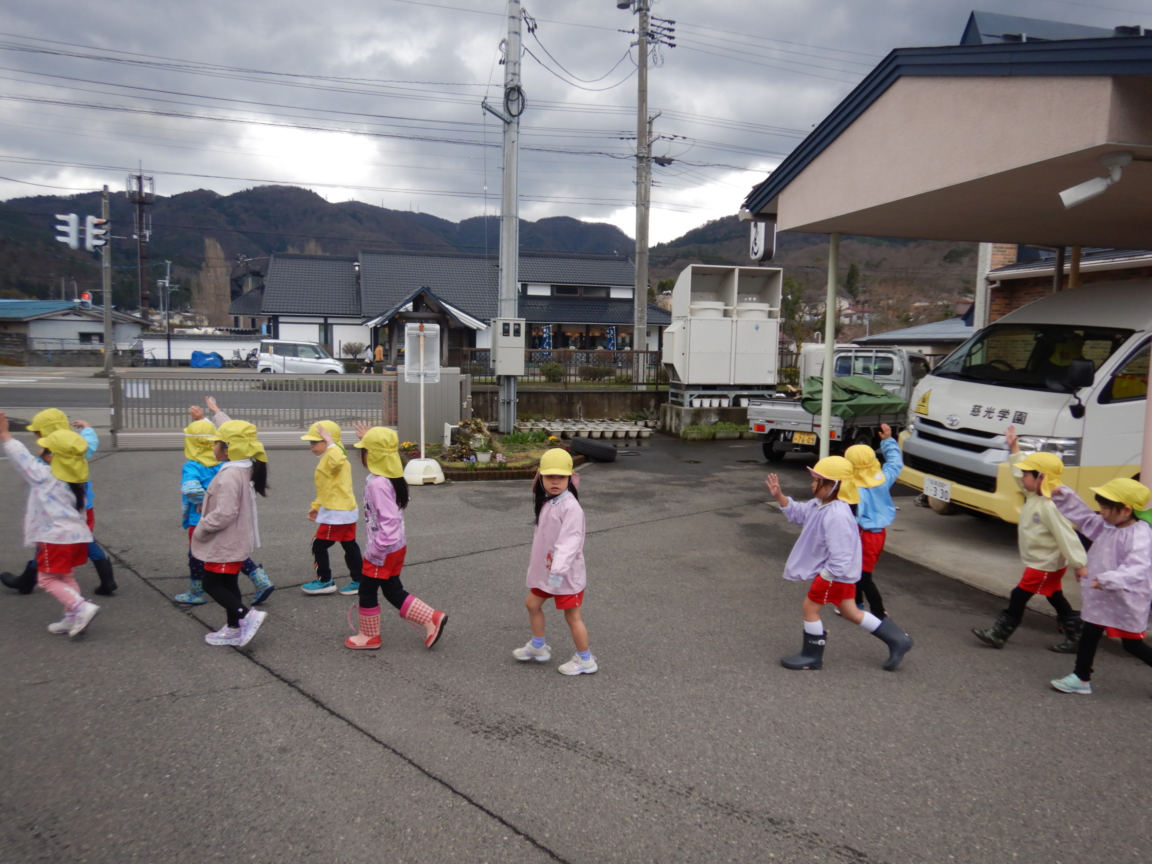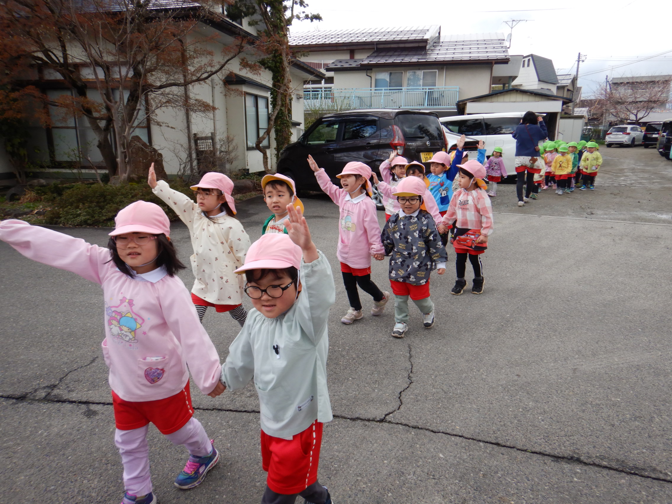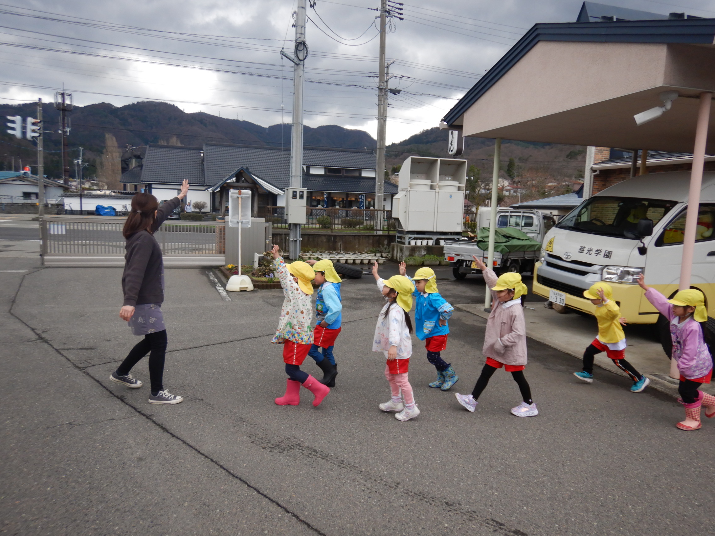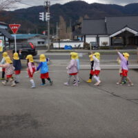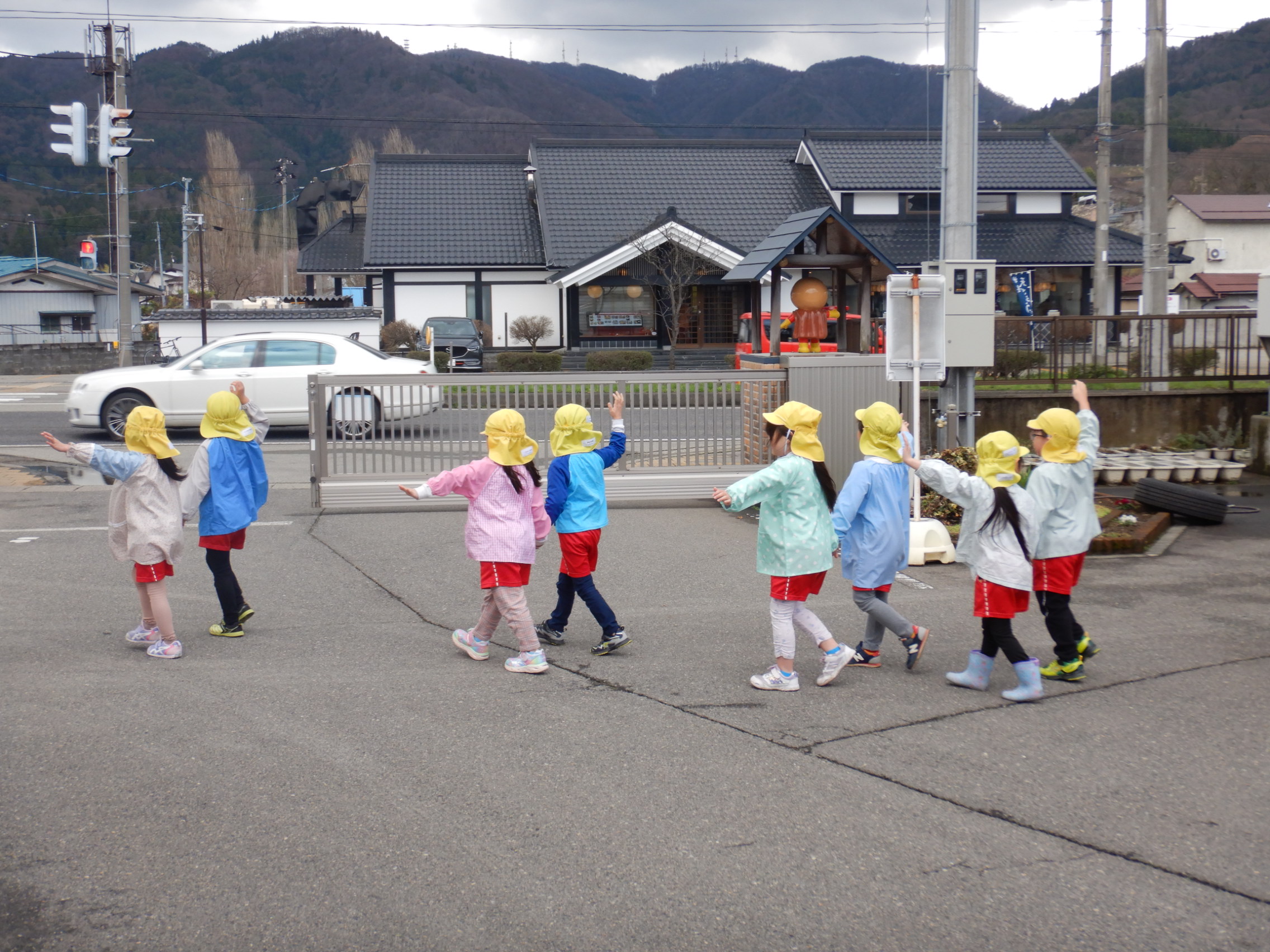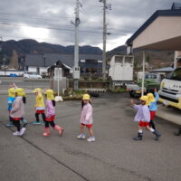 保育室に戻ってから年少さんは各クラスで紙芝居をみて先生と交通ルールについてもう一度話を聞き、年中長さんは園の敷地内で歩行訓練を行いました。今まで知っていたことでも改めて話を聞いた後で意識して歩くことができました。