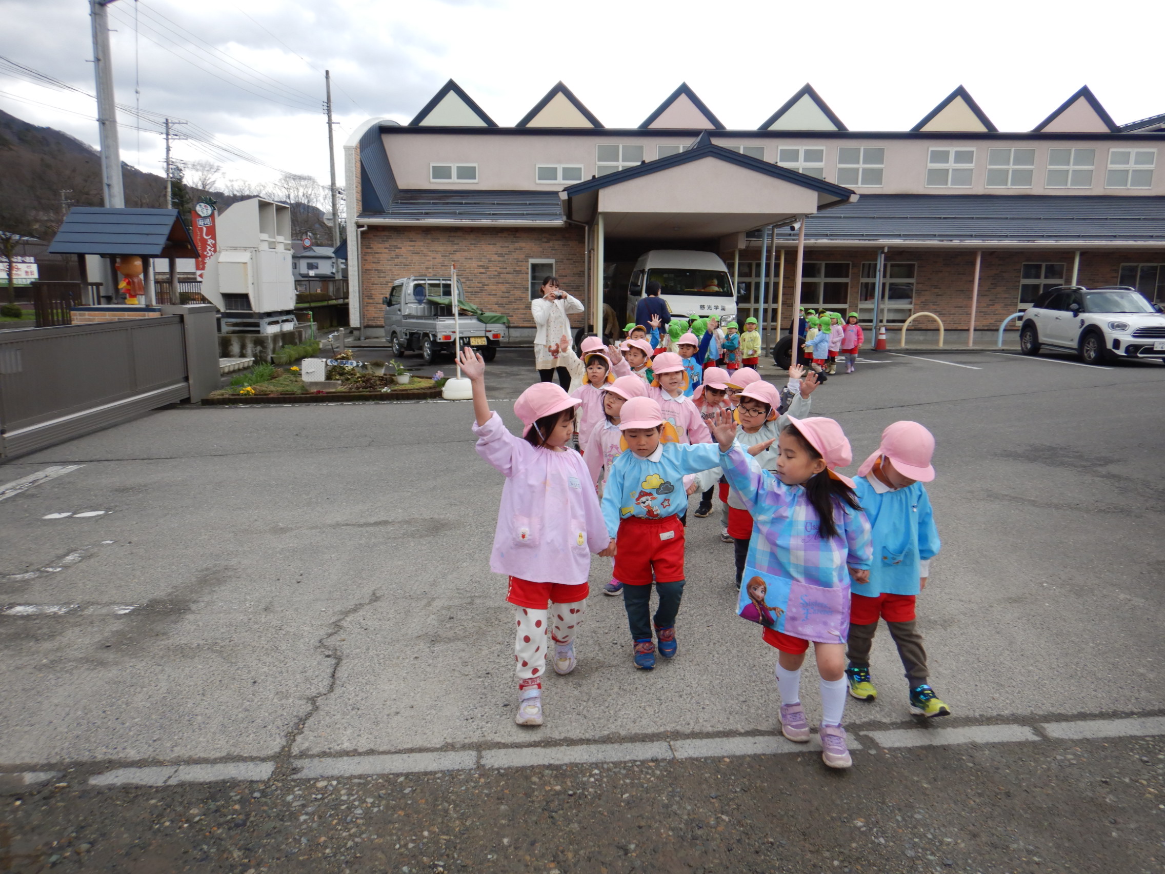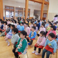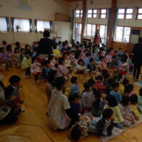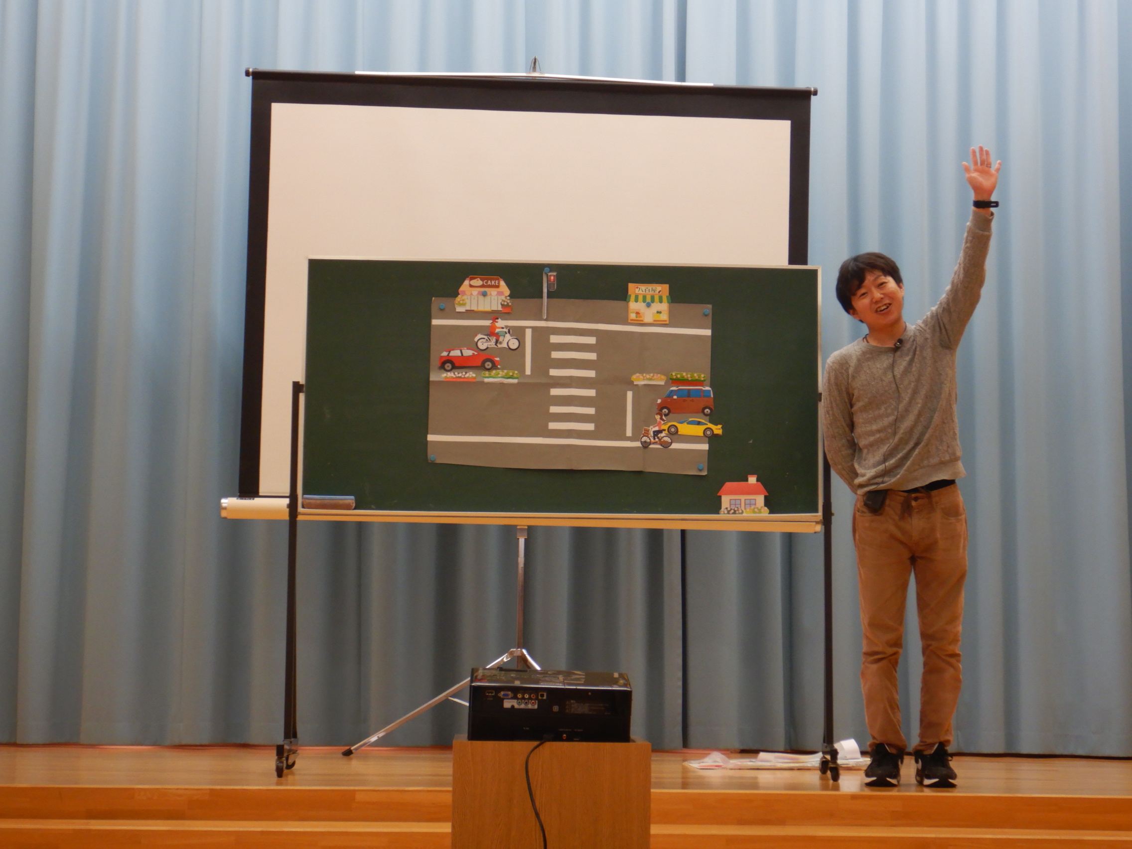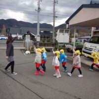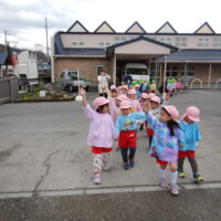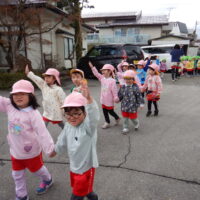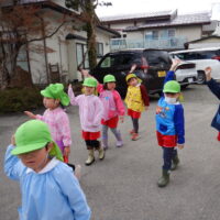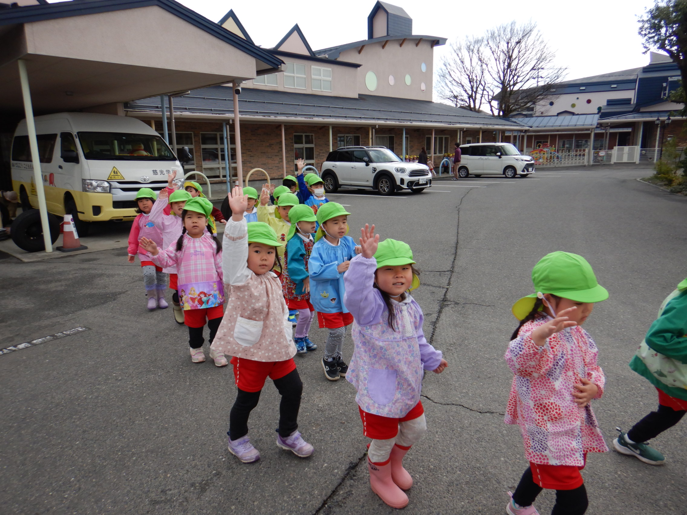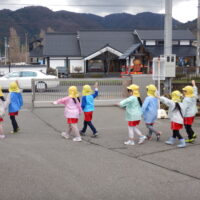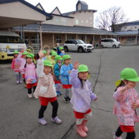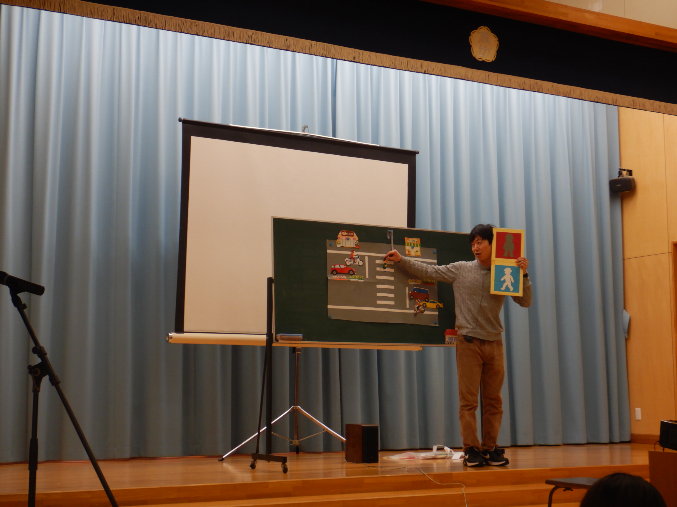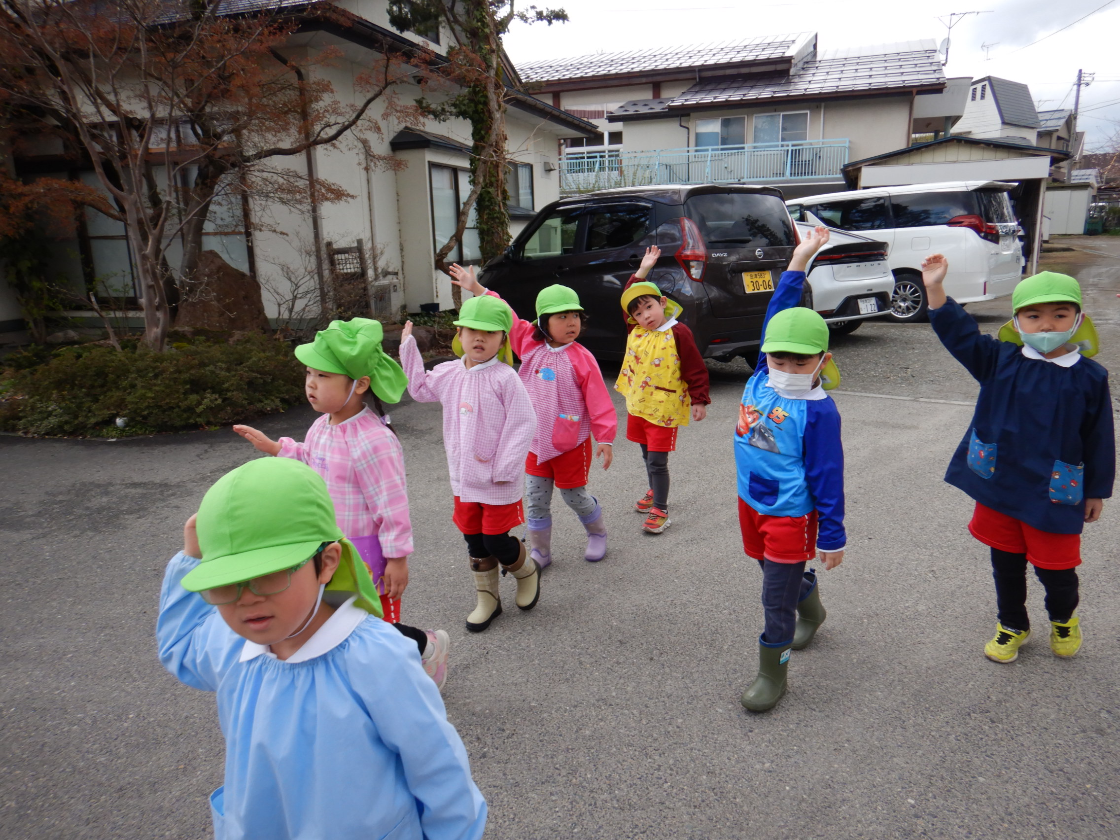 保育室に戻ってから年少さんは各クラスで紙芝居をみて先生と交通ルールについてもう一度話を聞き、年中長さんは園の敷地内で歩行訓練を行いました。今まで知っていたことでも改めて話を聞いた後で意識して歩くことができました。