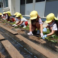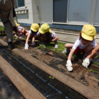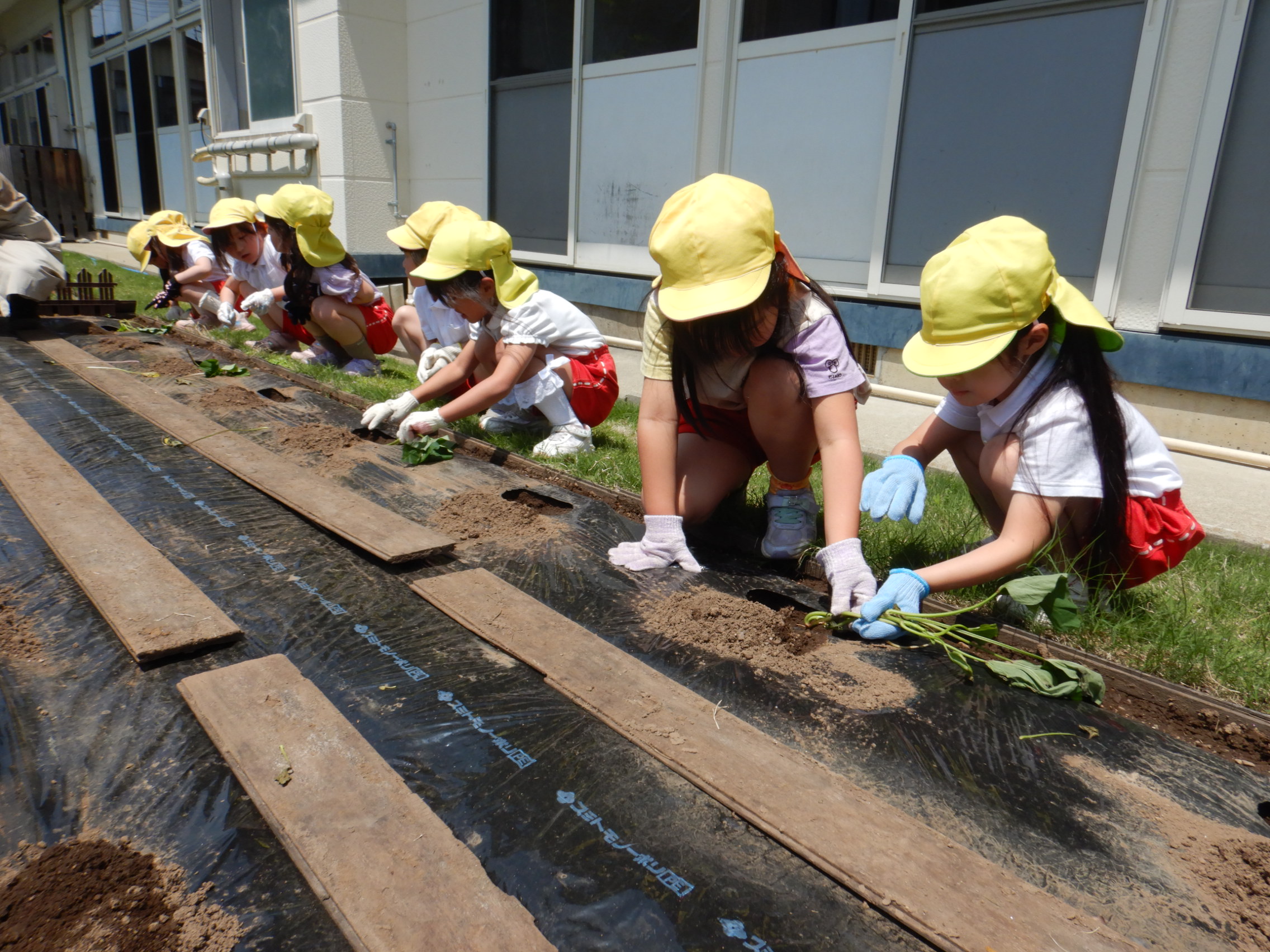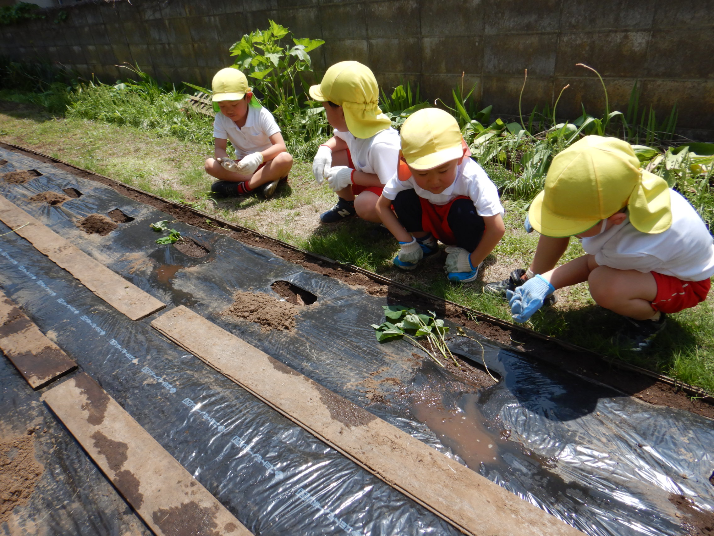 先月植えたじゃがいもの種芋に引き続き、今日はさつまいもの苗を植える活動を行いました。