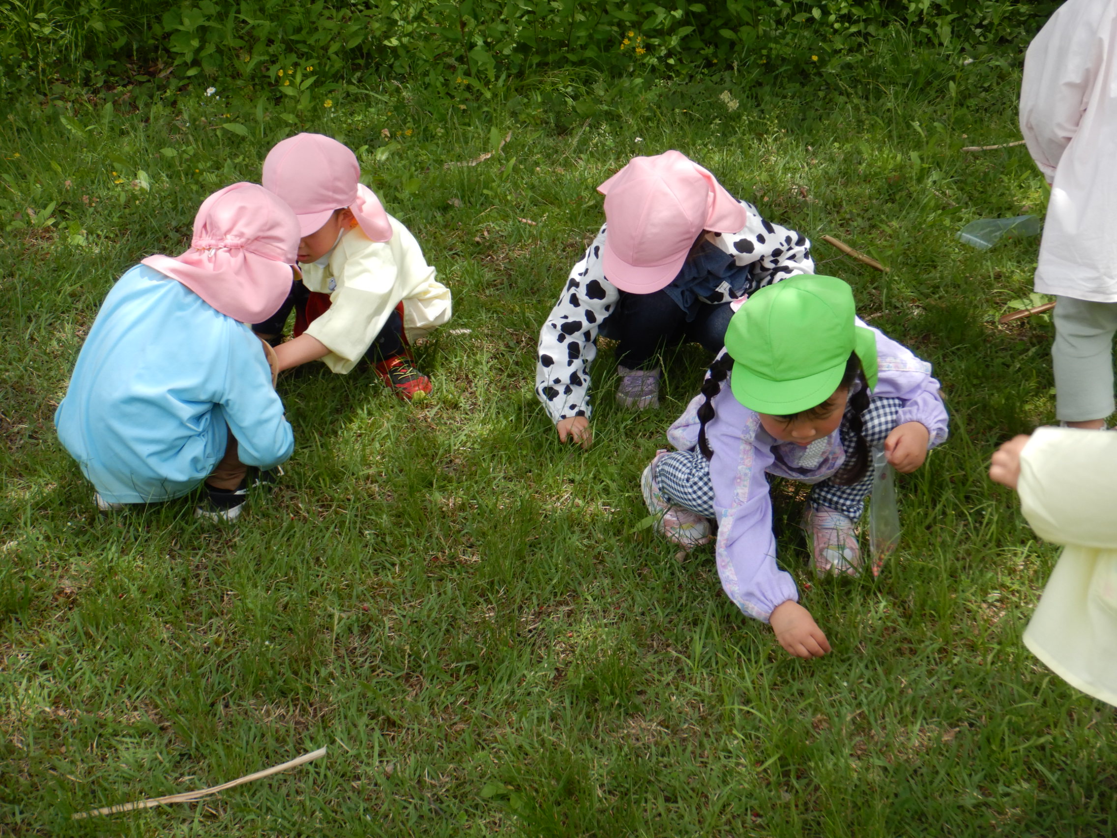 先日、年長さんが子どもの森に園外保育に来た時に捕まえてくれたオタマジャクシをみんなで観察していたのですが、日に日に大きくなり虫かごの中でぎゅうぎゅう狭そうにしていたので、そのオタマジャクシたちを池に返してきました。池に近づくとカエルの鳴き声が聞こえ、まるでオタマジャクシたちの帰りを待っていたかのようでした。子ども達は「大きくなってね、バイバ~イ👋」「またね~」とお家に返してきました。