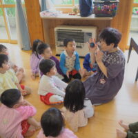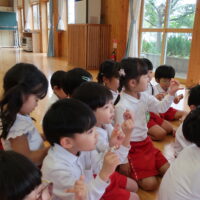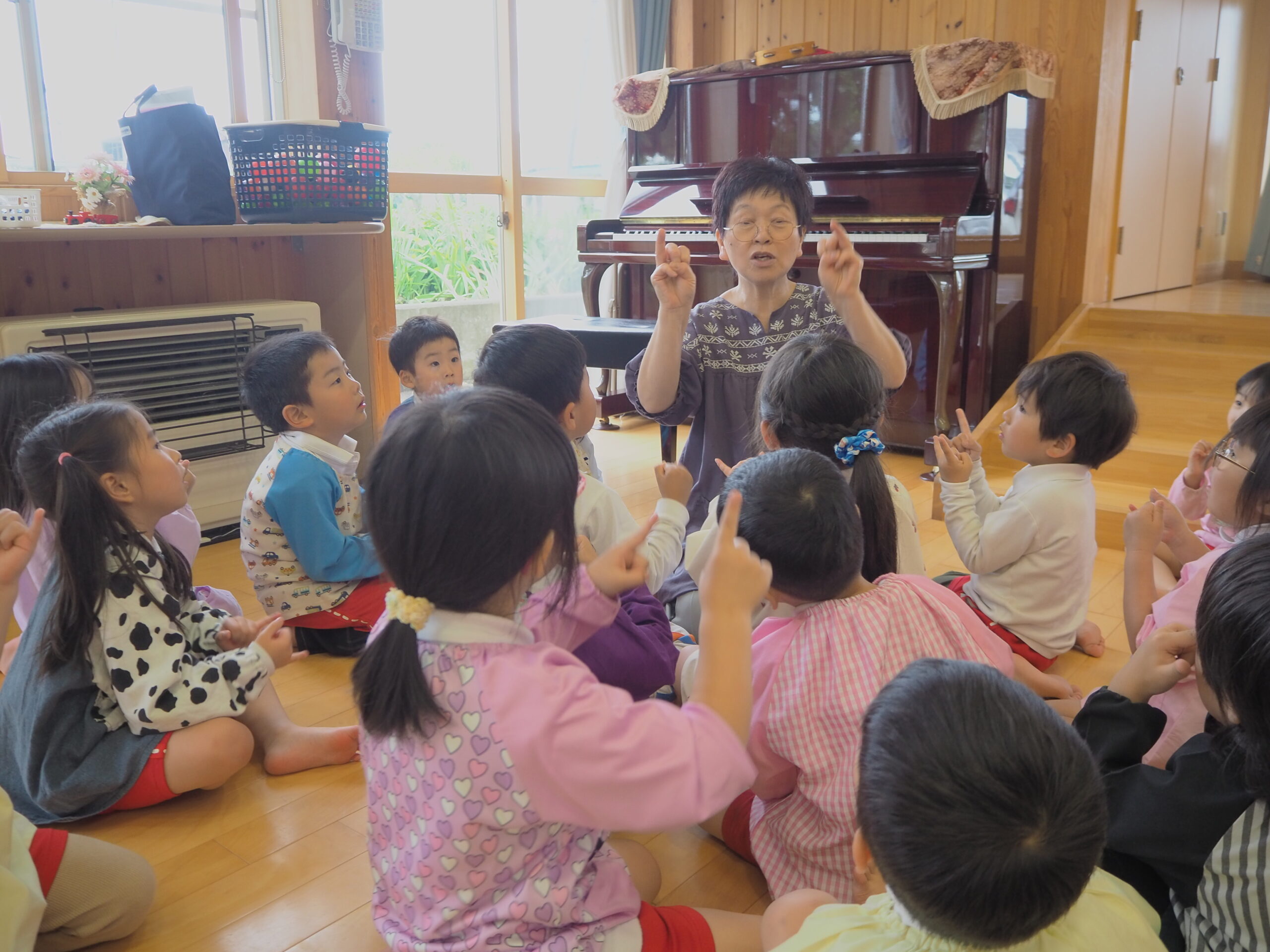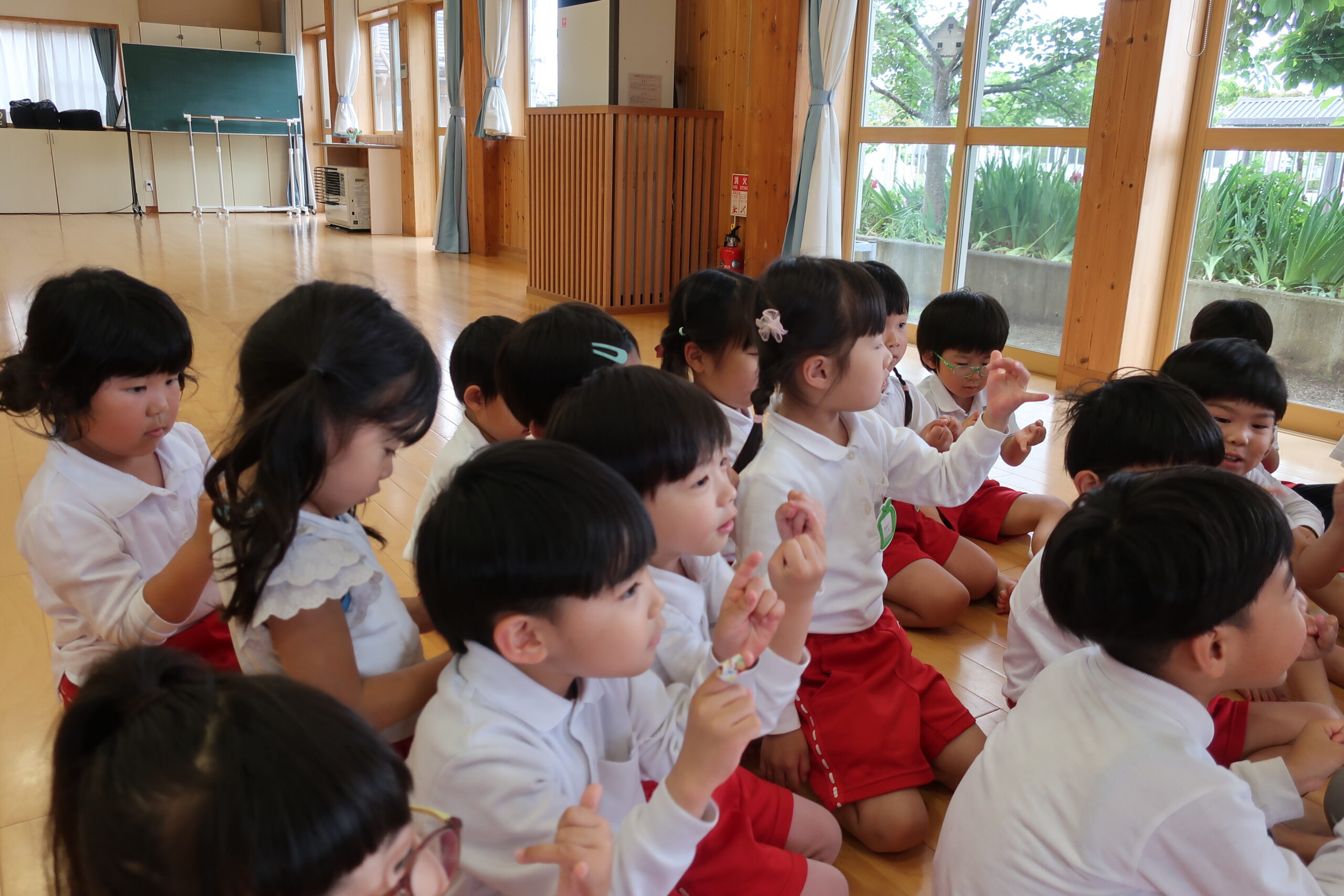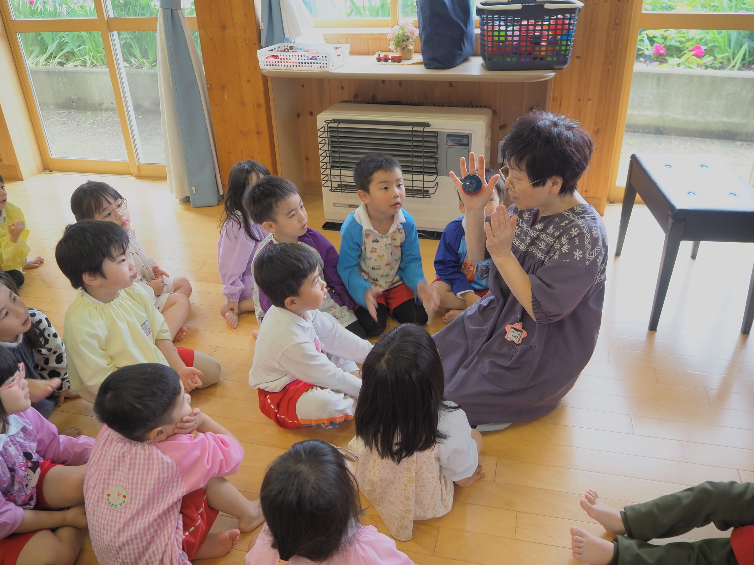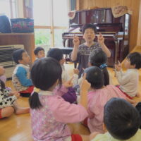 次に5本指がどんな名前なのかが分かる手遊びをして‟左手の中指”がどこなのかを確認しました。左手の中指はカスタネットをつける指であることを教えてもらいみんなで実際にカスタネットを持ち、それからピアノに合わせてカスタネットをたたきました🎶