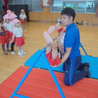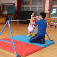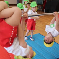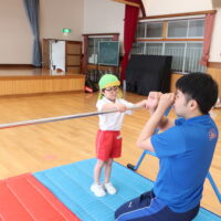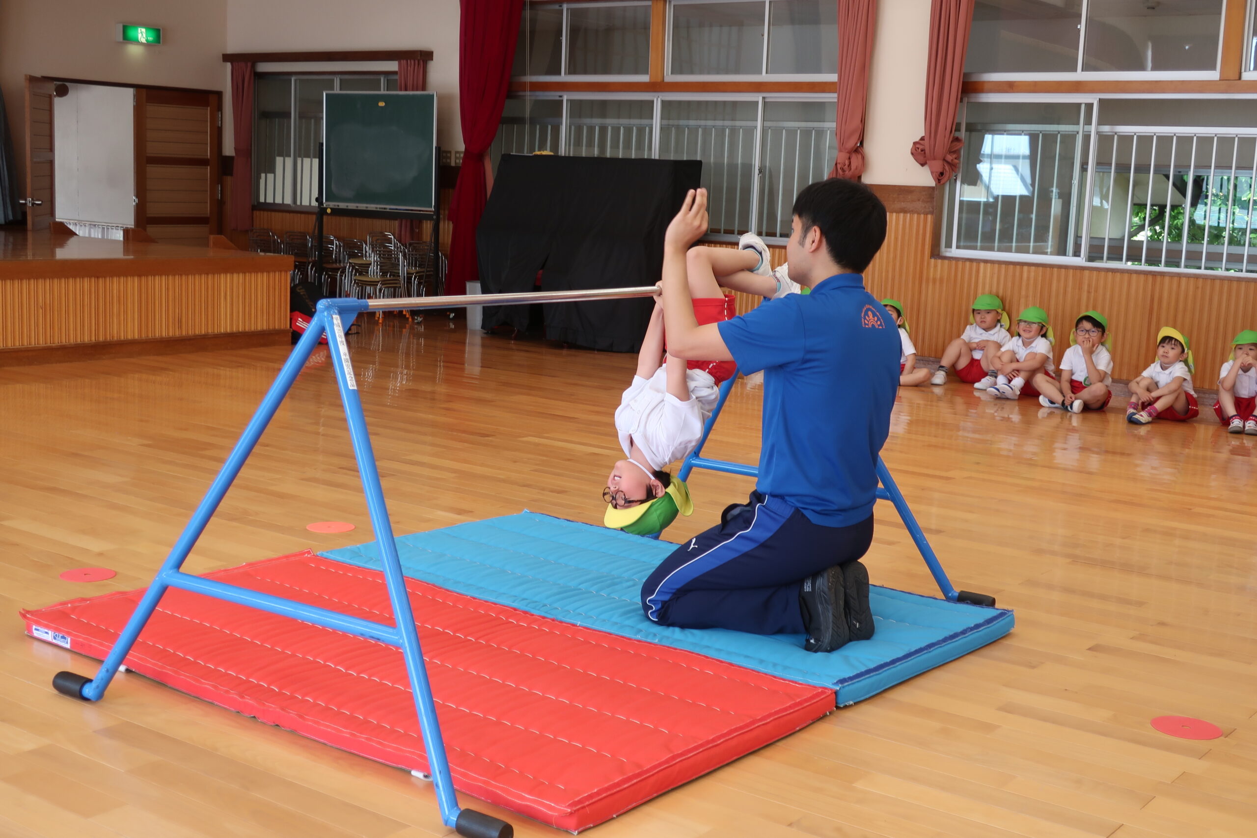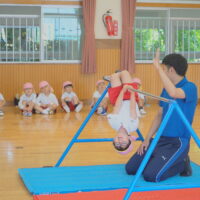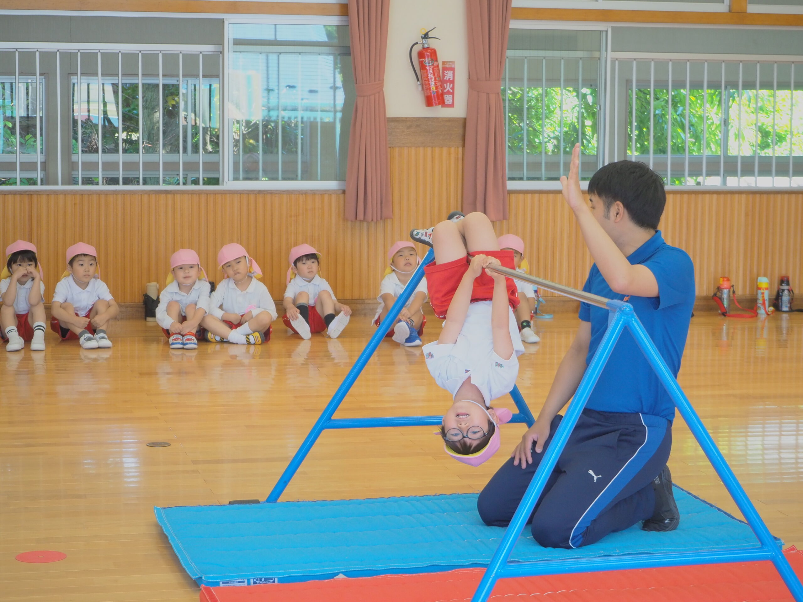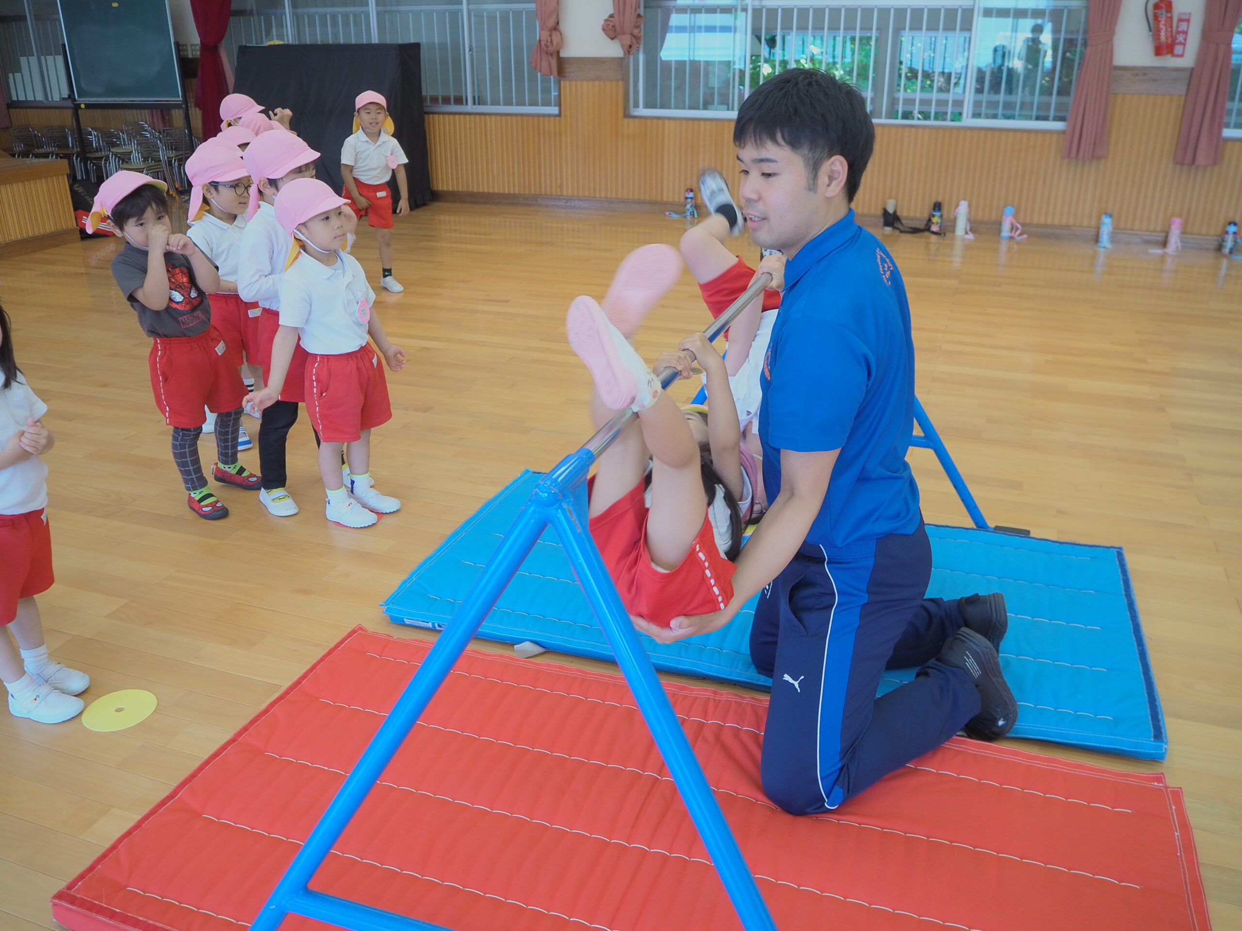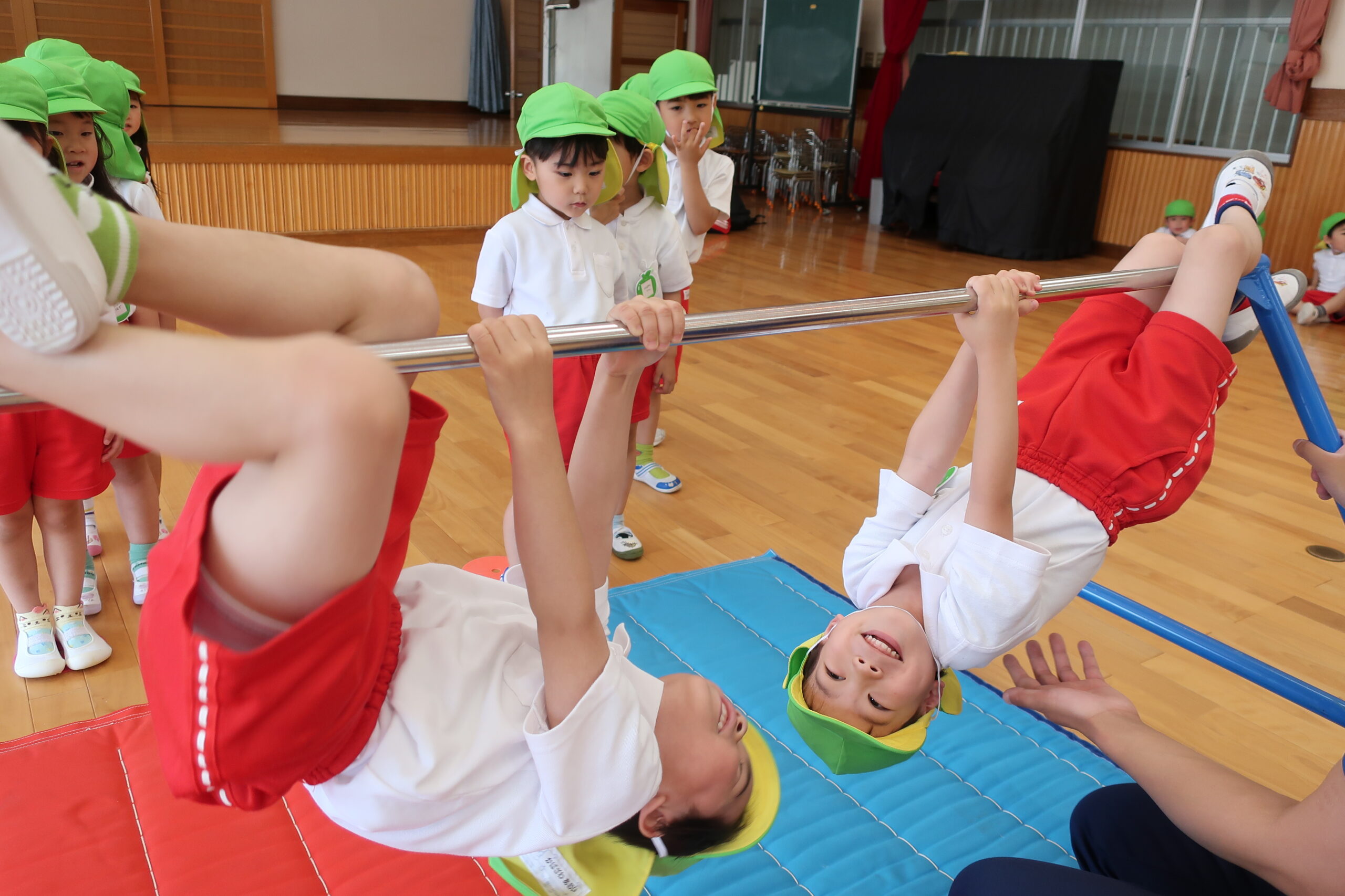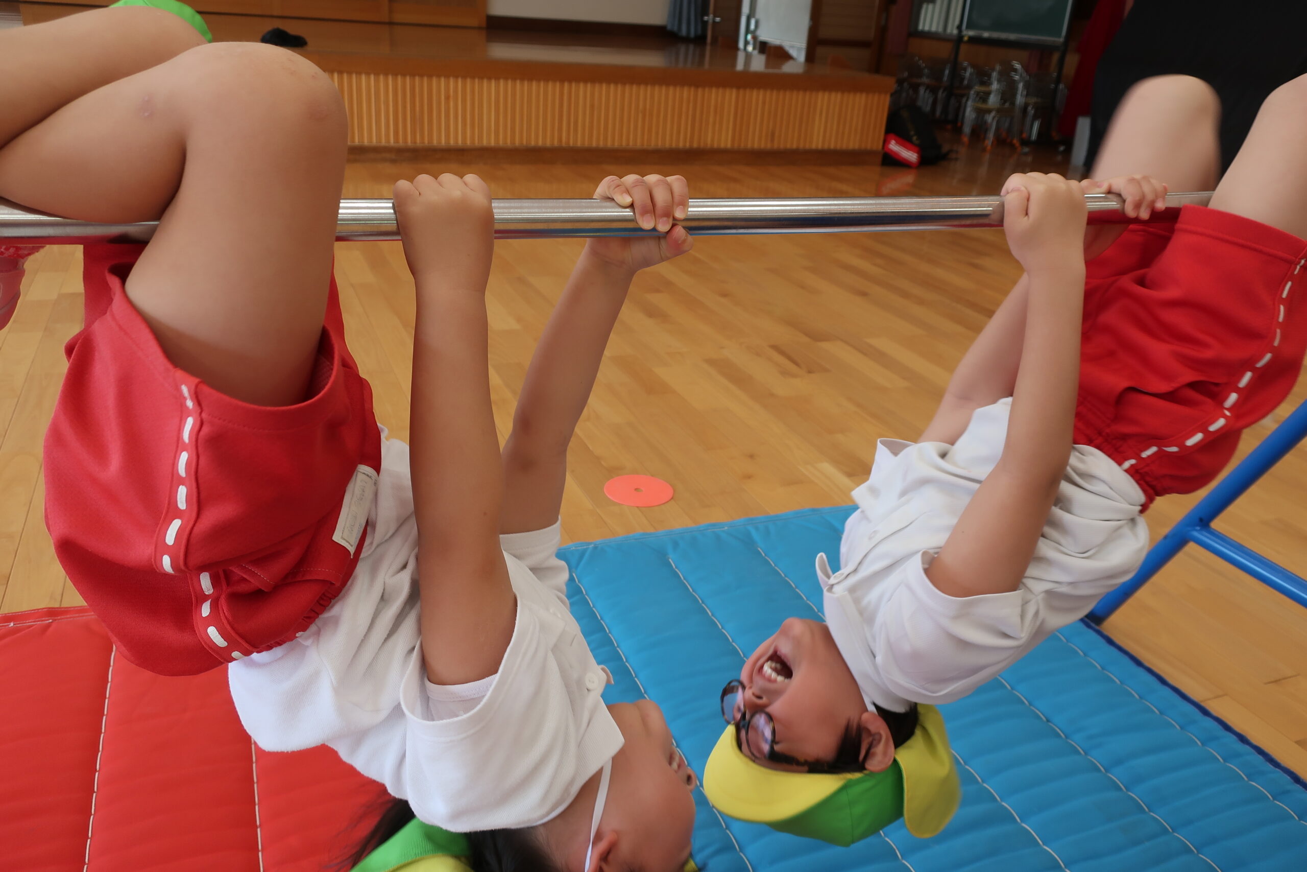 その手を忘れないように、鉄棒に手をかけ、足も鉄棒にかけてみます!難しいけど・・・やってみよう!みんなで挑戦です!