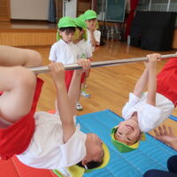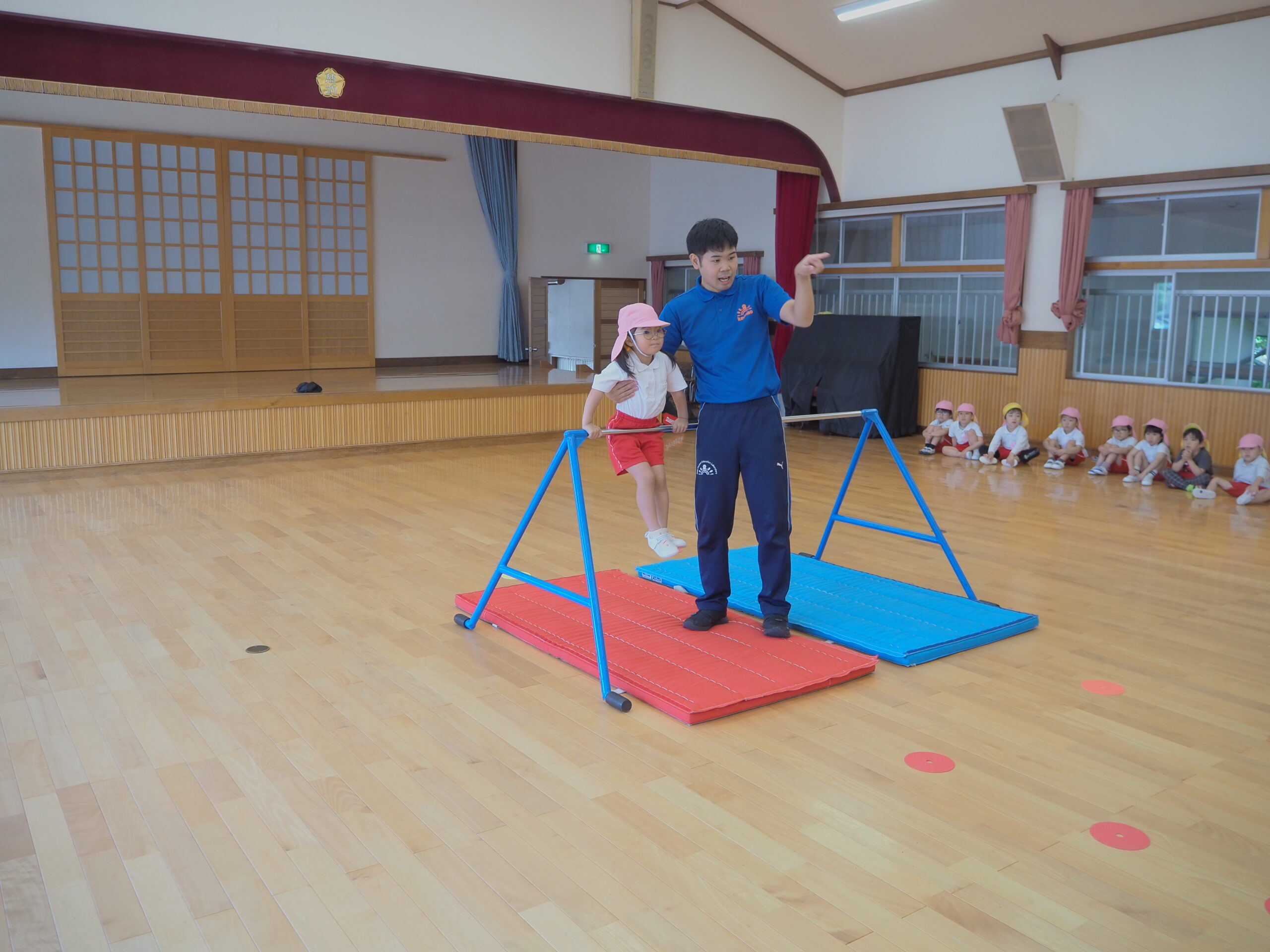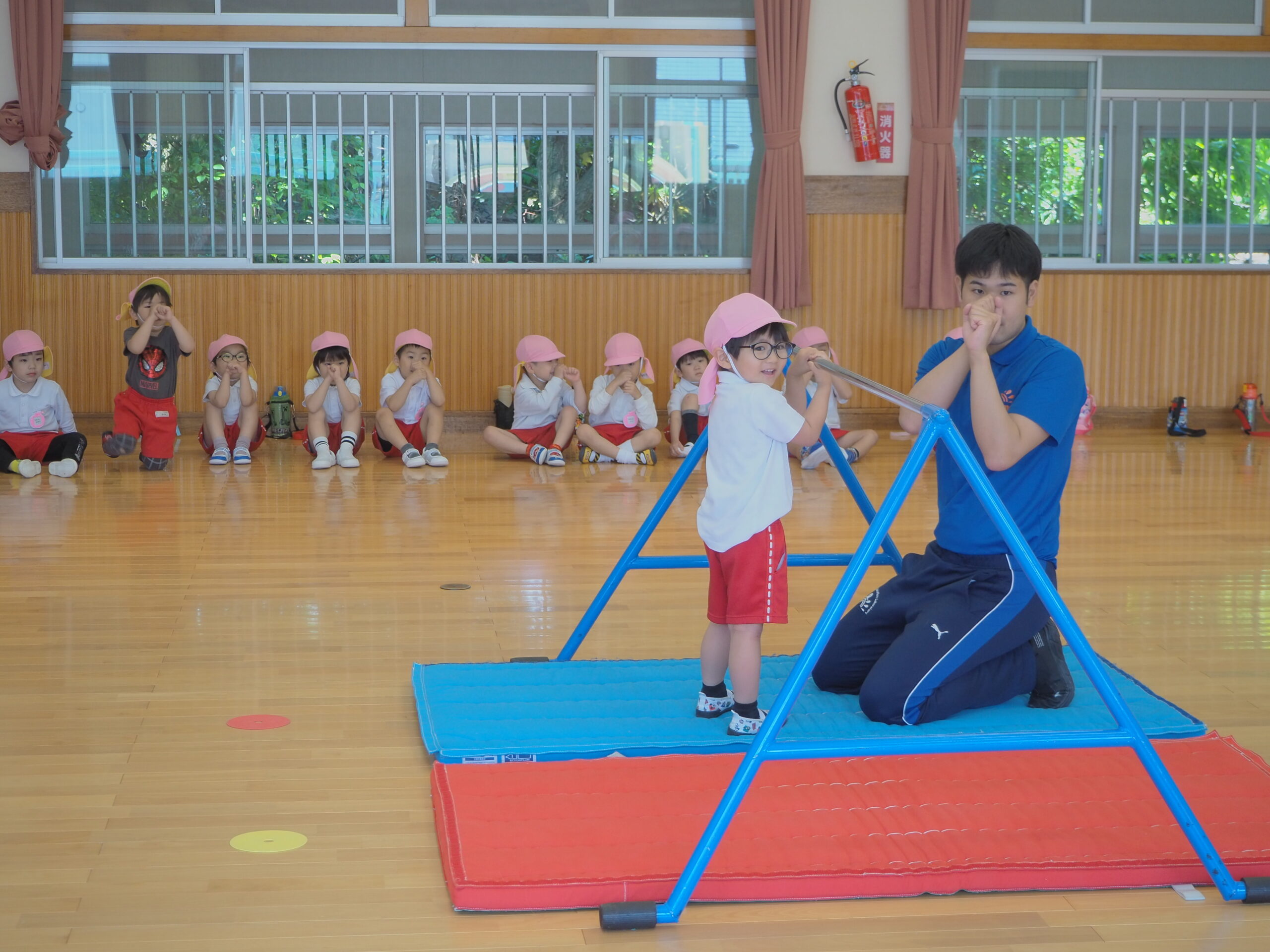 次に後藤先生が鉄棒を持ってくると、それを見た子ども達からは「前回りできるよ!」「ぶらりんってできるよ!」といった声が聞こえてきました。鉄棒に必要な手の動きを後藤先生と一緒に確認です!手をグー✊にして鼻にあてると「天狗様」のできあがり!