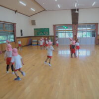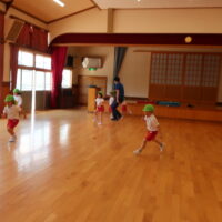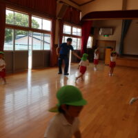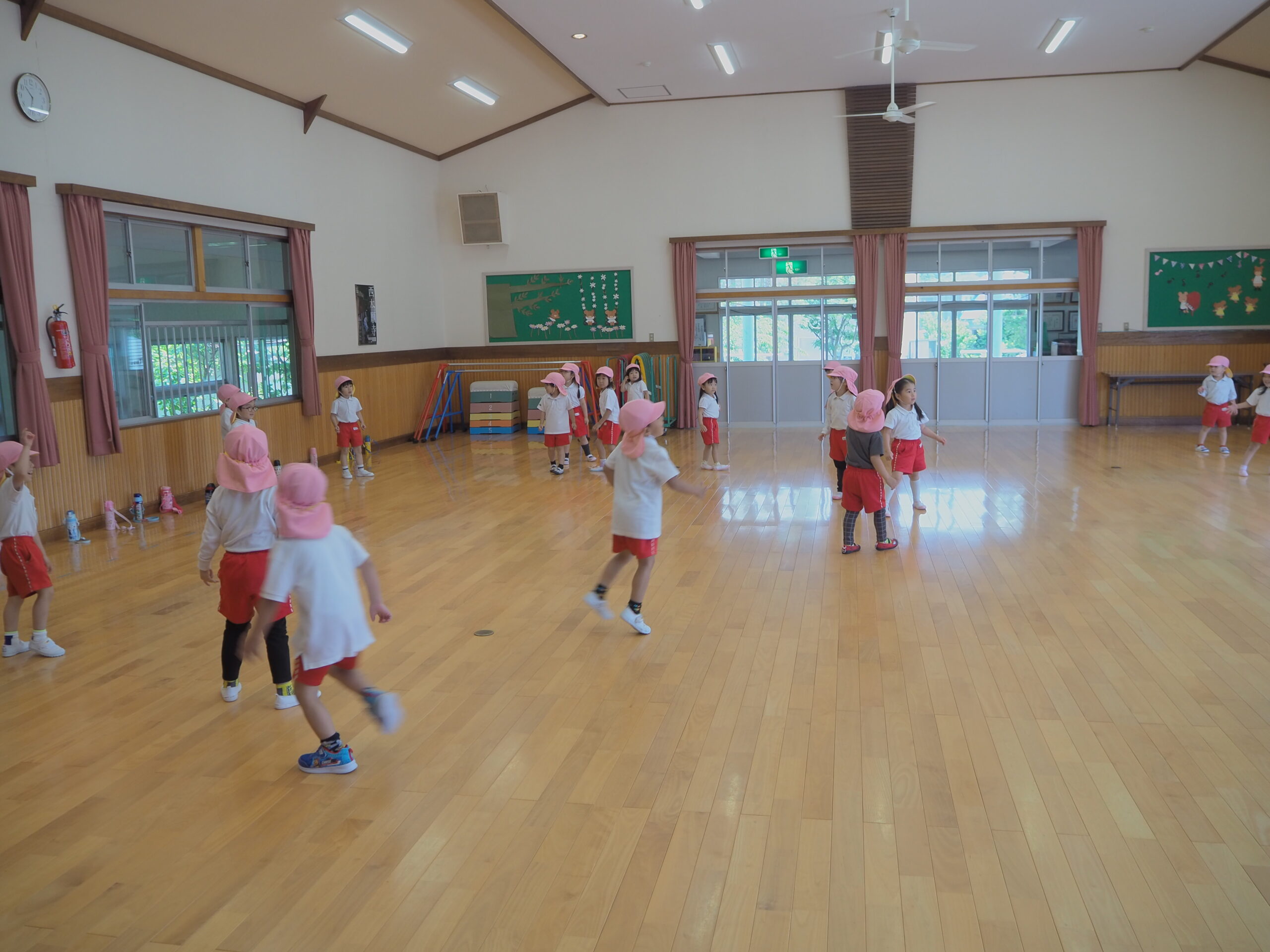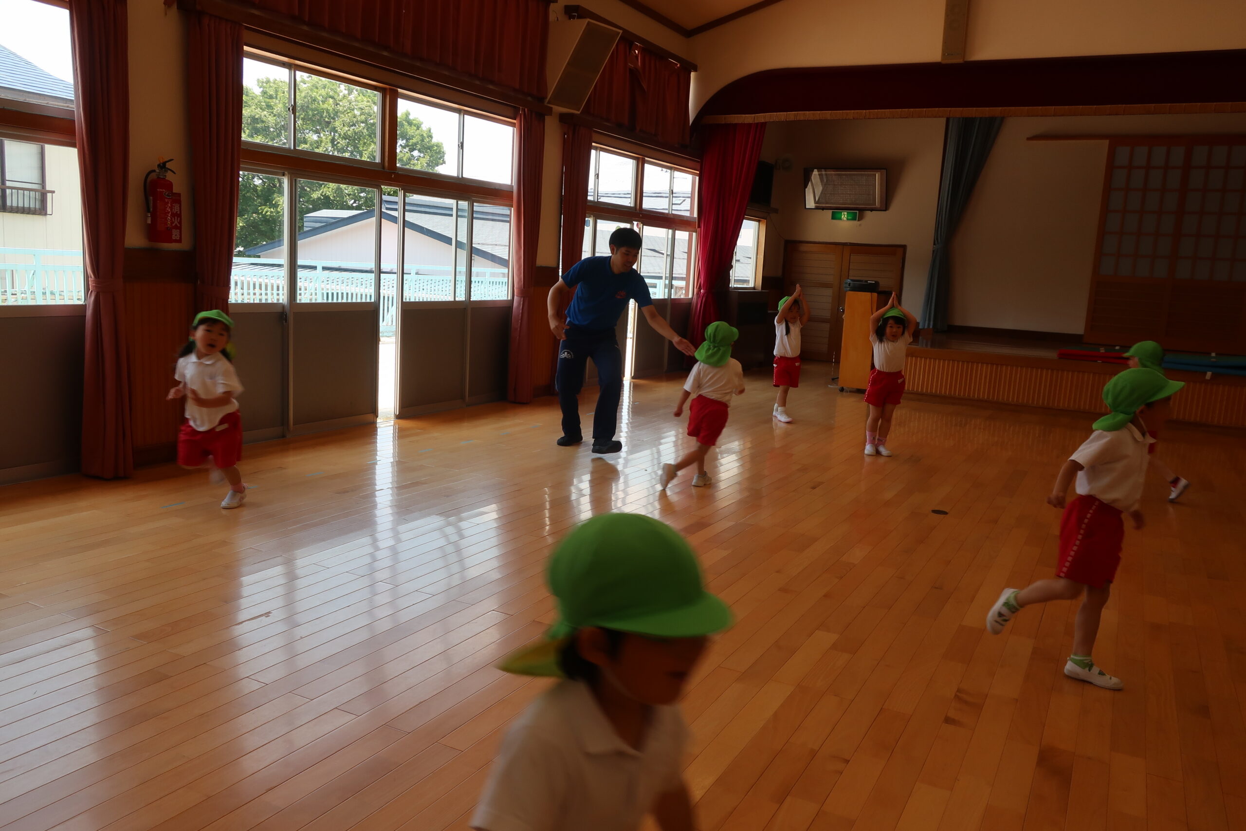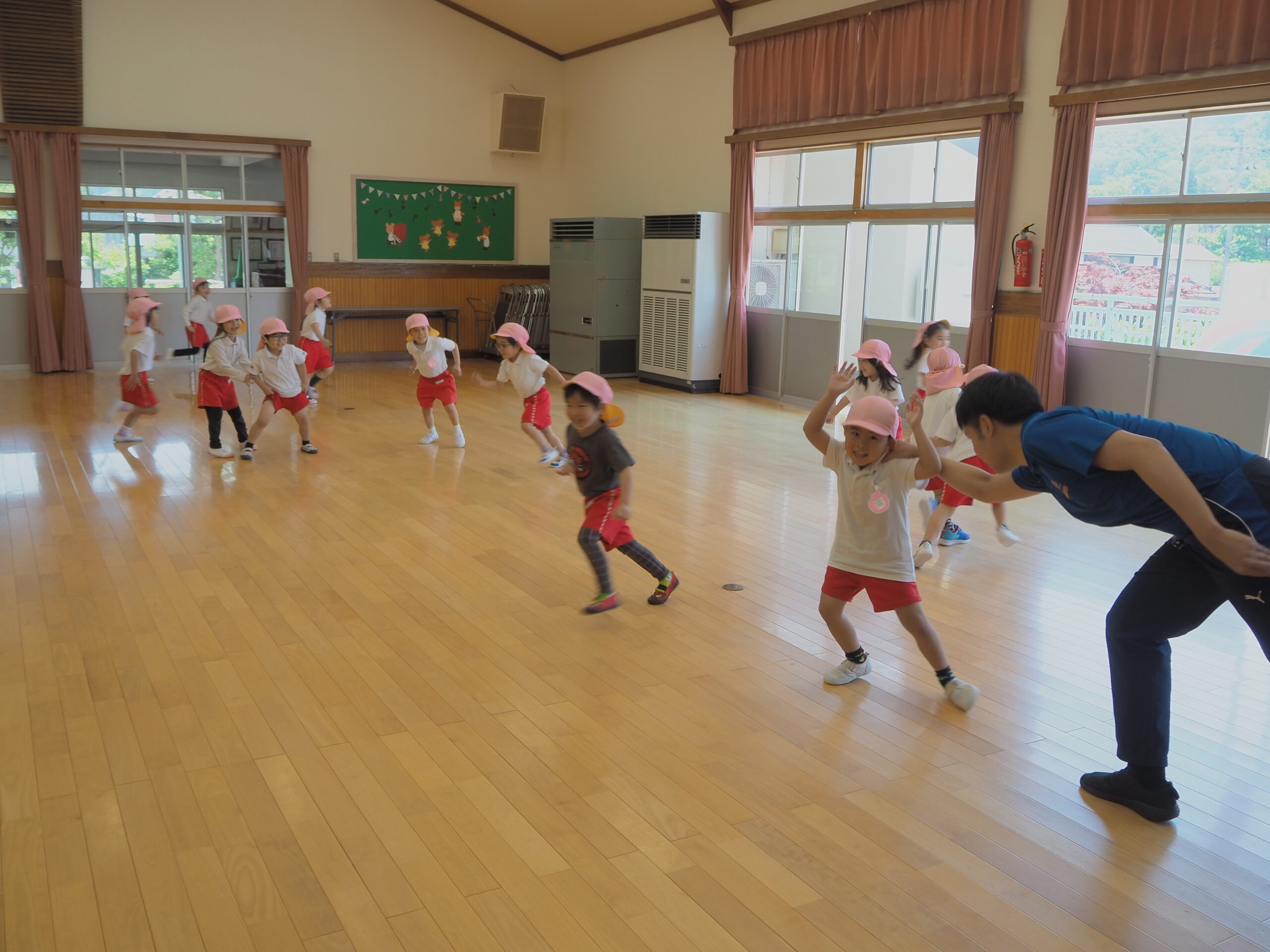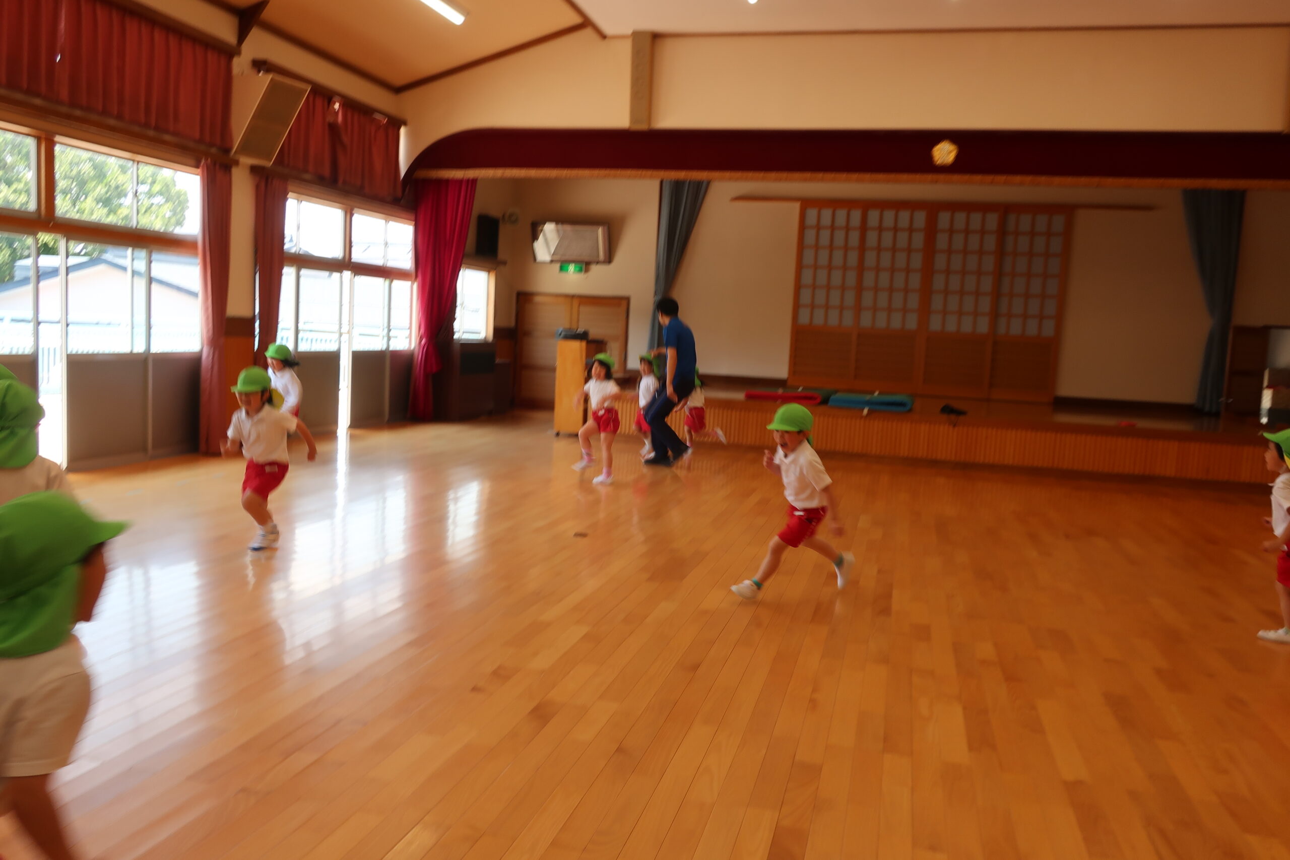まずは、前のお友達を追い越さないように走り、後藤先生の「だるまさんが~こ~ろんだ!」の声を聞いて子ども達は“ピタッ!!”と止まったり「プシュ~」の声に合わせてしゃがんだりと後藤先生が次にどんな言葉を言うのかワクワクしながら動いたり止まったりしていました。