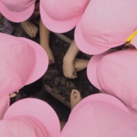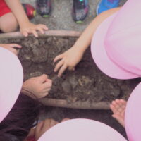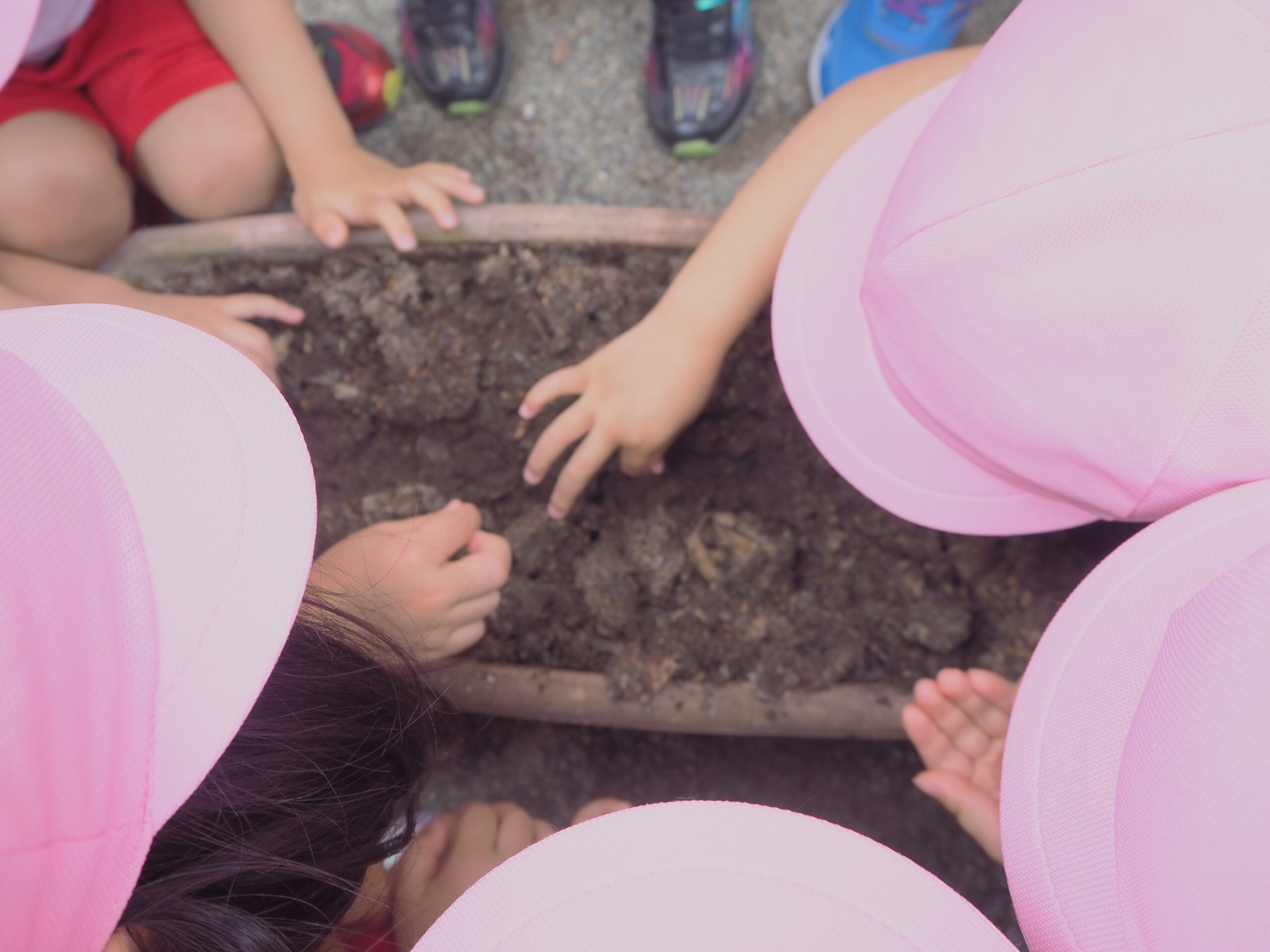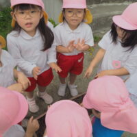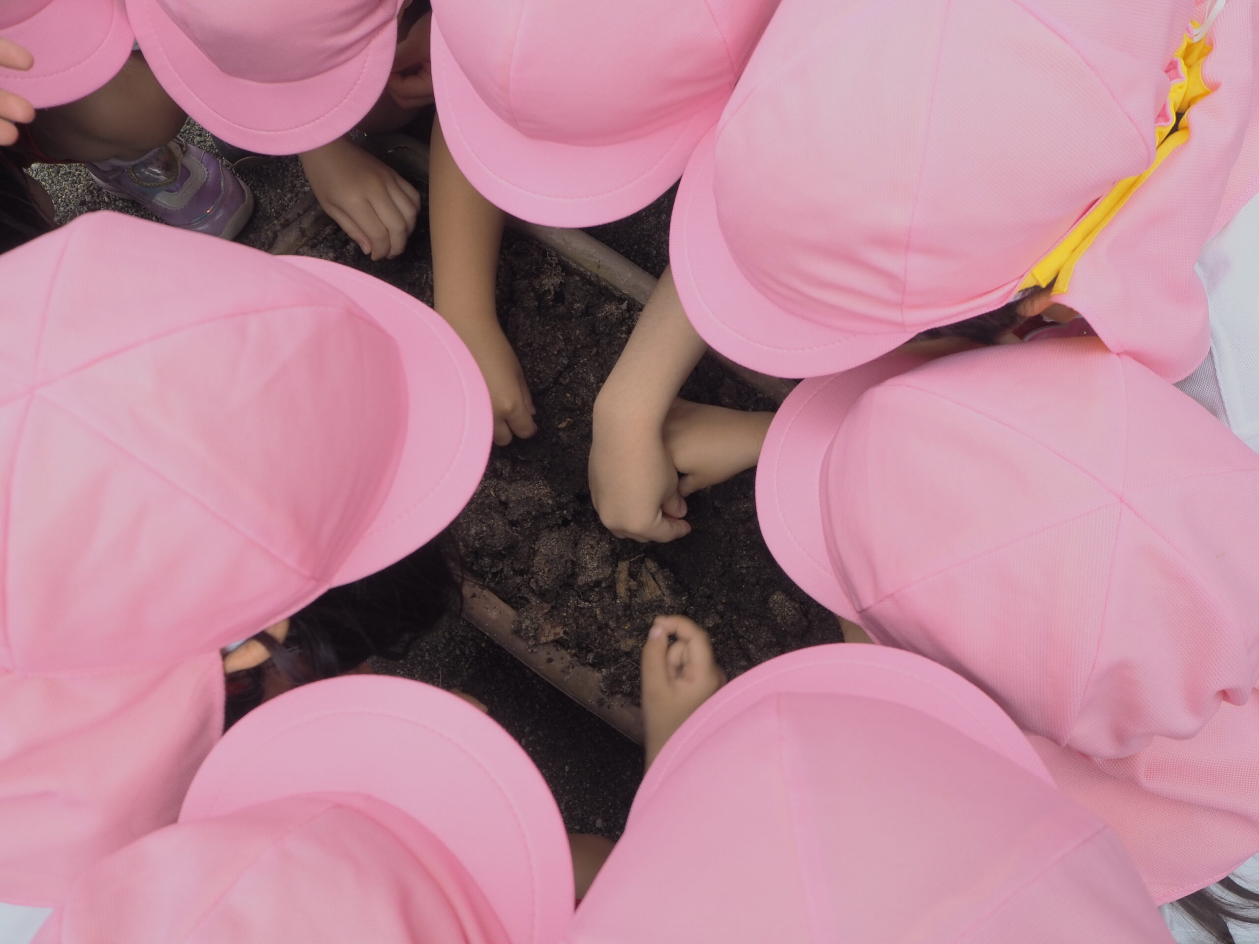 園庭に出て、一人ひとりに種を配ると「小さ~い!」「石みたい!」といった声が聞こえ、種を無くさないように大切に持っていました。