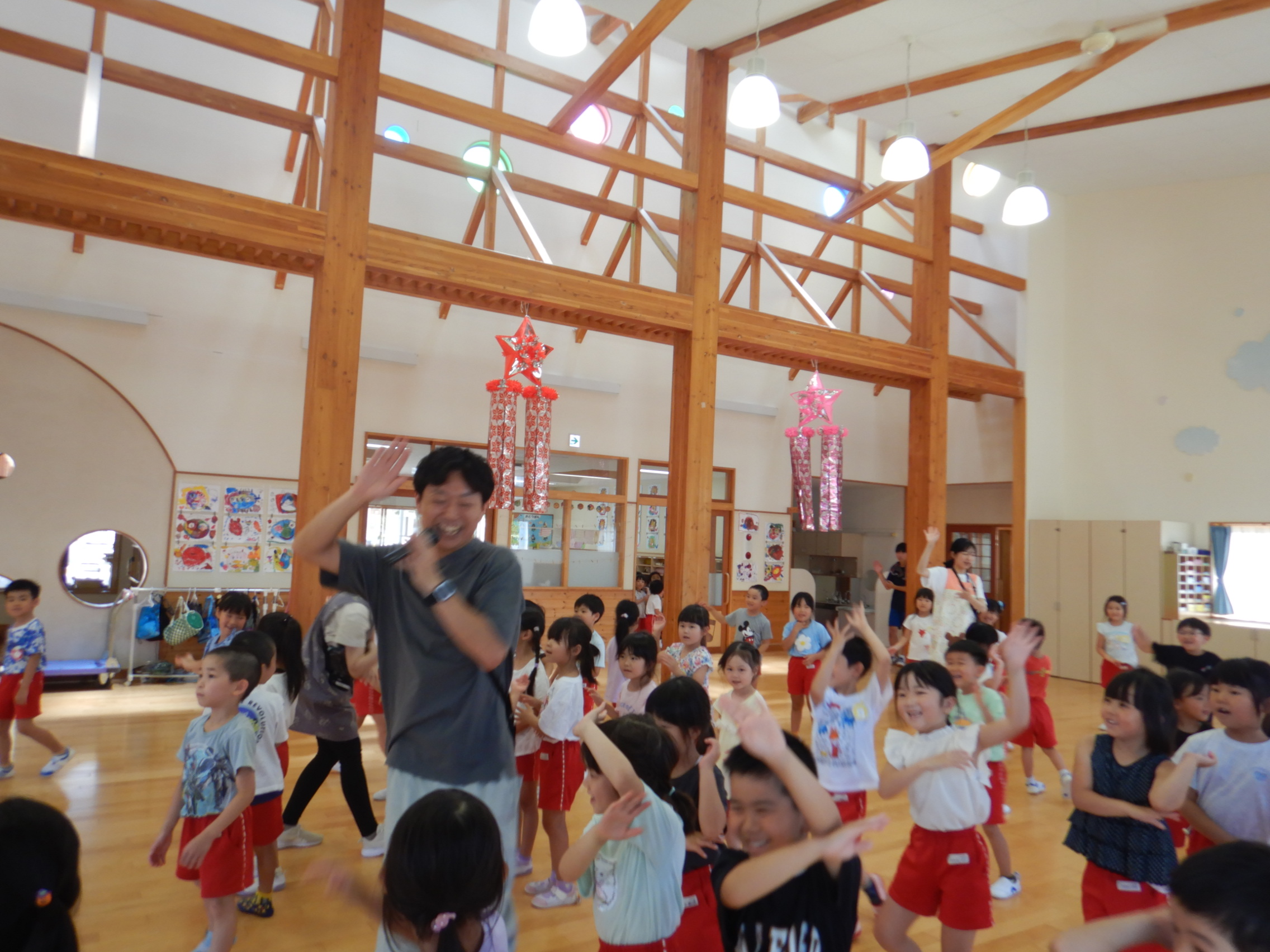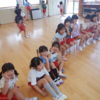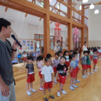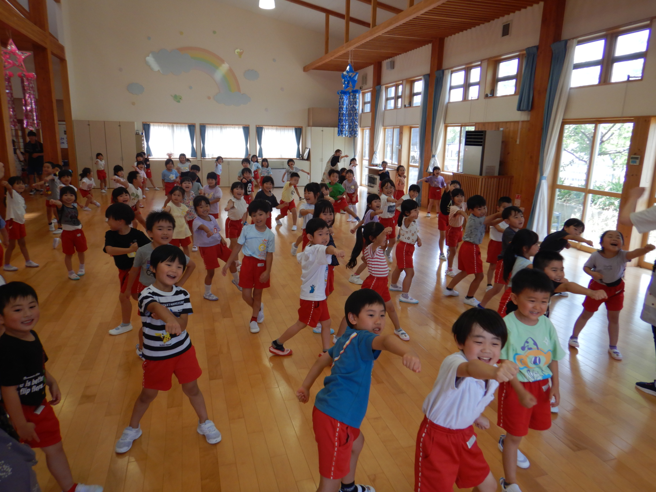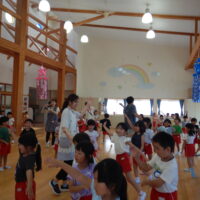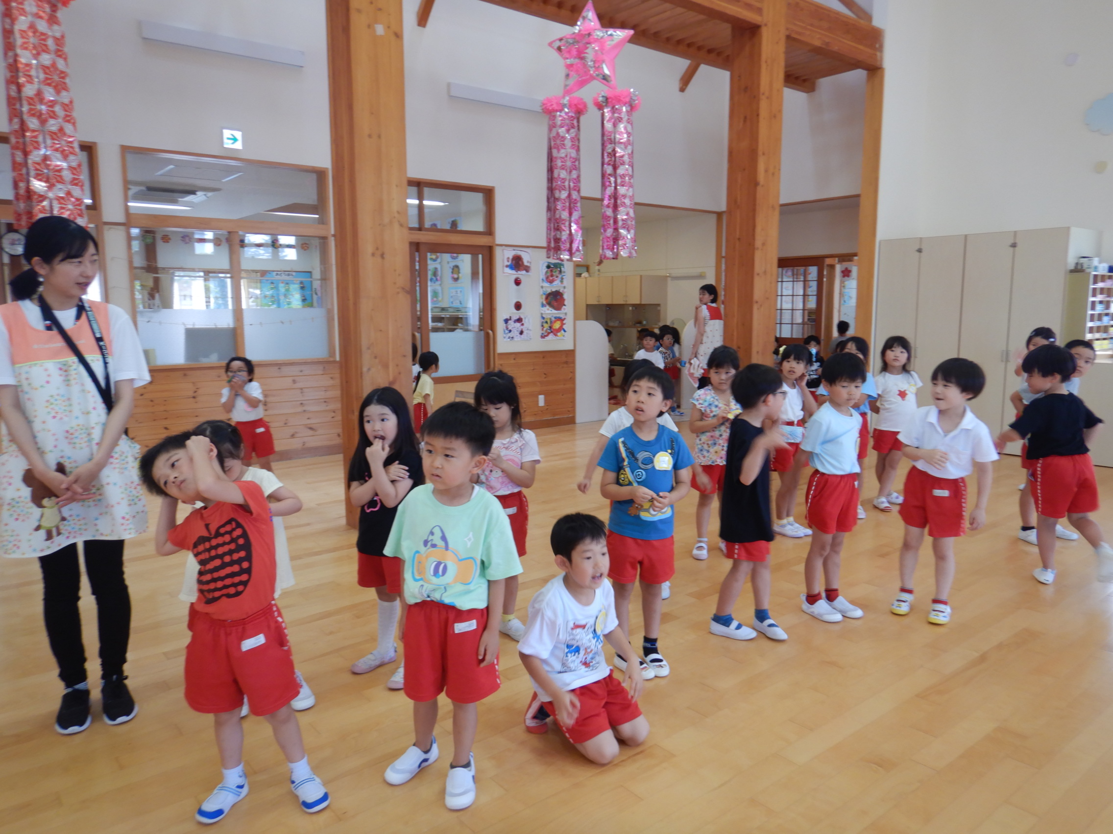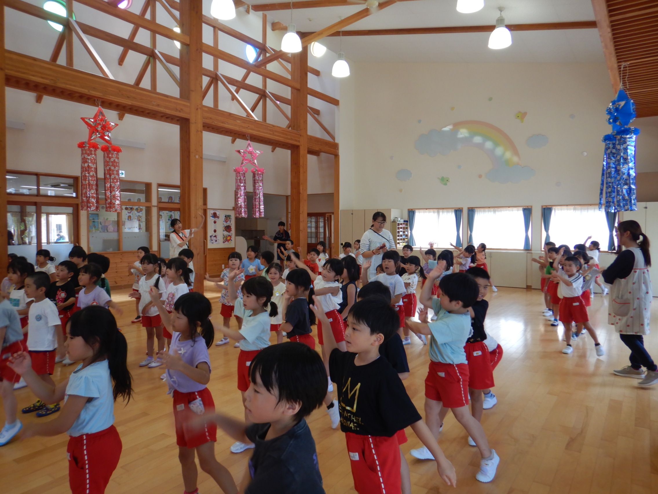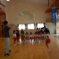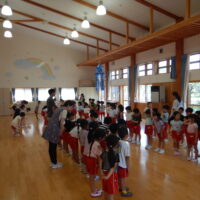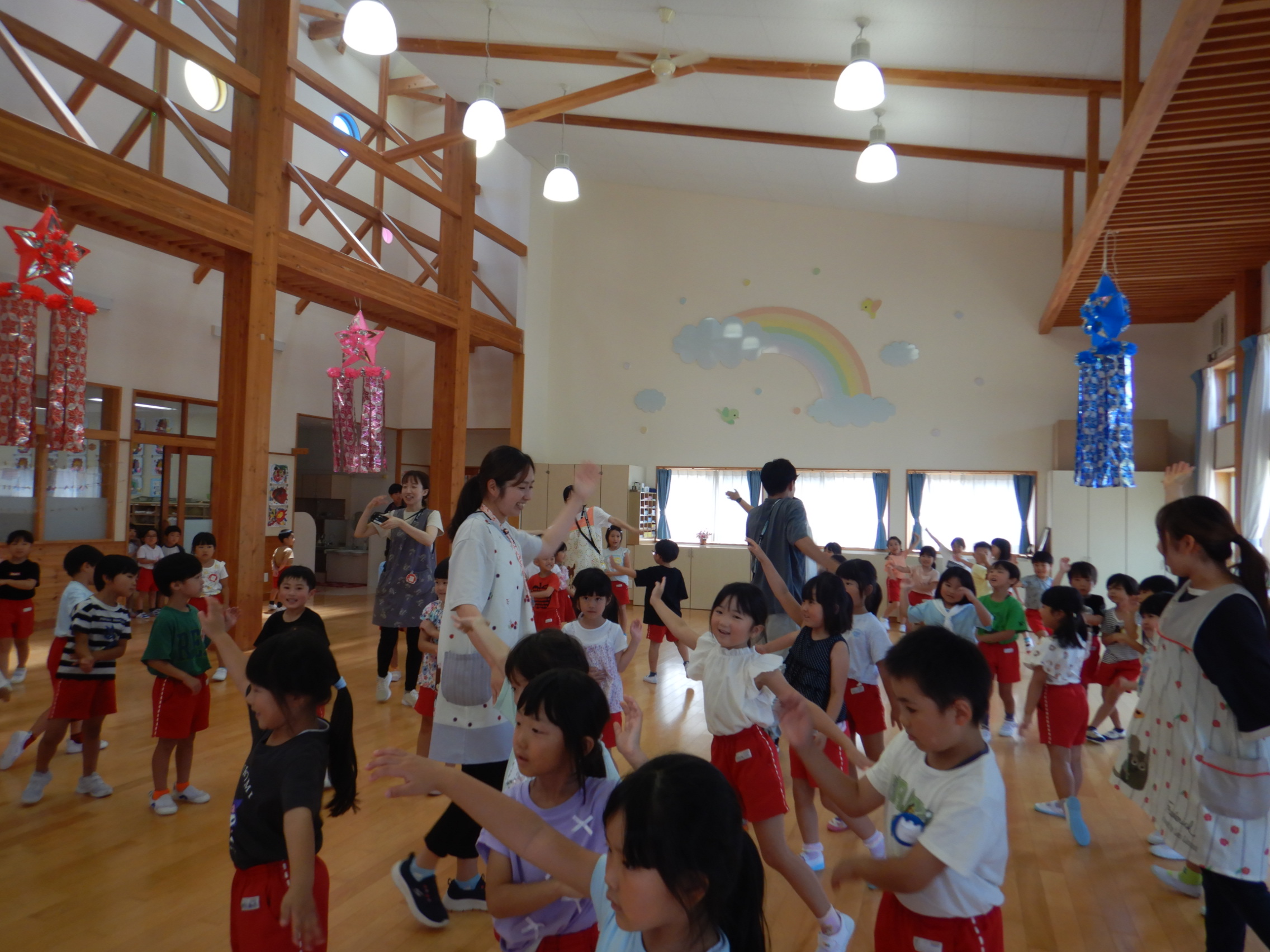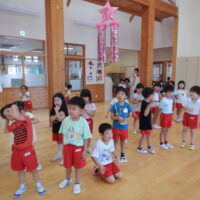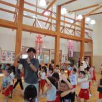 ホールでのお集まりではそれぞれの年長組の先生のお名前を聞いたり、夕涼み会に向けて一緒に盆踊りを踊ったりして楽しいひと時を過ごしました☺️