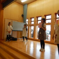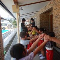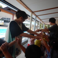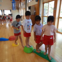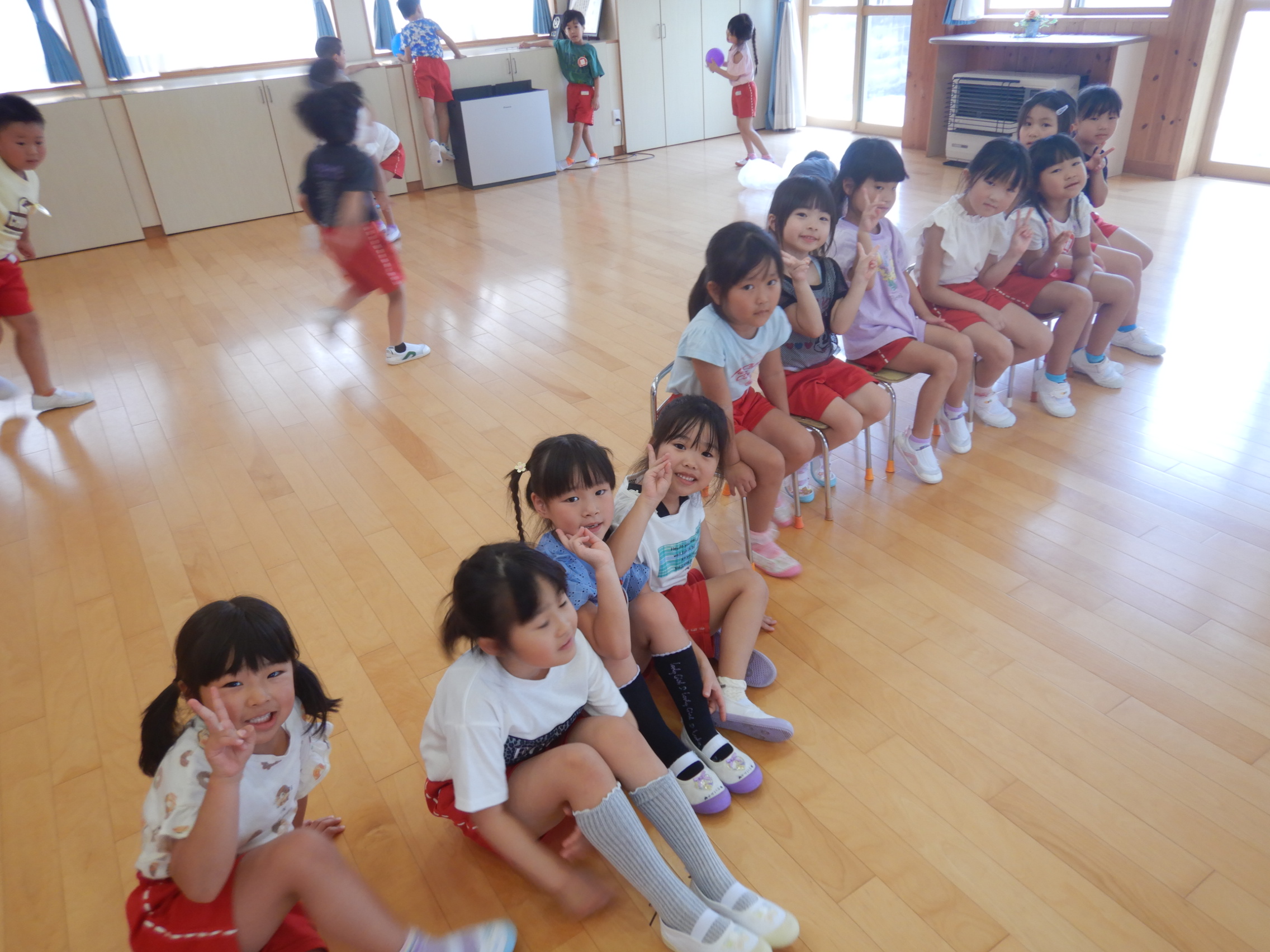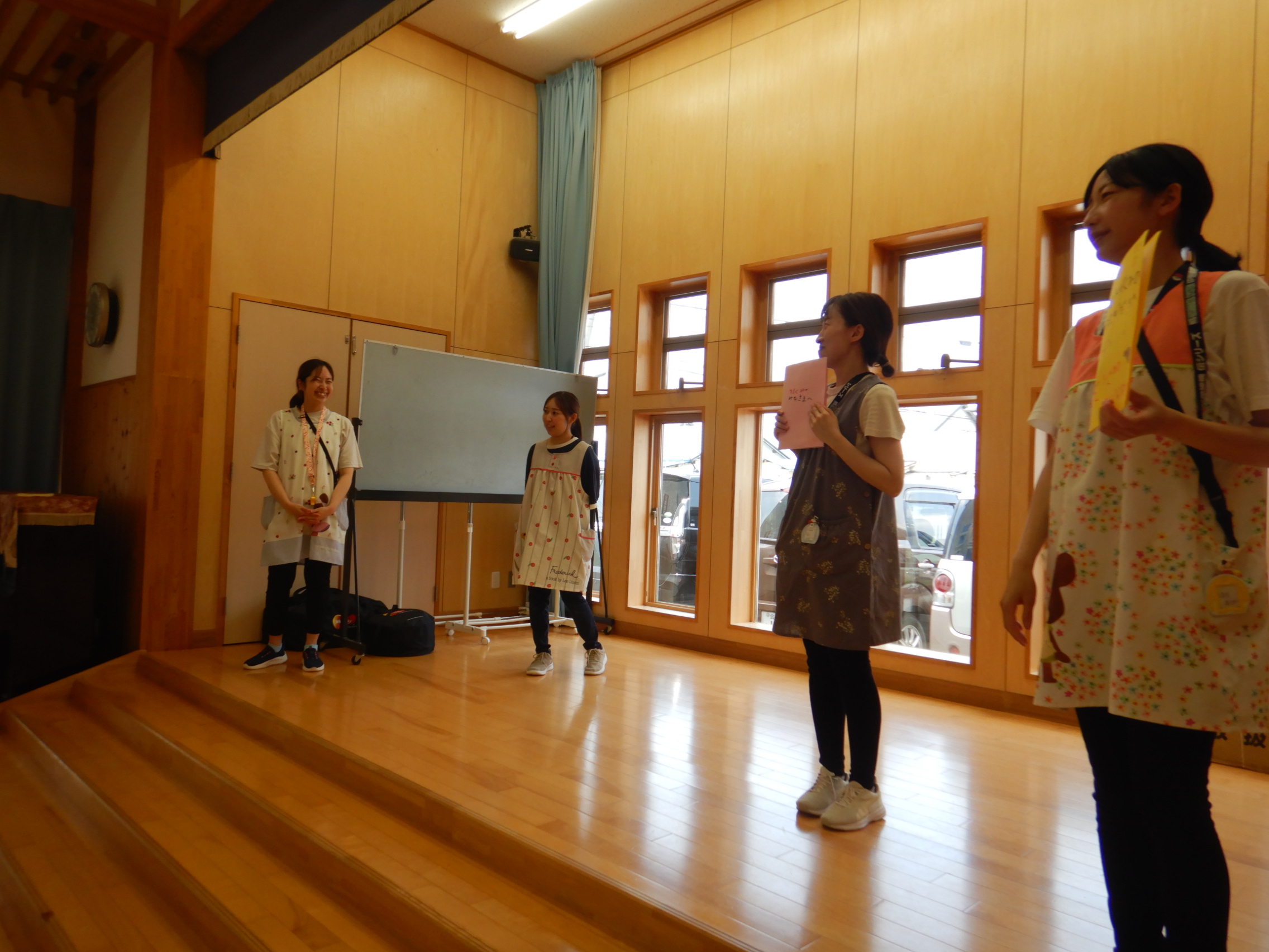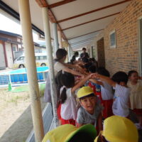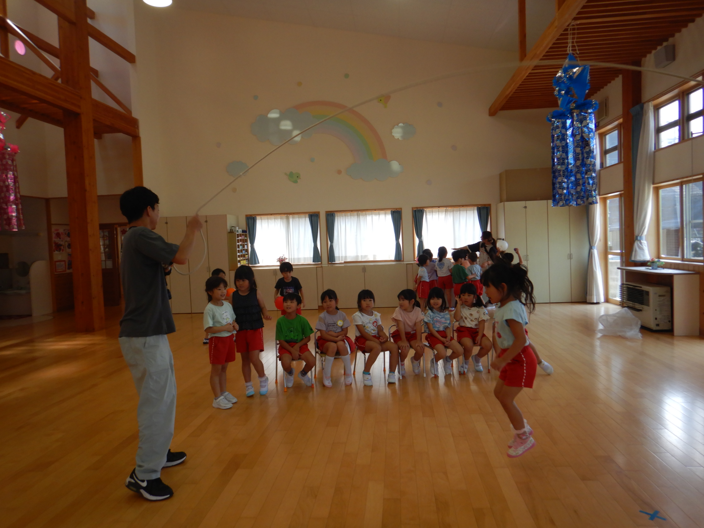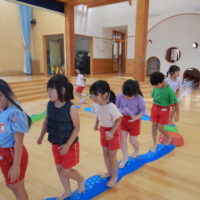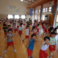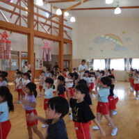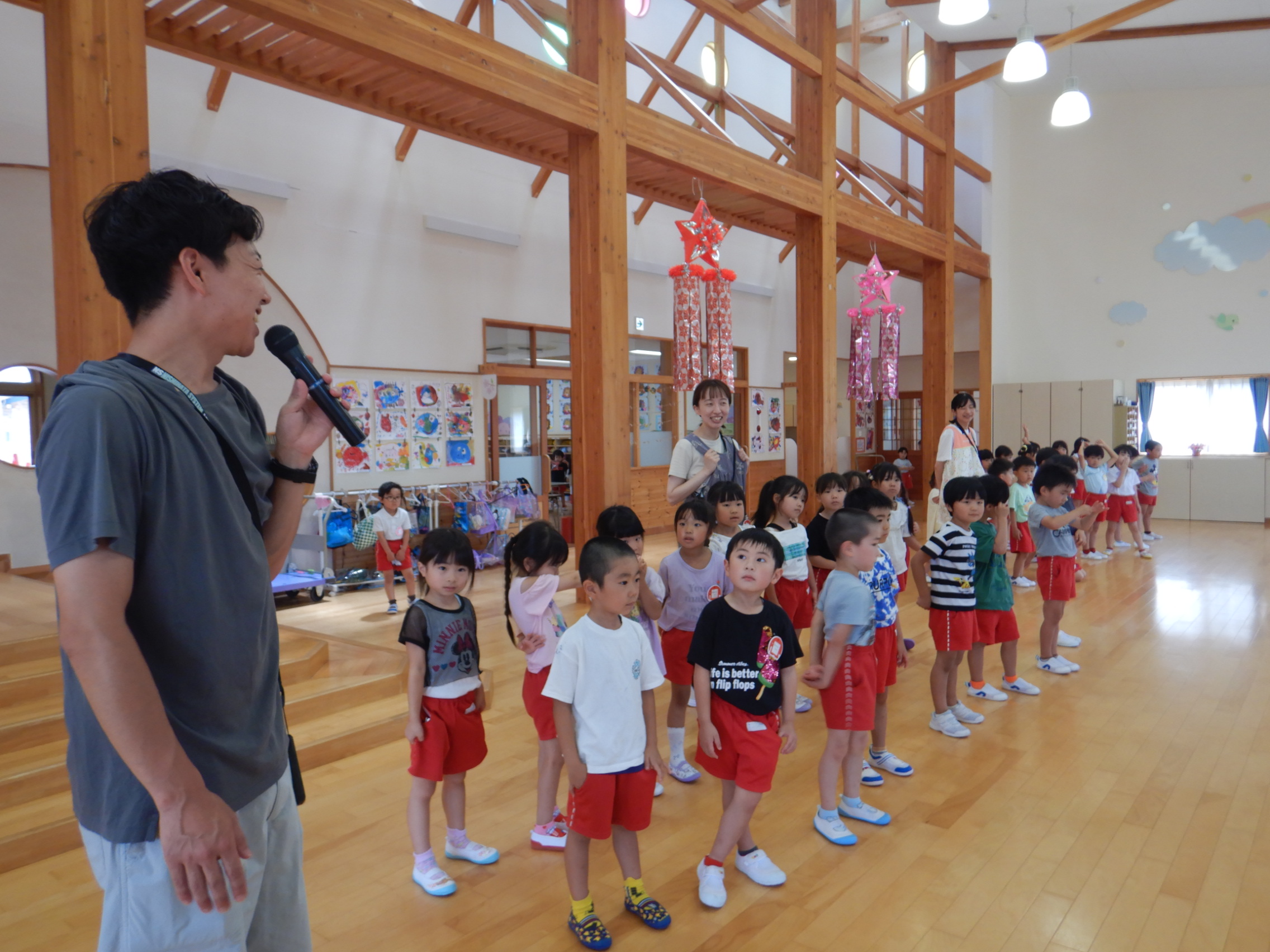 ホールでのお集まりではそれぞれの年長組の先生のお名前を聞いたり、夕涼み会に向けて一緒に盆踊りを踊ったりして楽しいひと時を過ごしました☺️