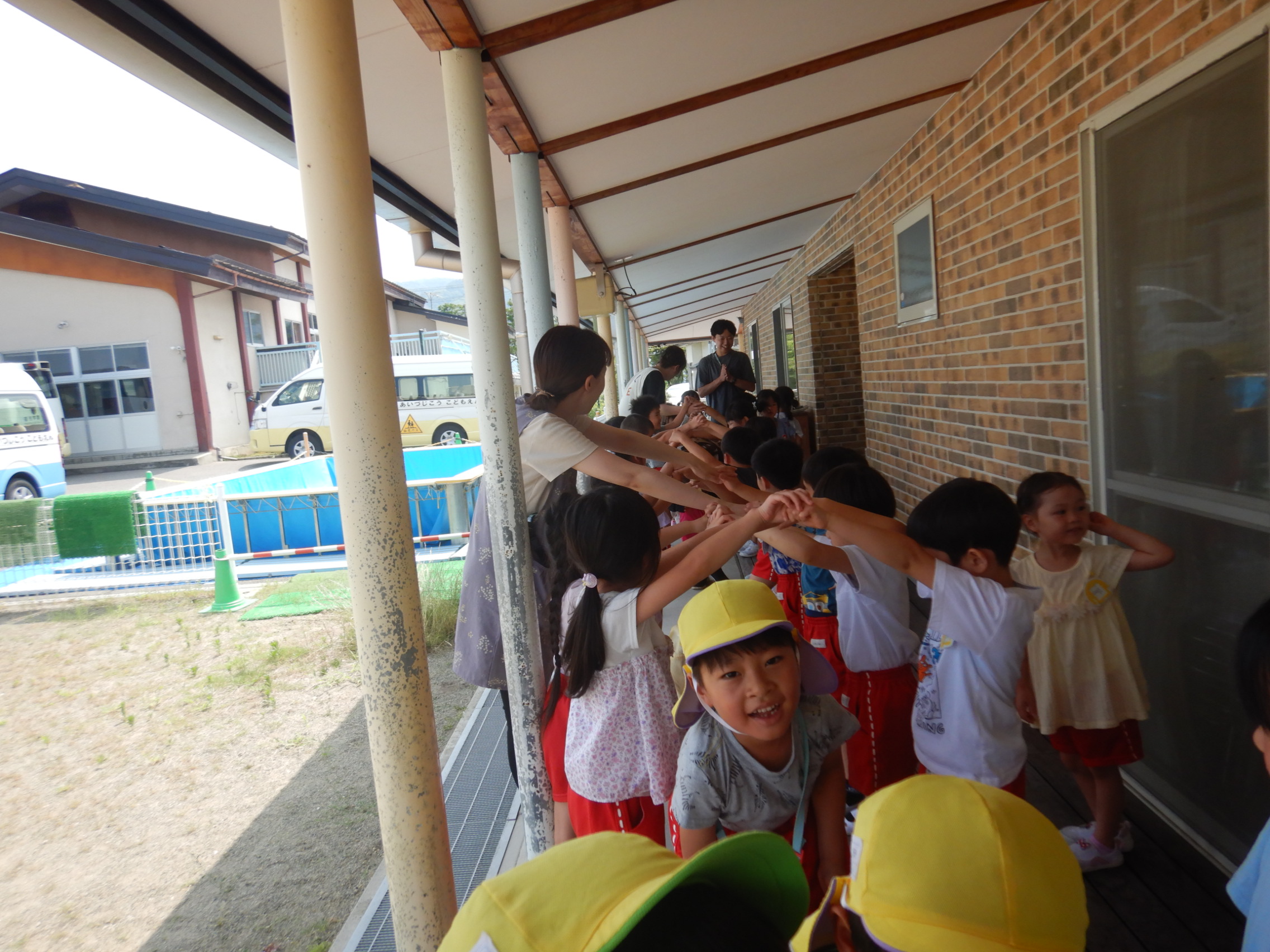 第二こども園のみんなを乗せたバス🚌が到着すると、“待ってました~!!”と言わんばかりの表情でテラスへお出迎え😊