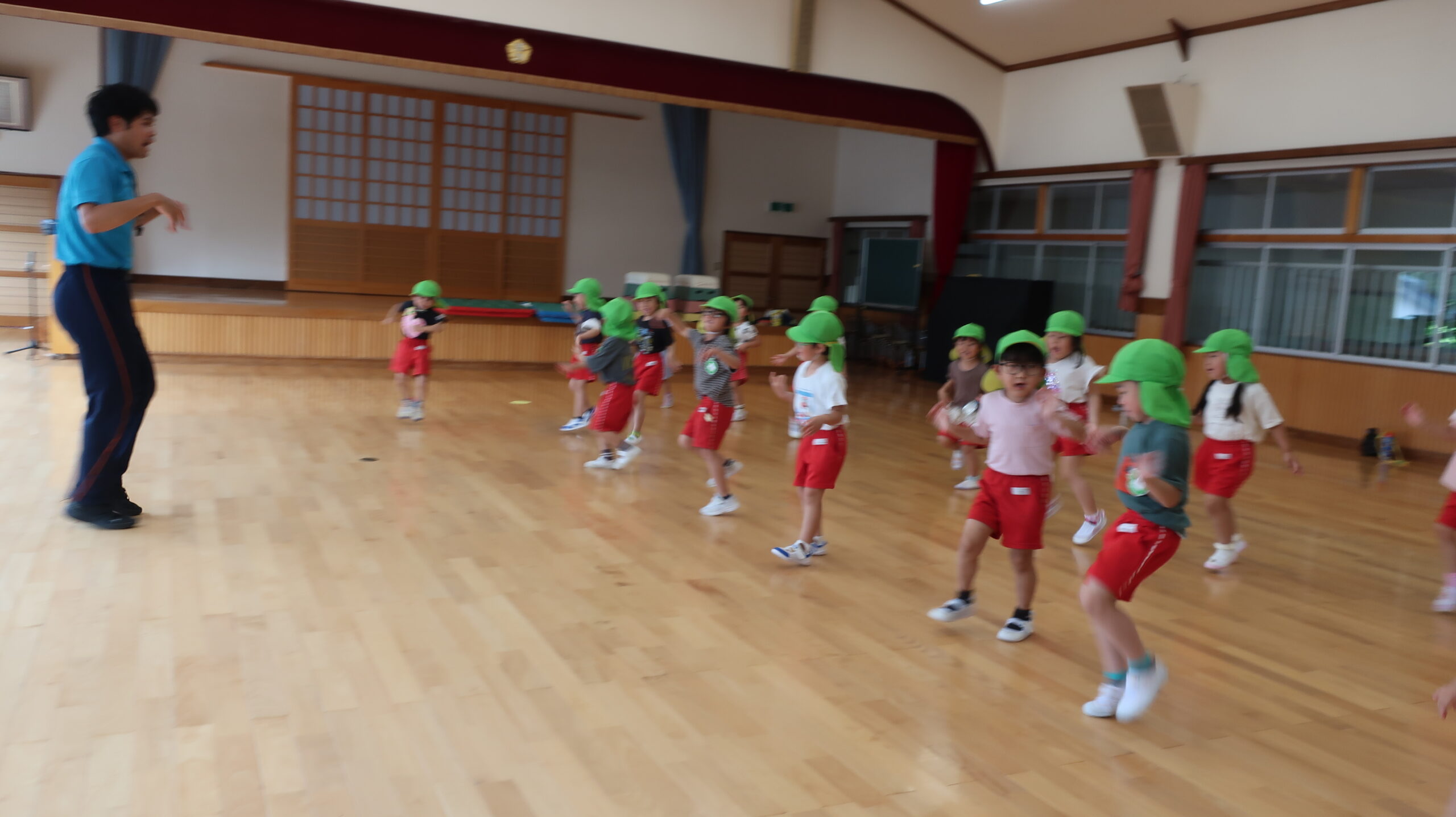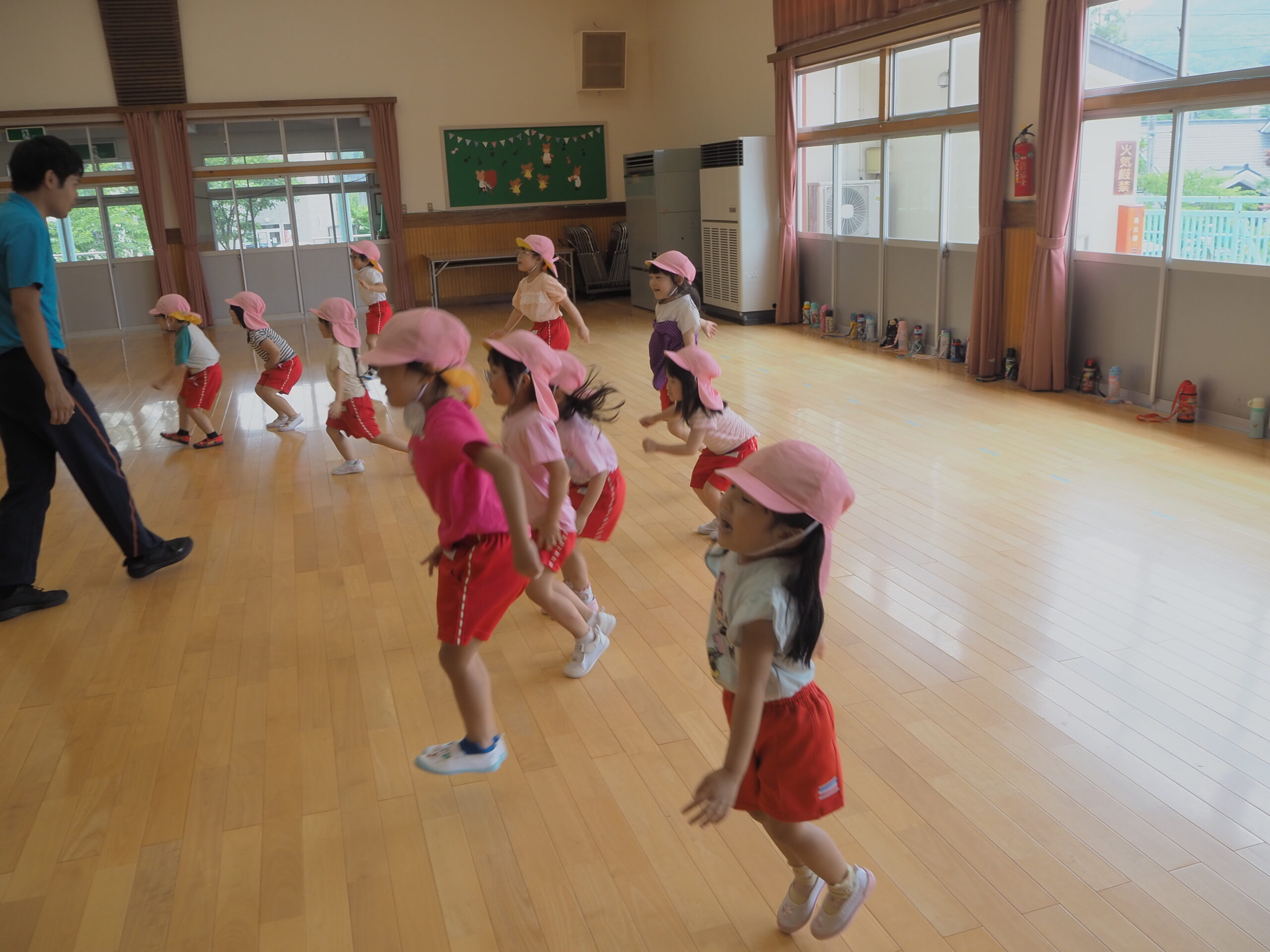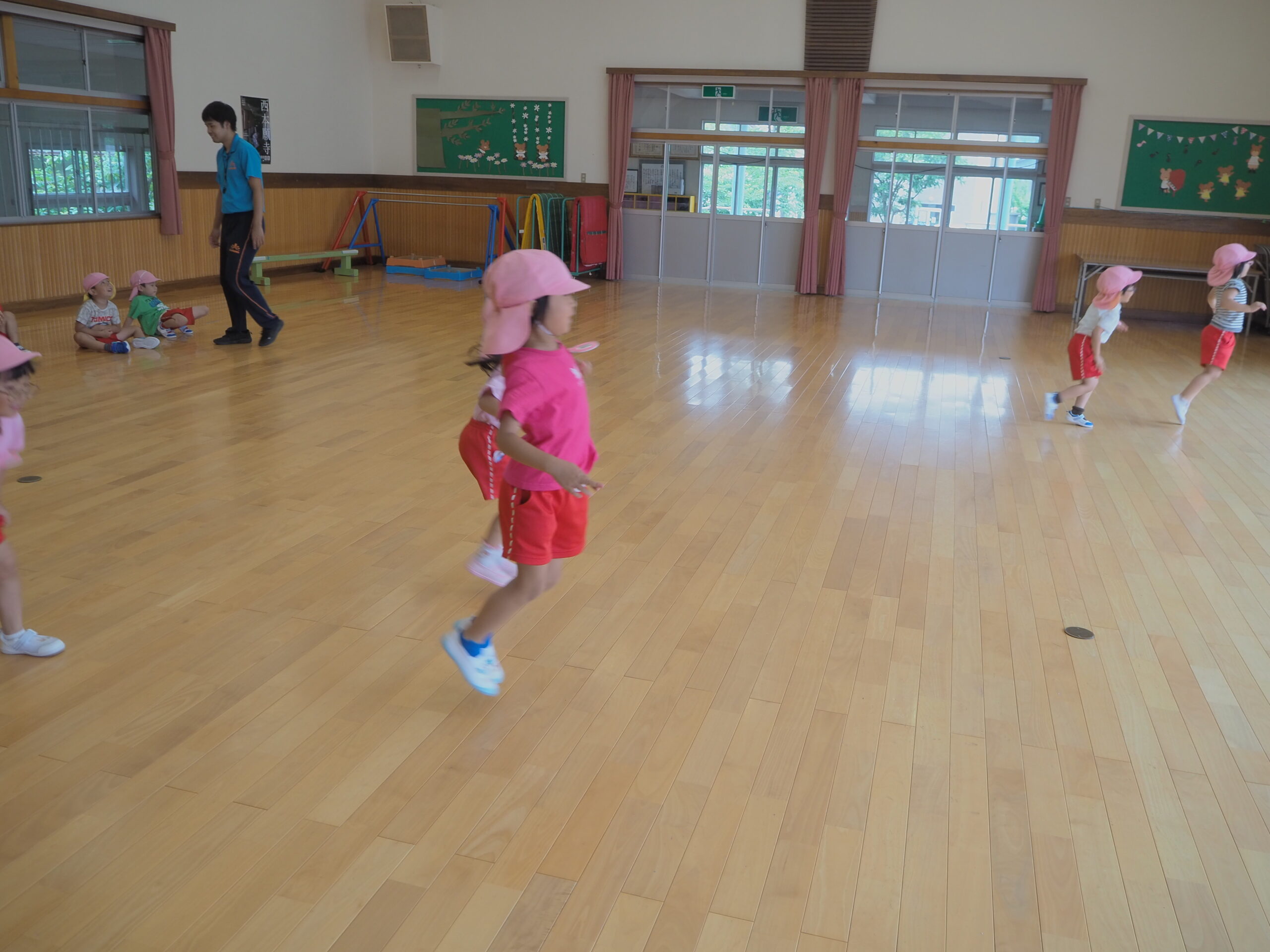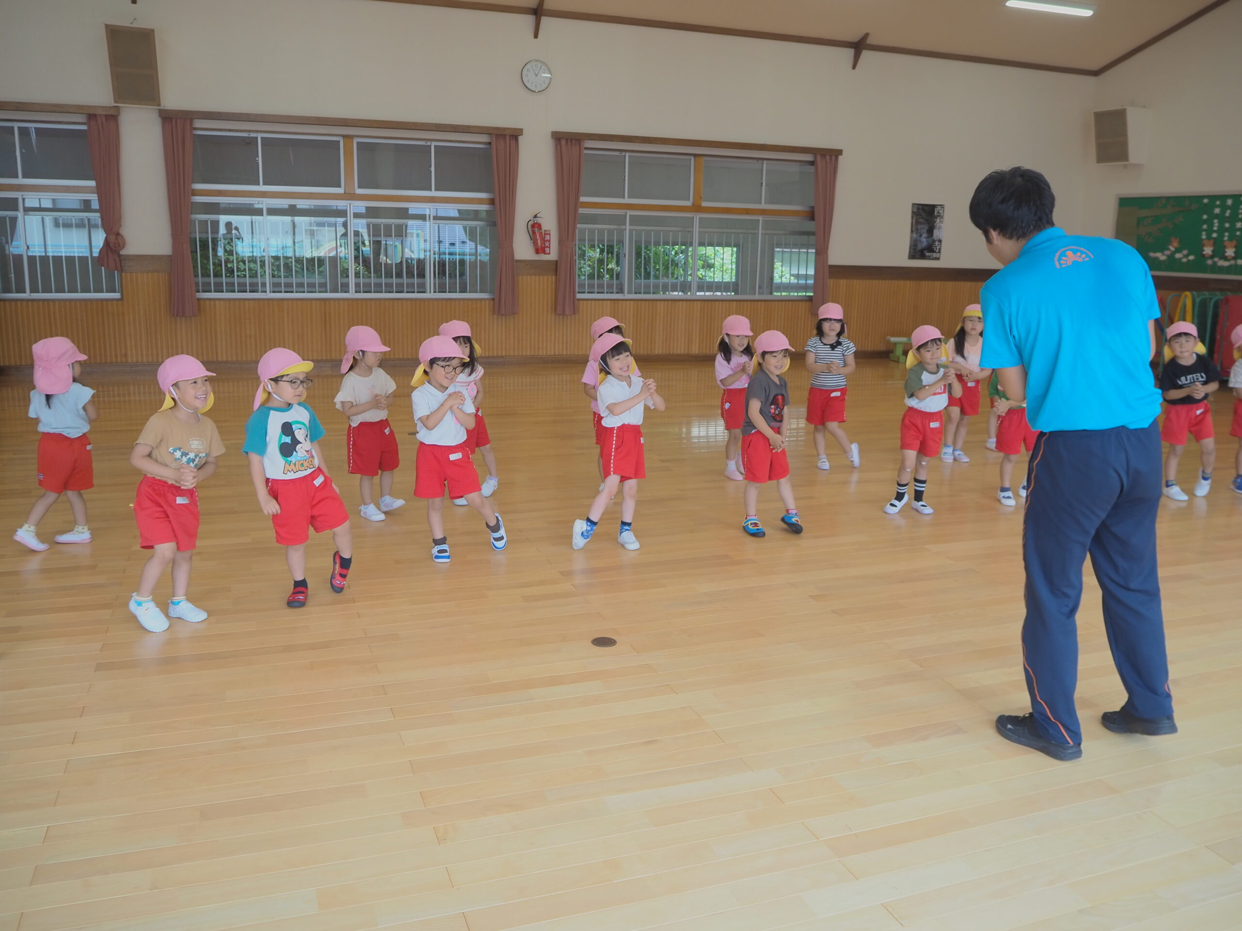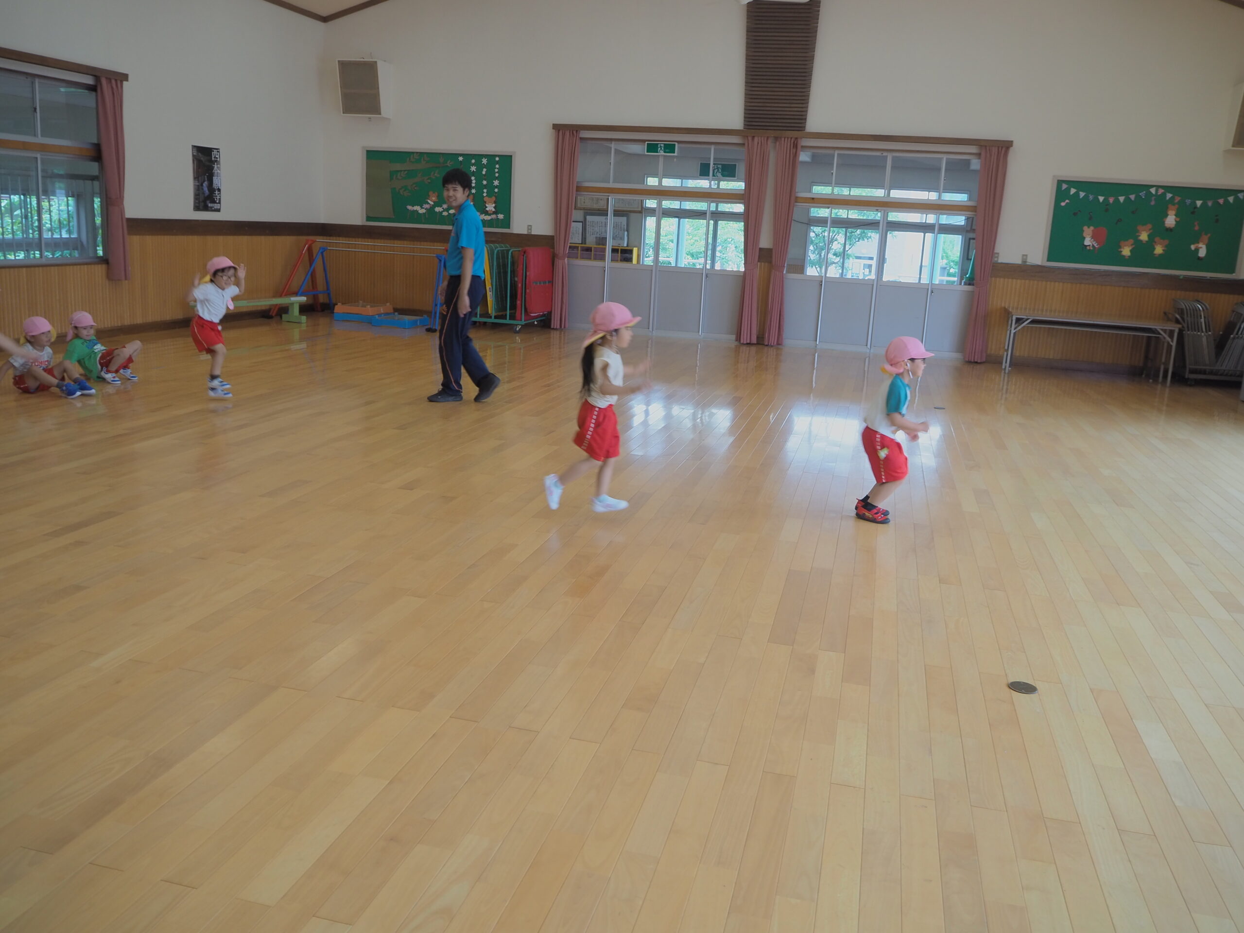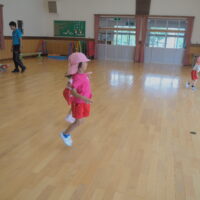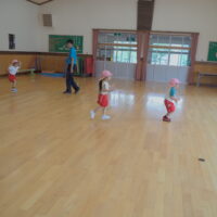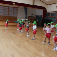 元気に朝の挨拶をしてから体育館の中を歩いたりスキップやカニ歩きをして準備運動をしました😊