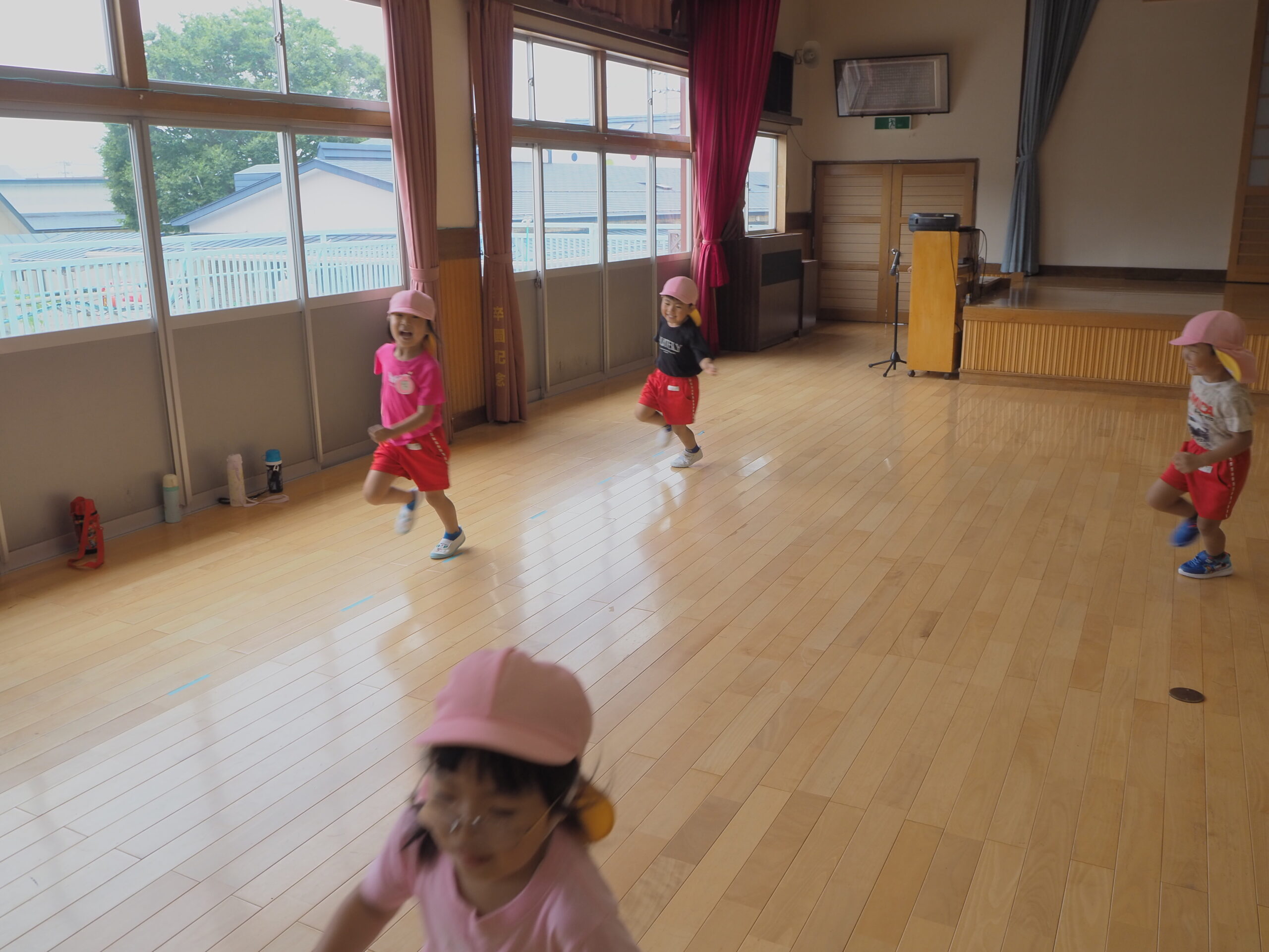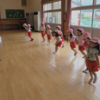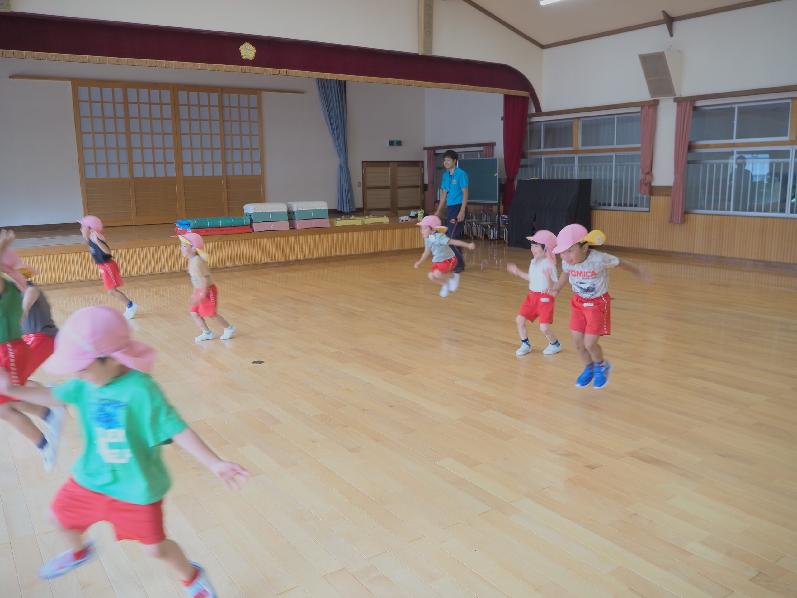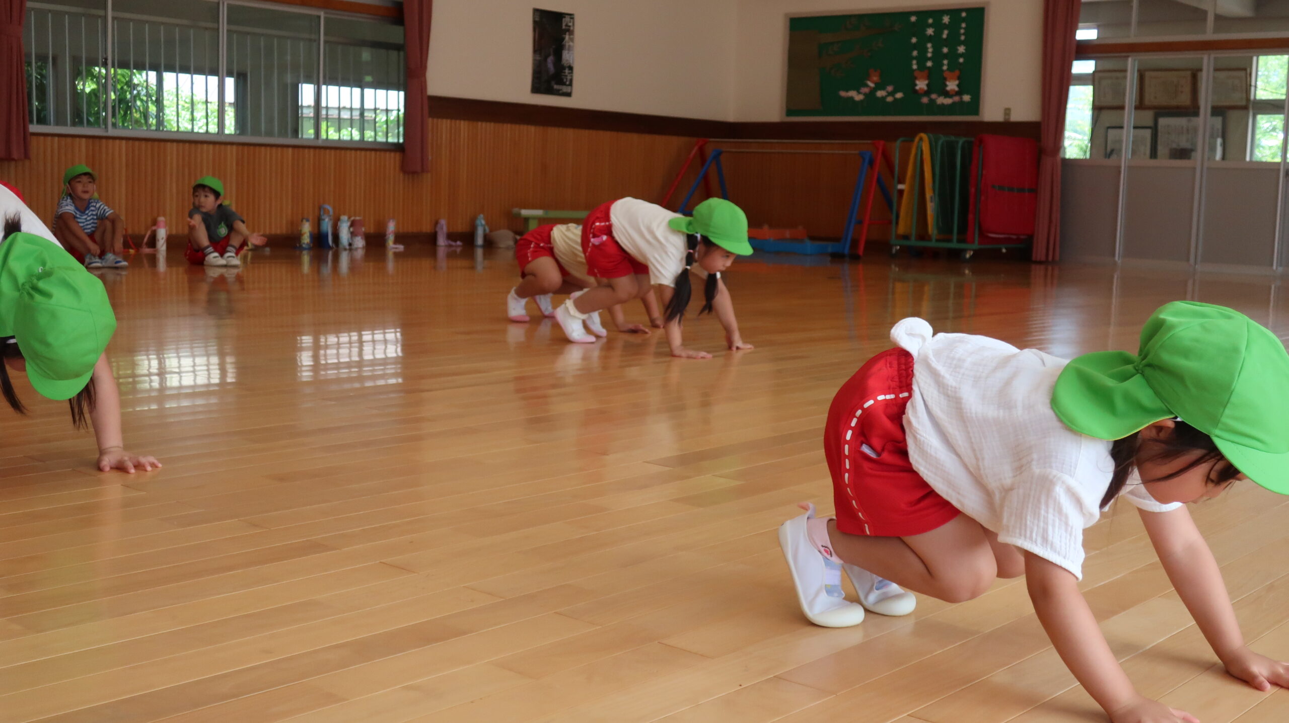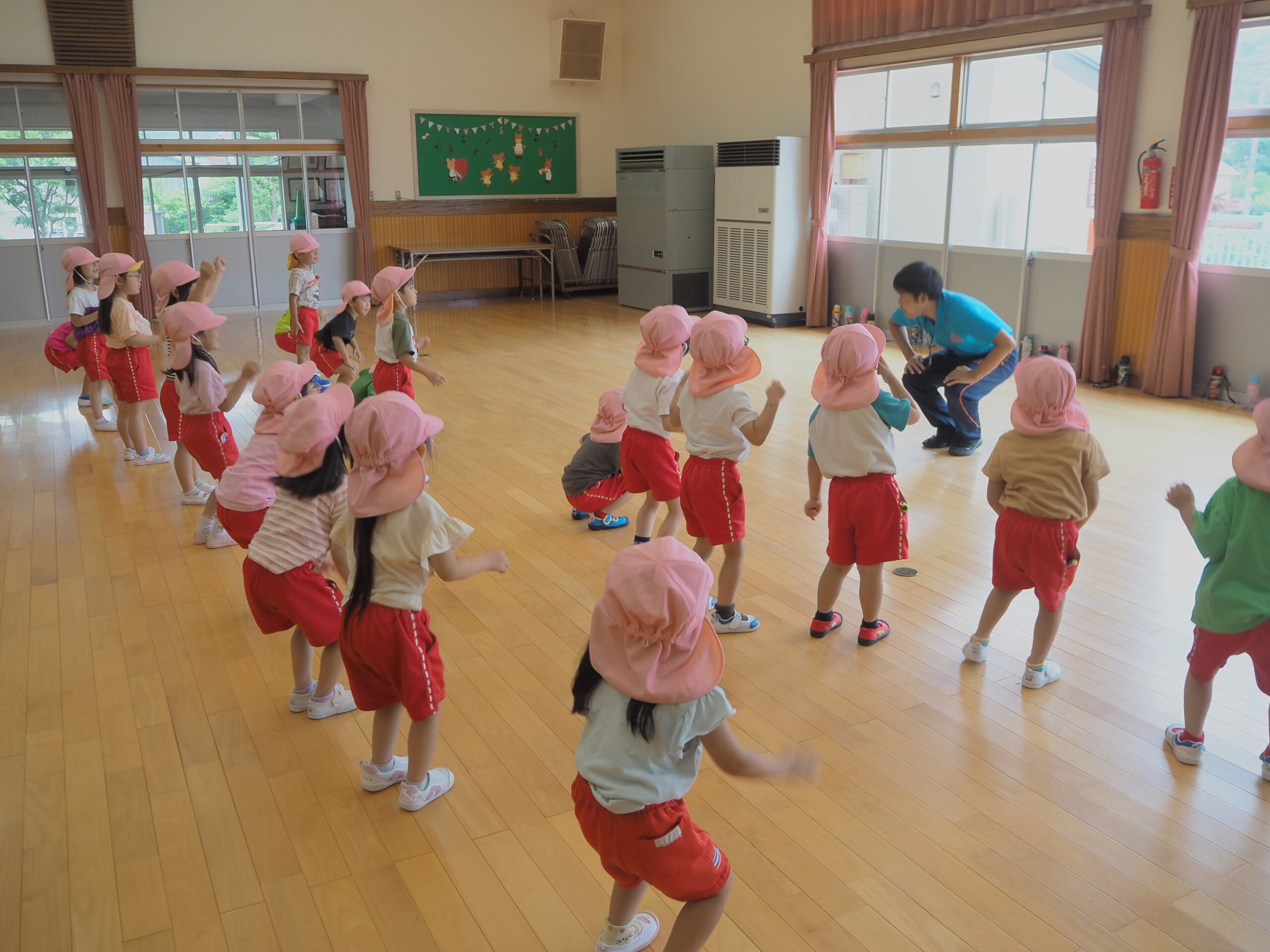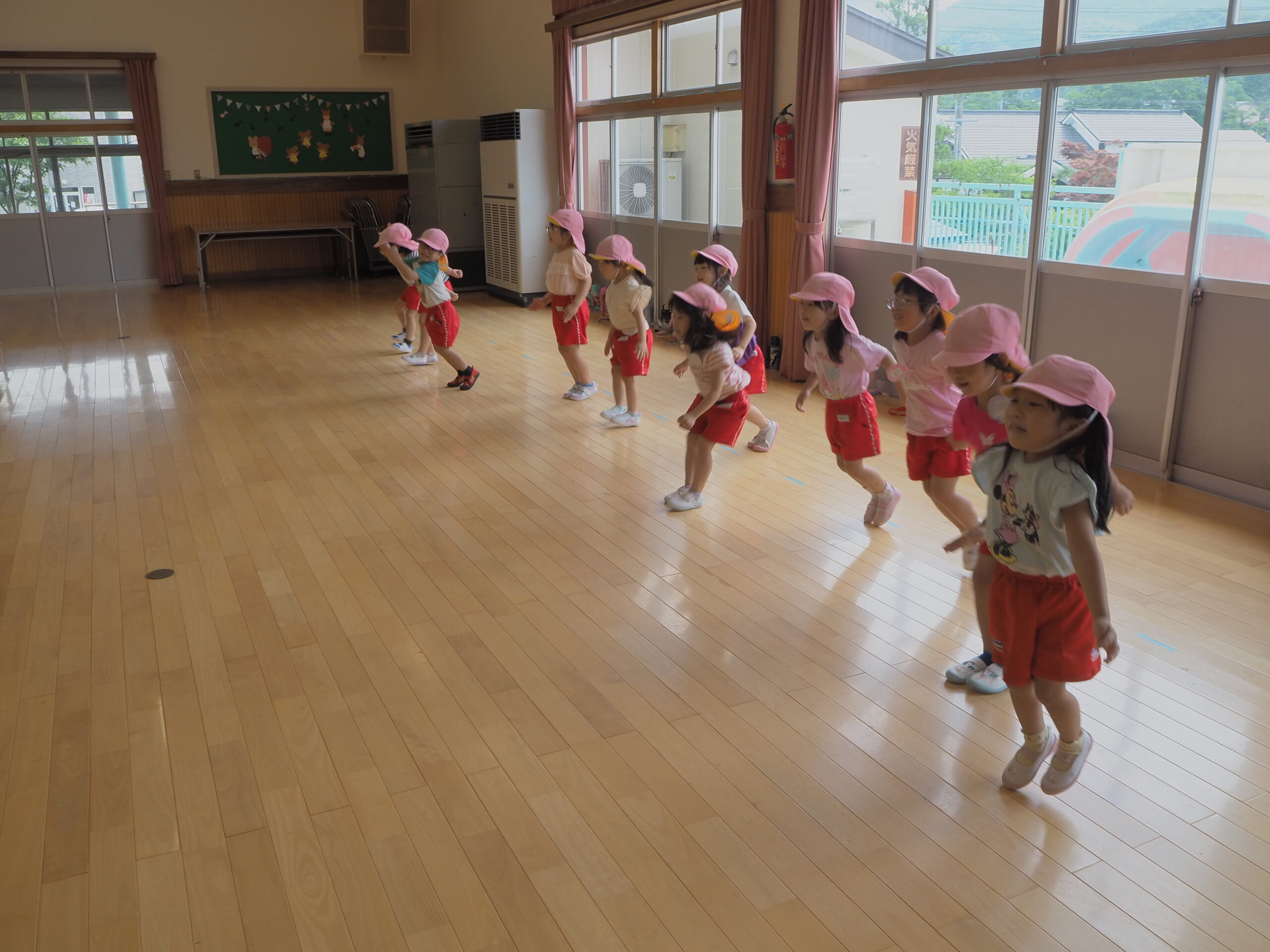 元気に朝の挨拶をしてから体育館の中を歩いたりスキップやカニ歩きをして準備運動をしました😊