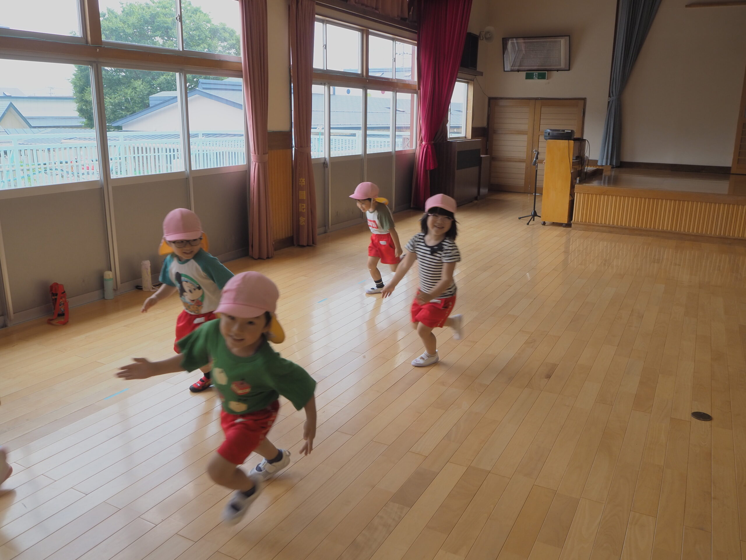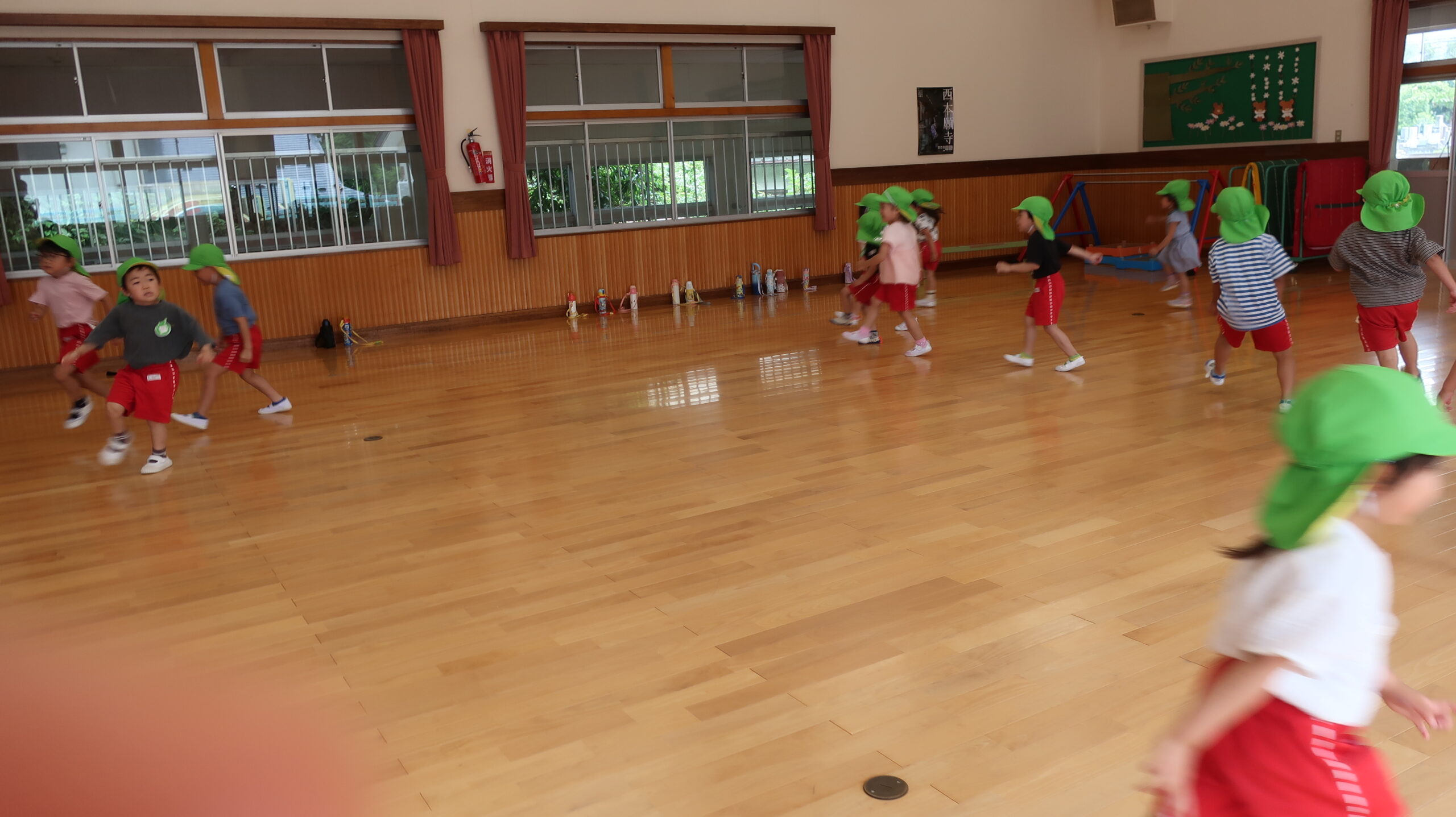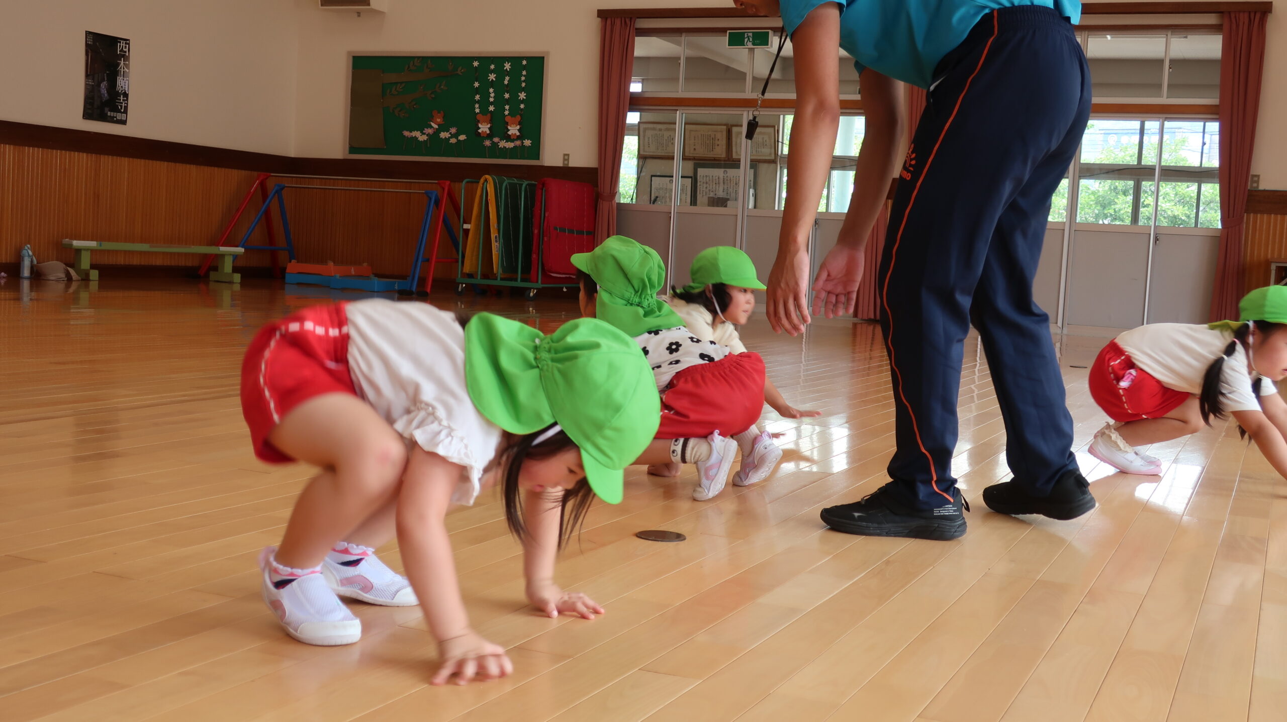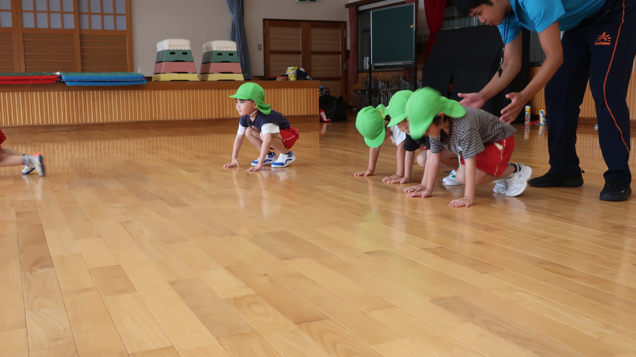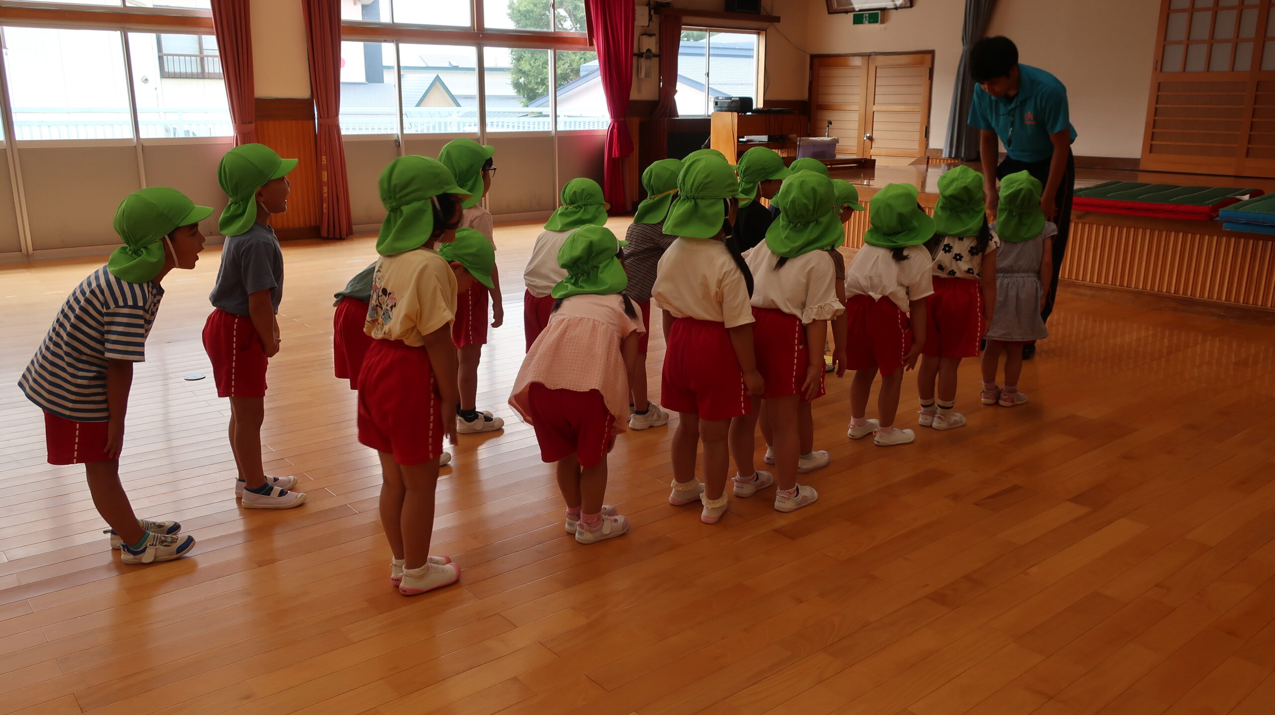 元気に朝の挨拶をしてから体育館の中を歩いたりスキップやカニ歩きをして準備運動をしました😊