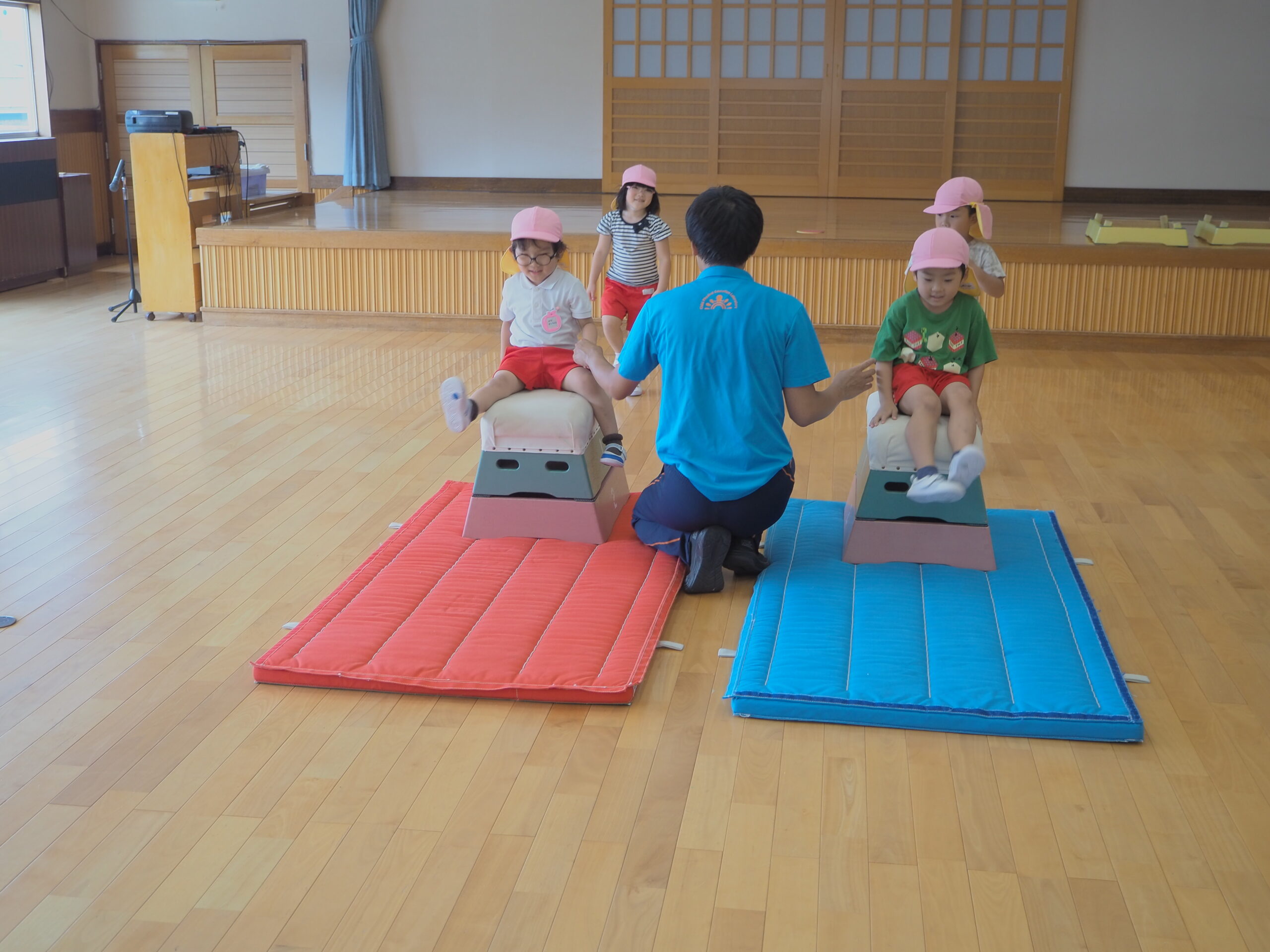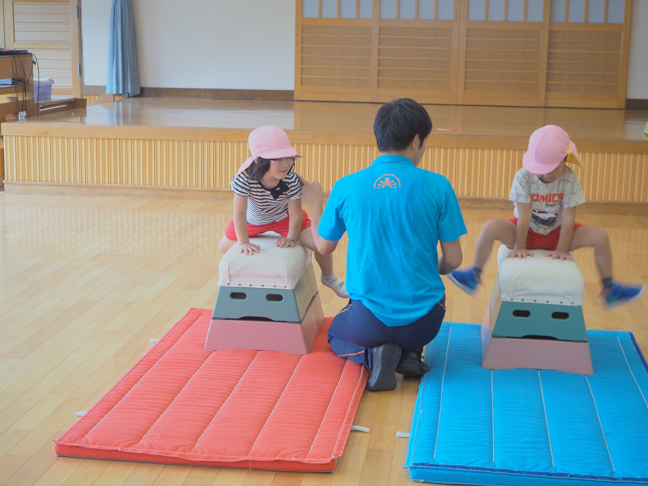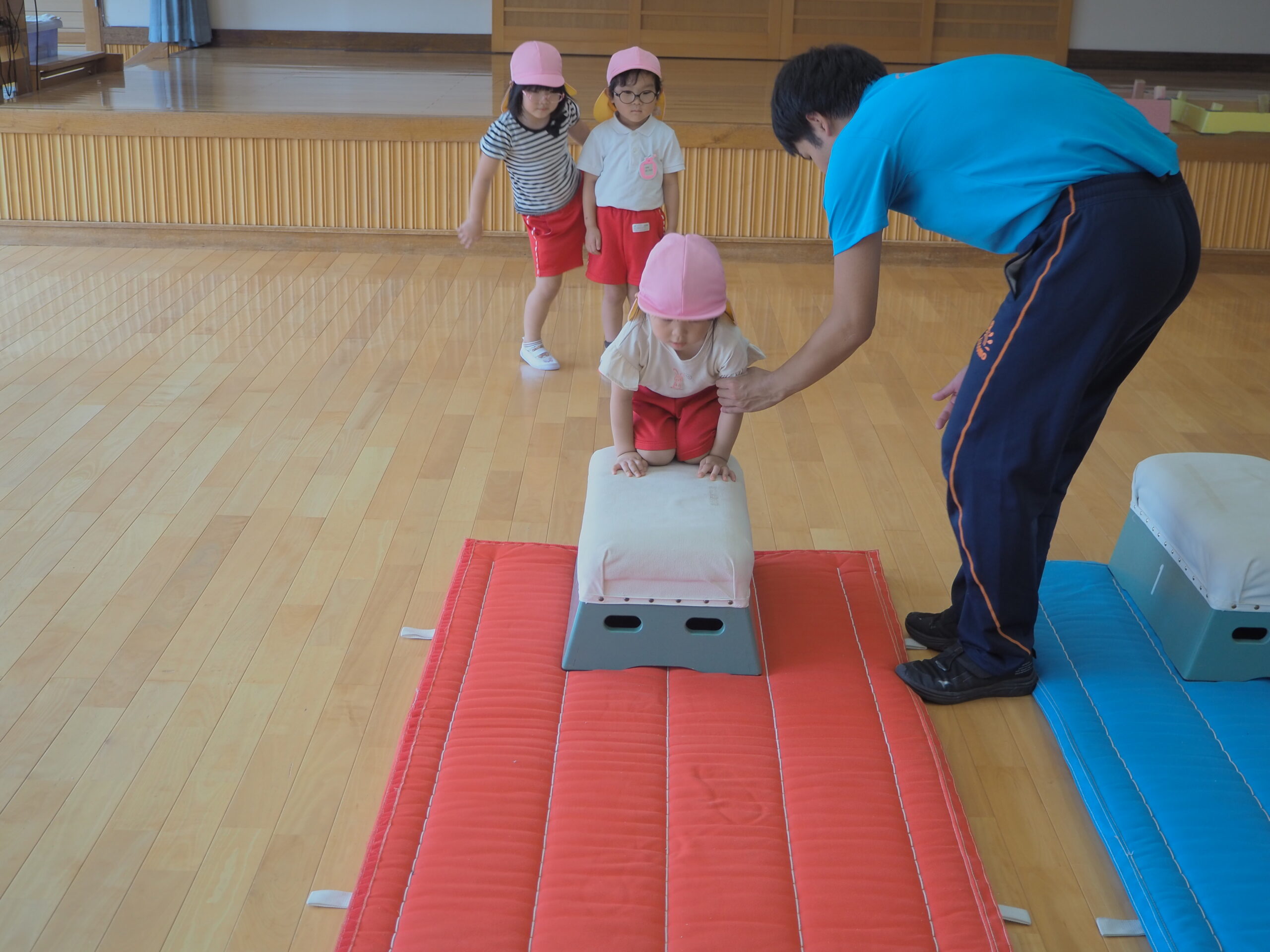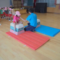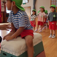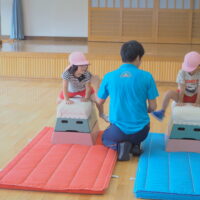 1段増えて2段になり「できるかな?」「跳べるかな?」と心配していた子もいましたが、”手を遠くについてからお尻をつく”