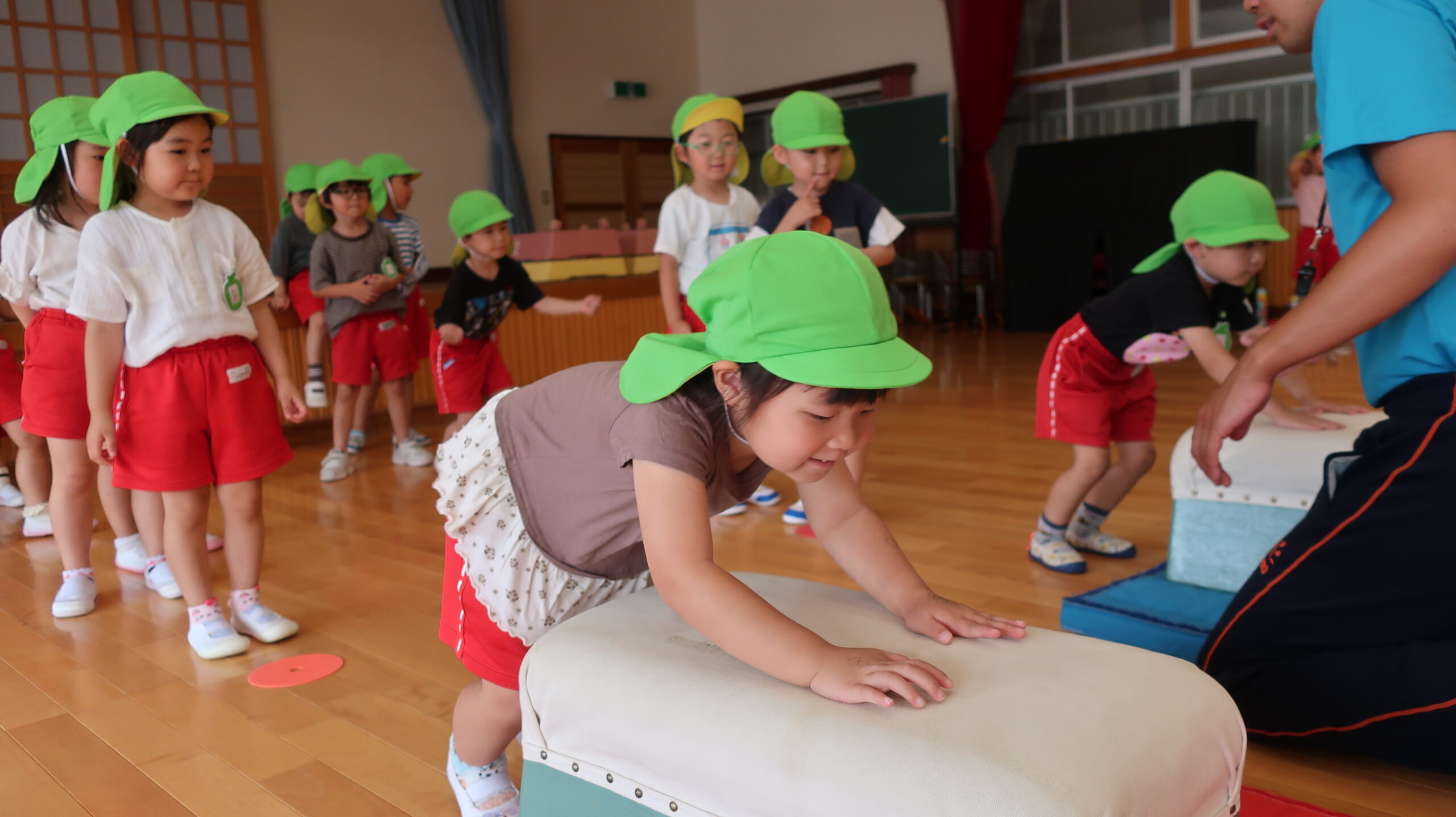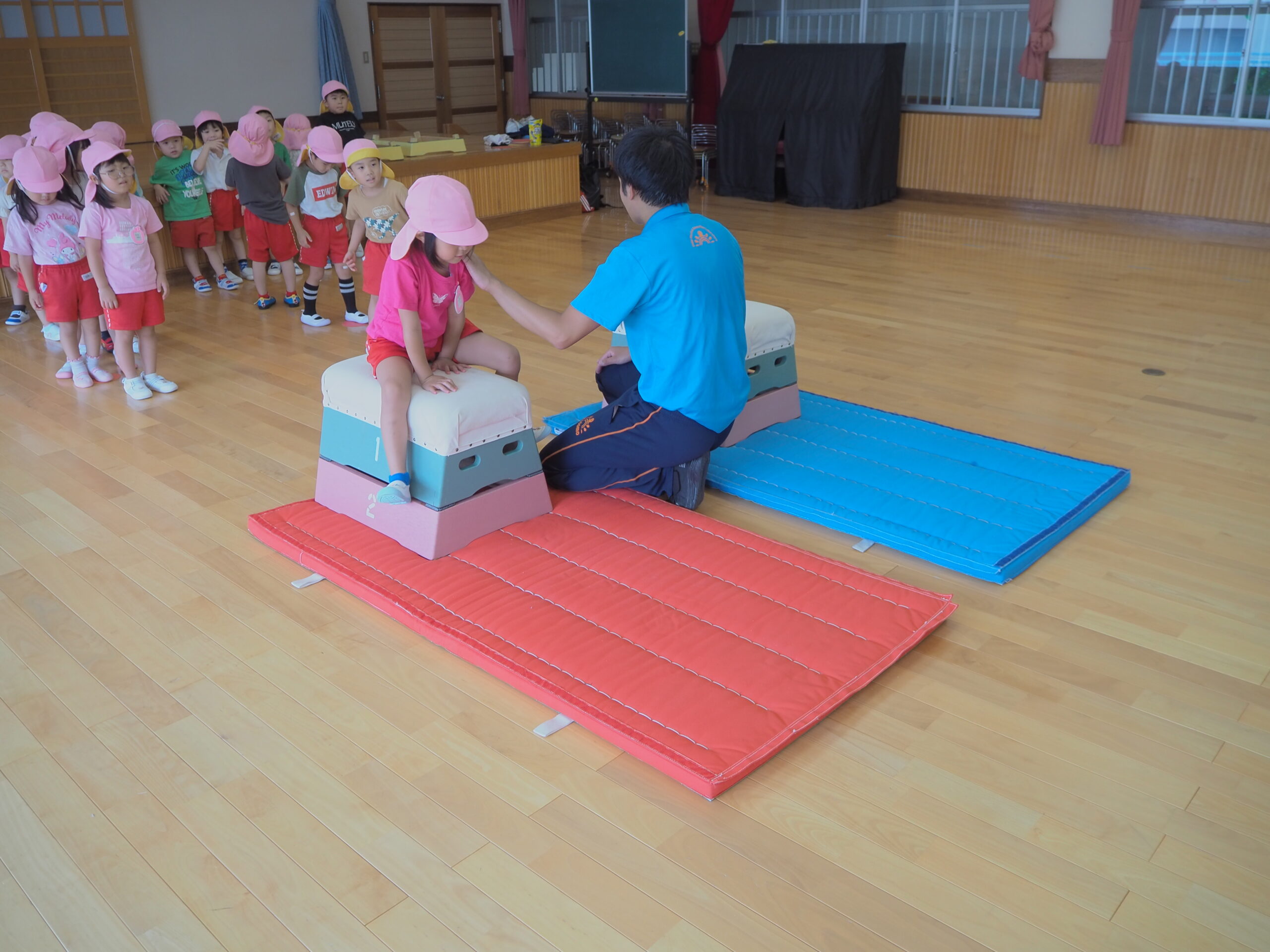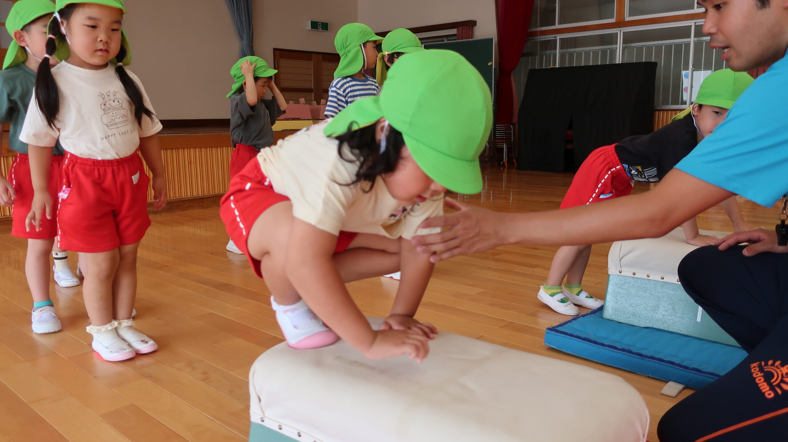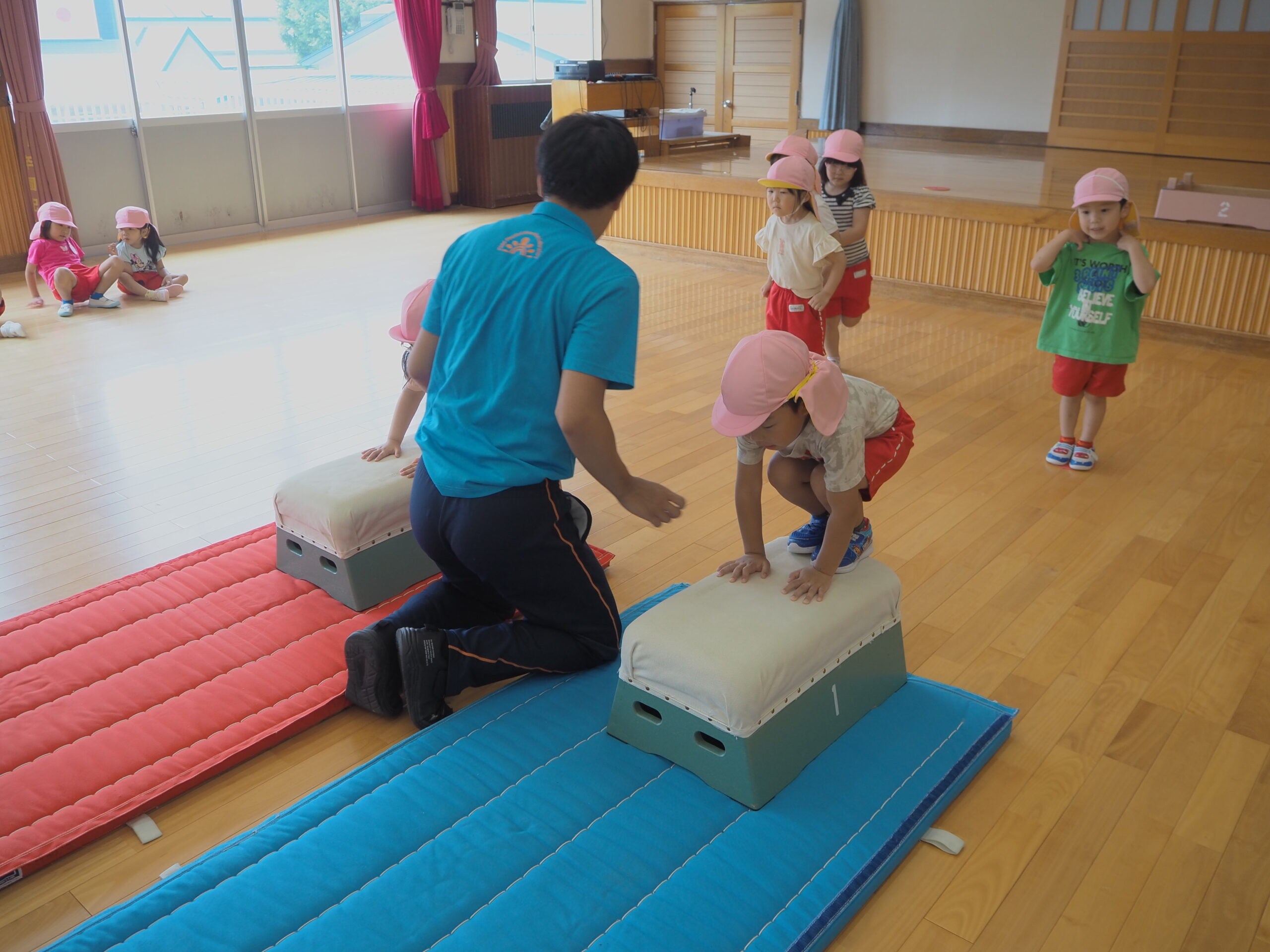 1段増えて2段になり「できるかな?」「跳べるかな?」と心配していた子もいましたが、”手を遠くについてからお尻をつく”