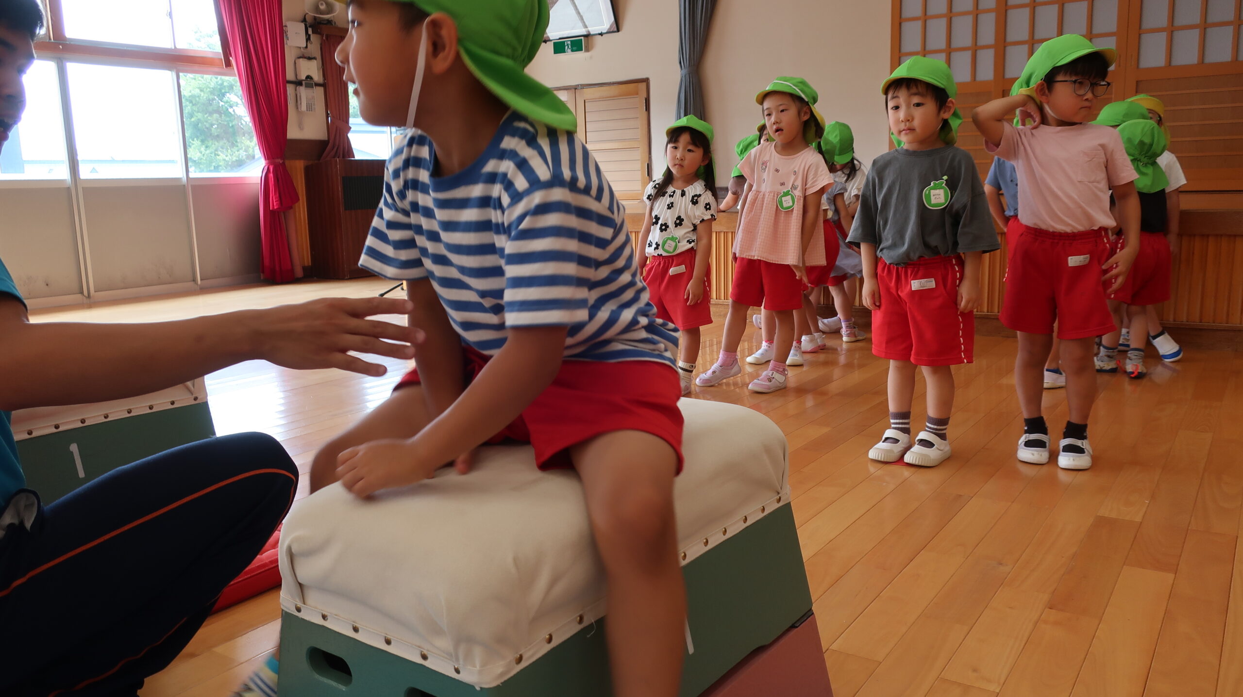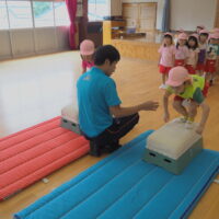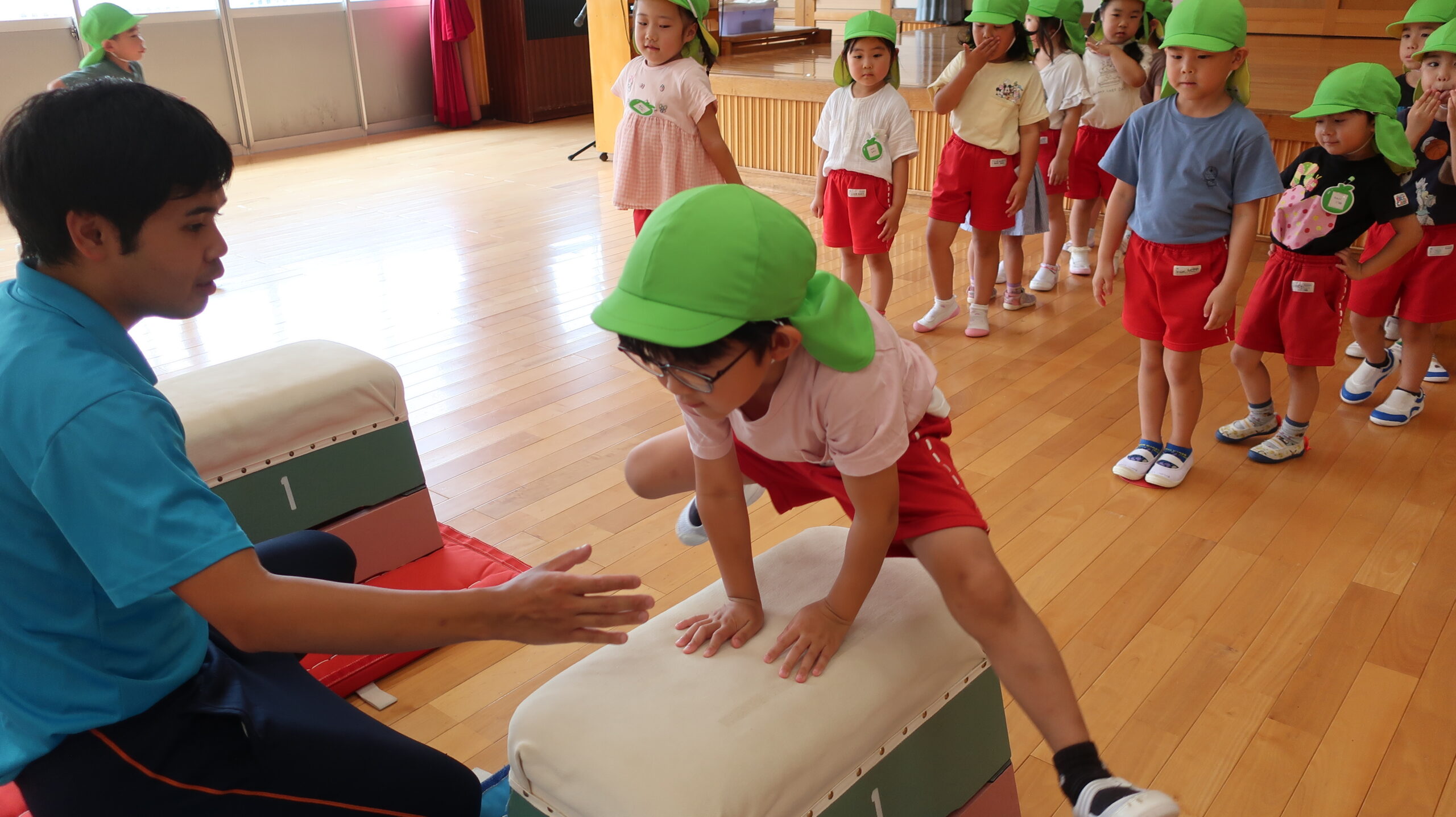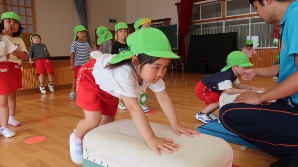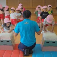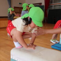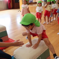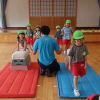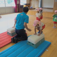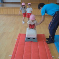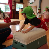 跳び箱を跳ぶ前に練習として手を前に出してから両足でジャンプに挑戦!