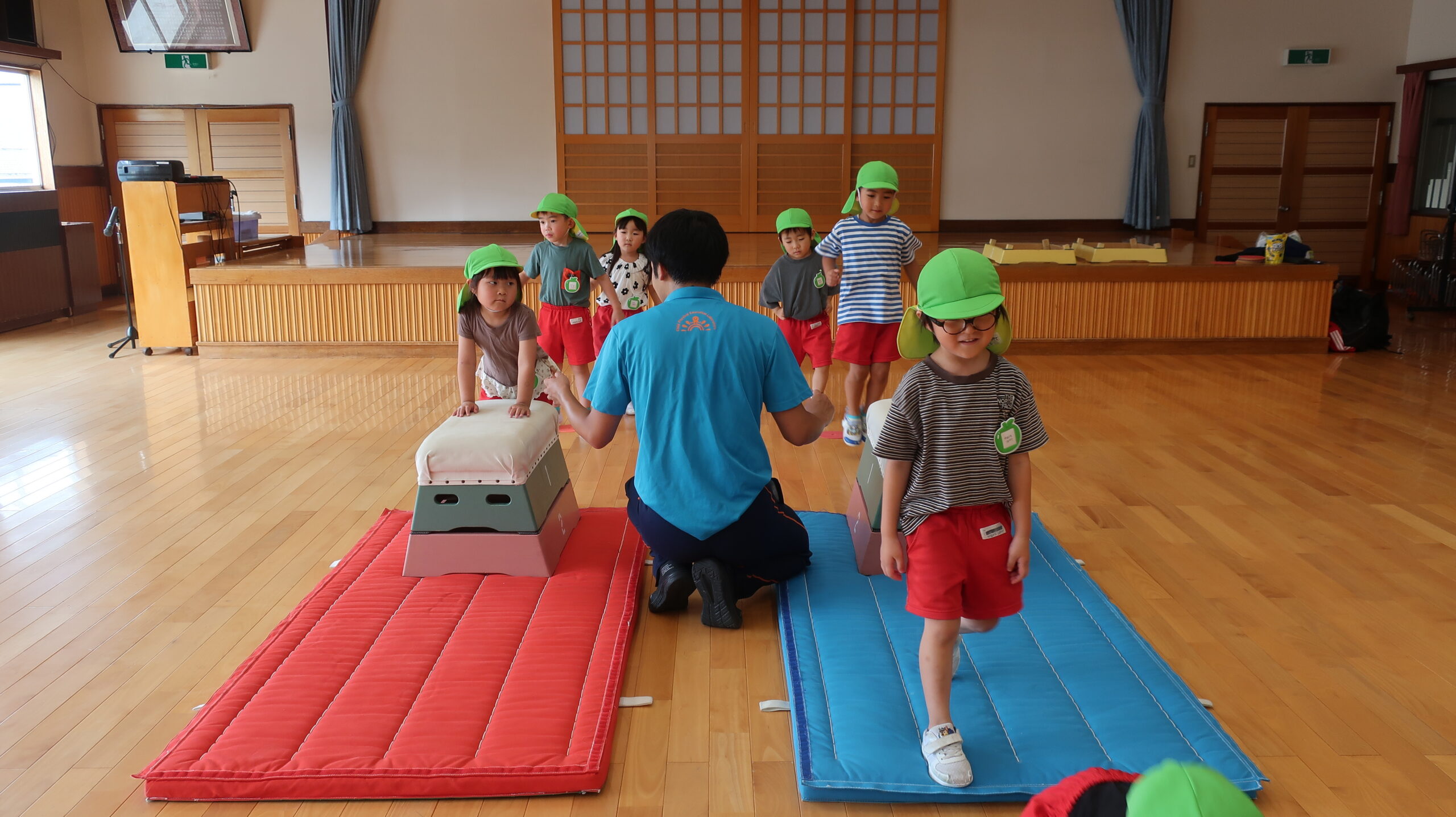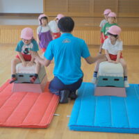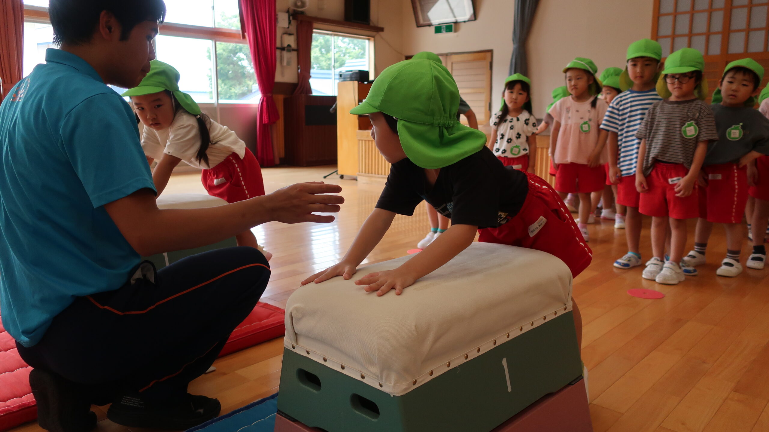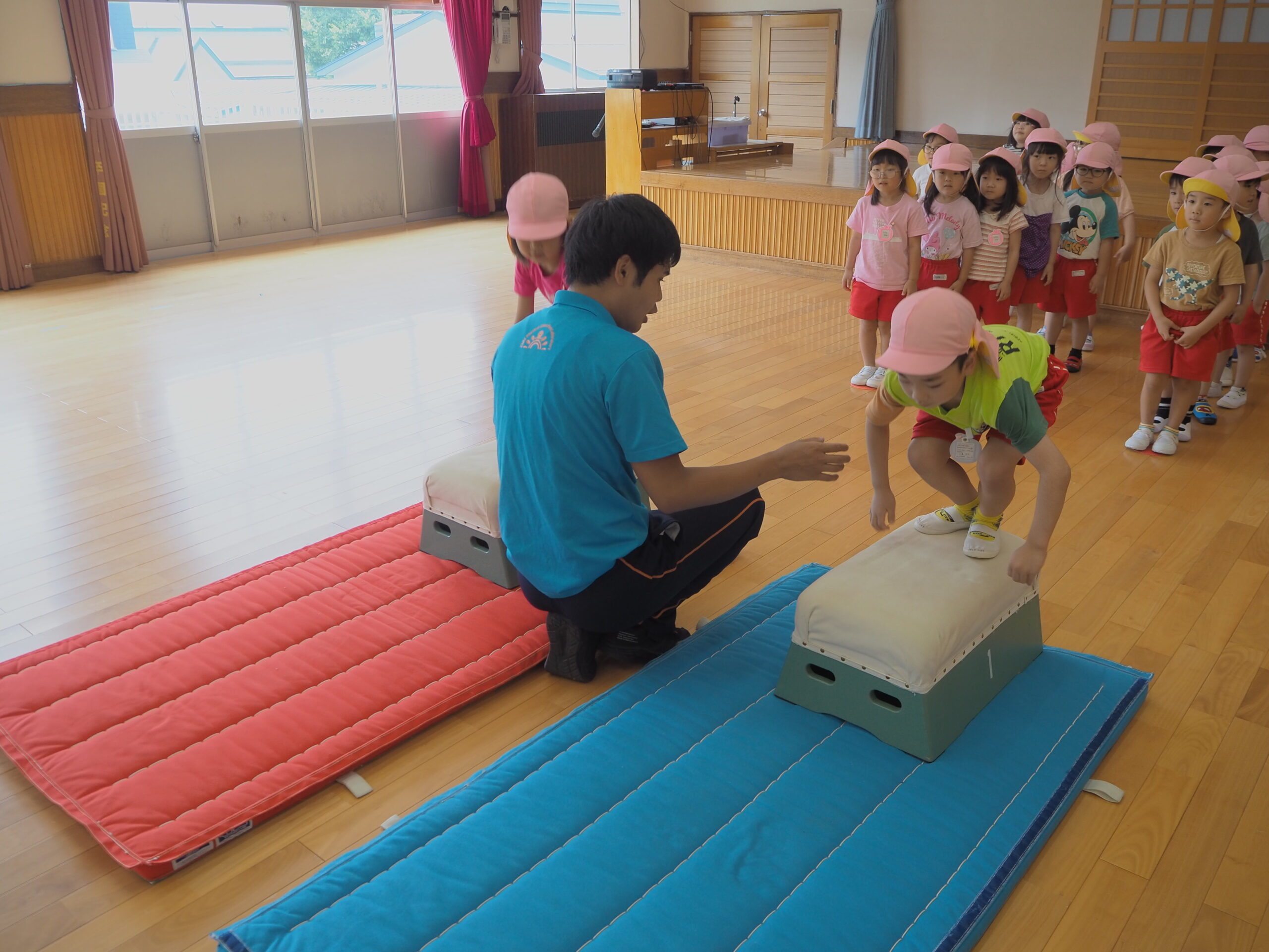 跳び箱を跳ぶ前に練習として手を前に出してから両足でジャンプに挑戦!
