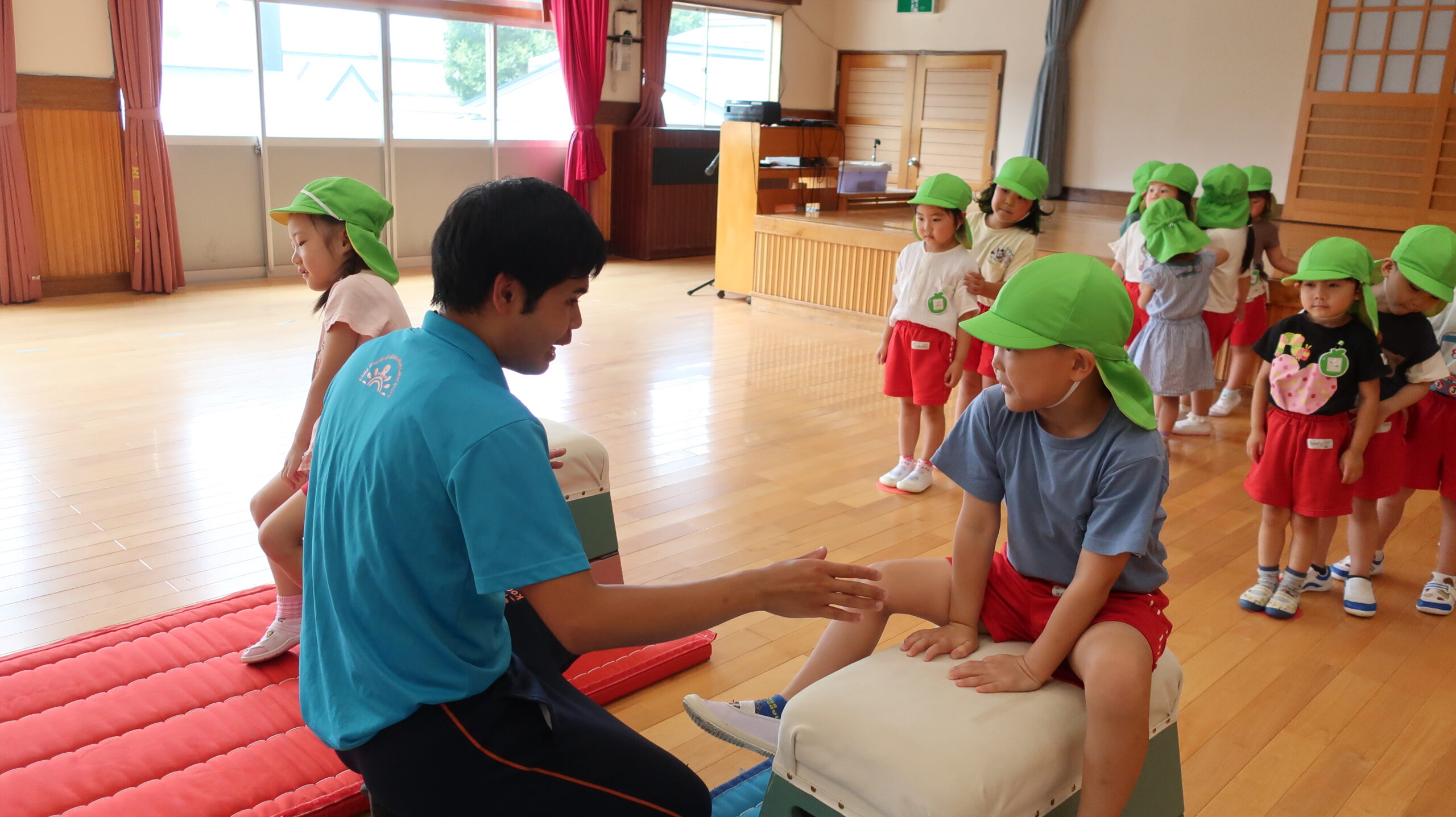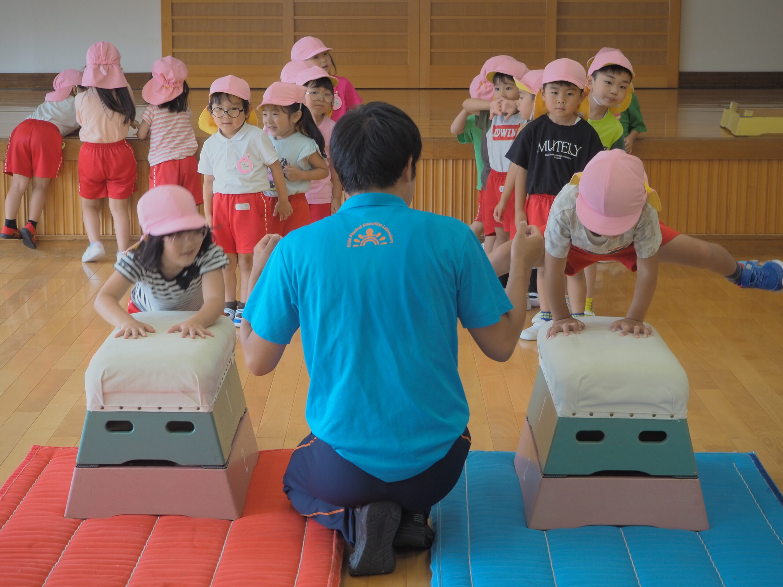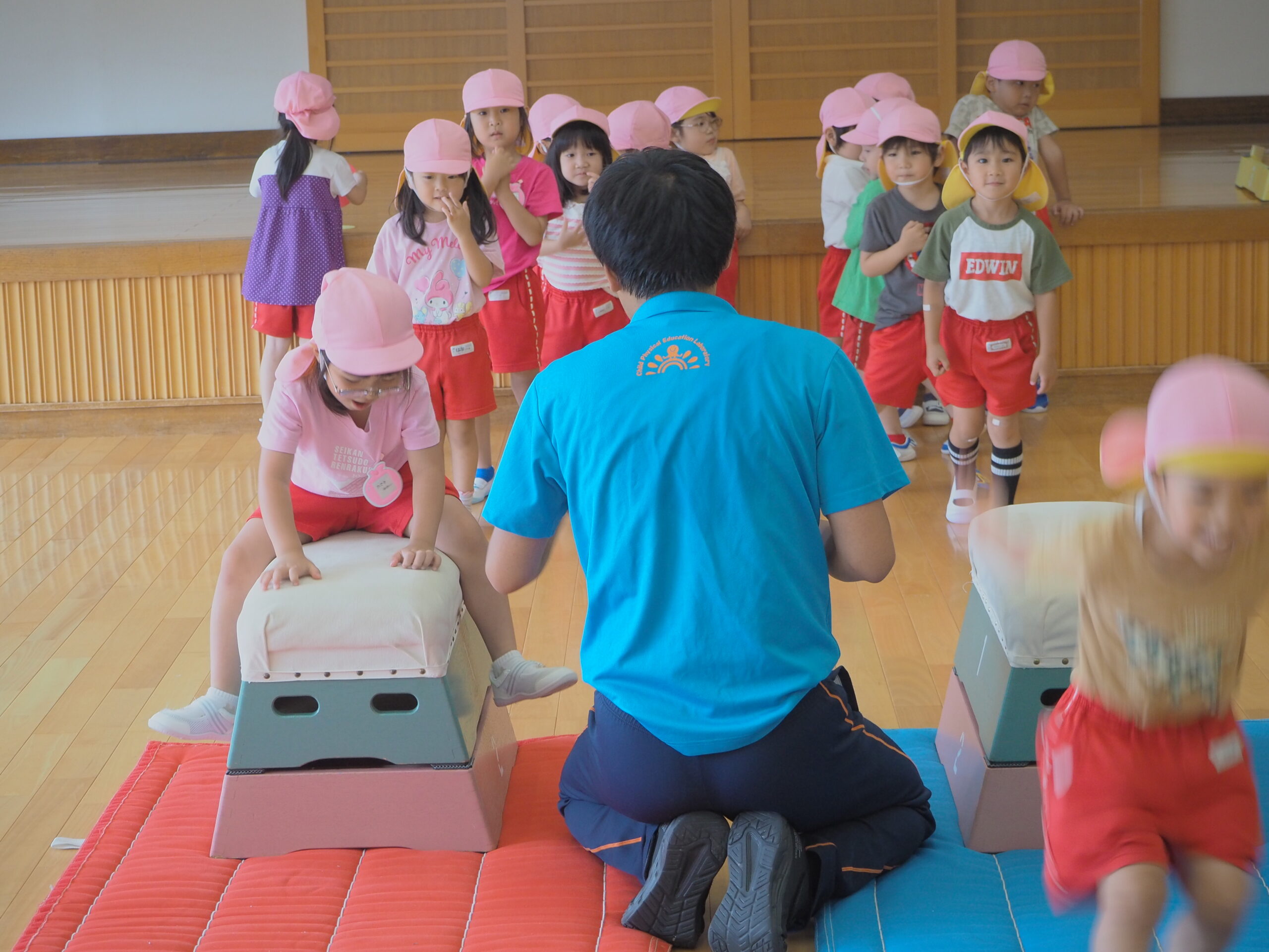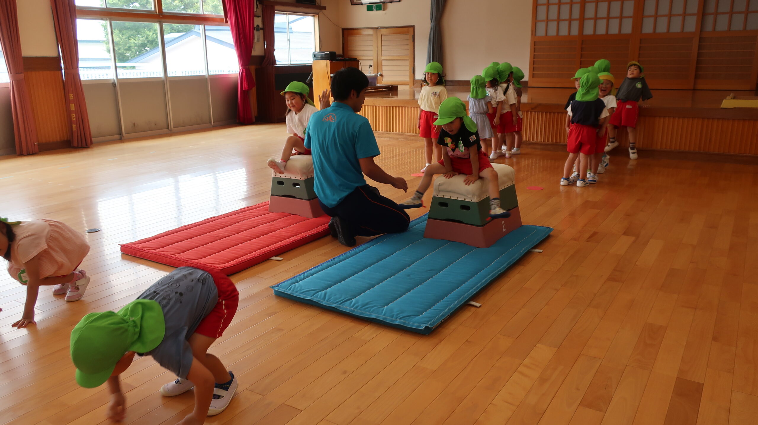 今日の内容は跳び箱で、「やったことあるよ!」「できるよ!!」といった声が聞こえ、始まる前からやる気満々💪