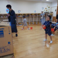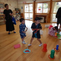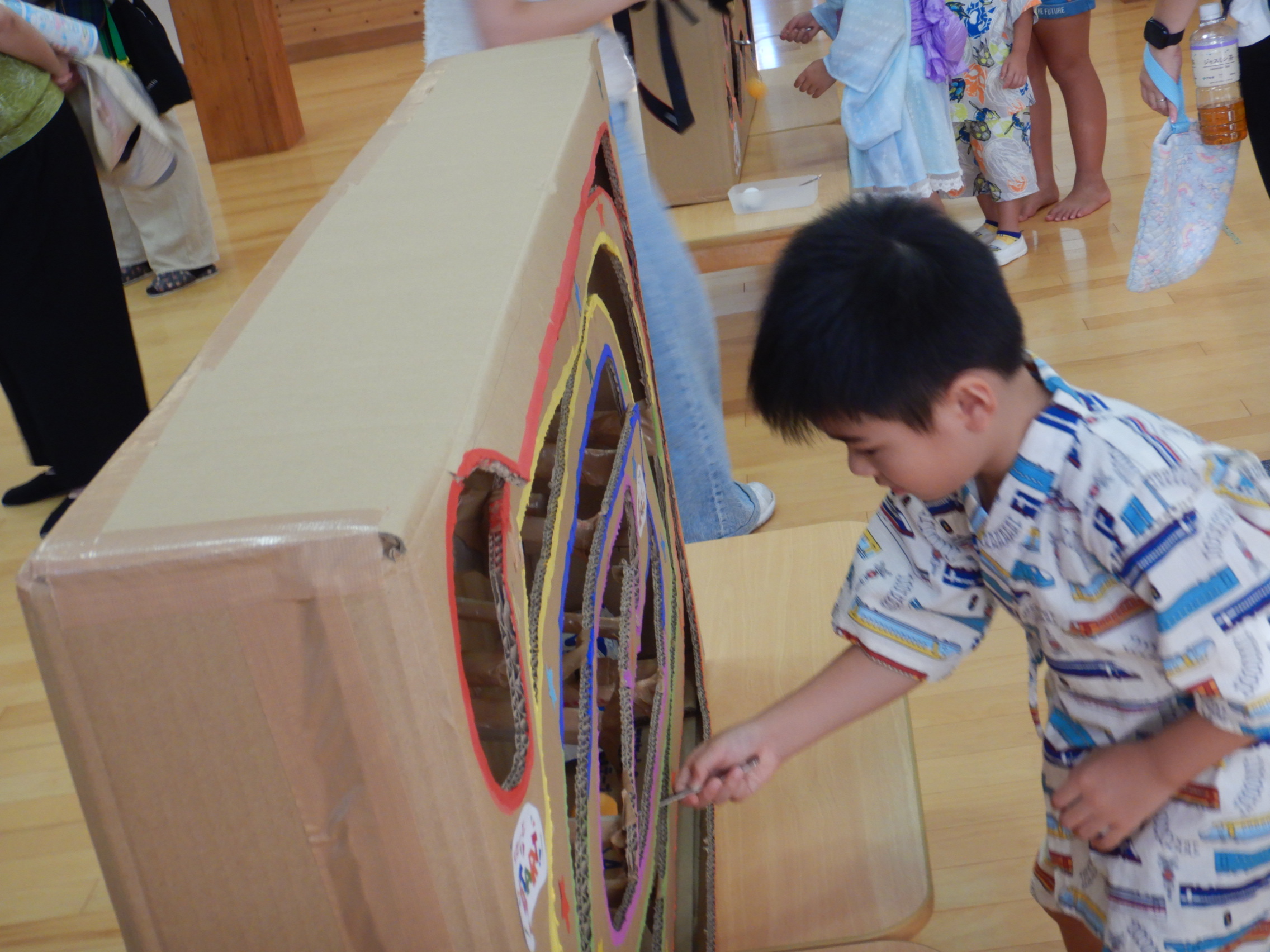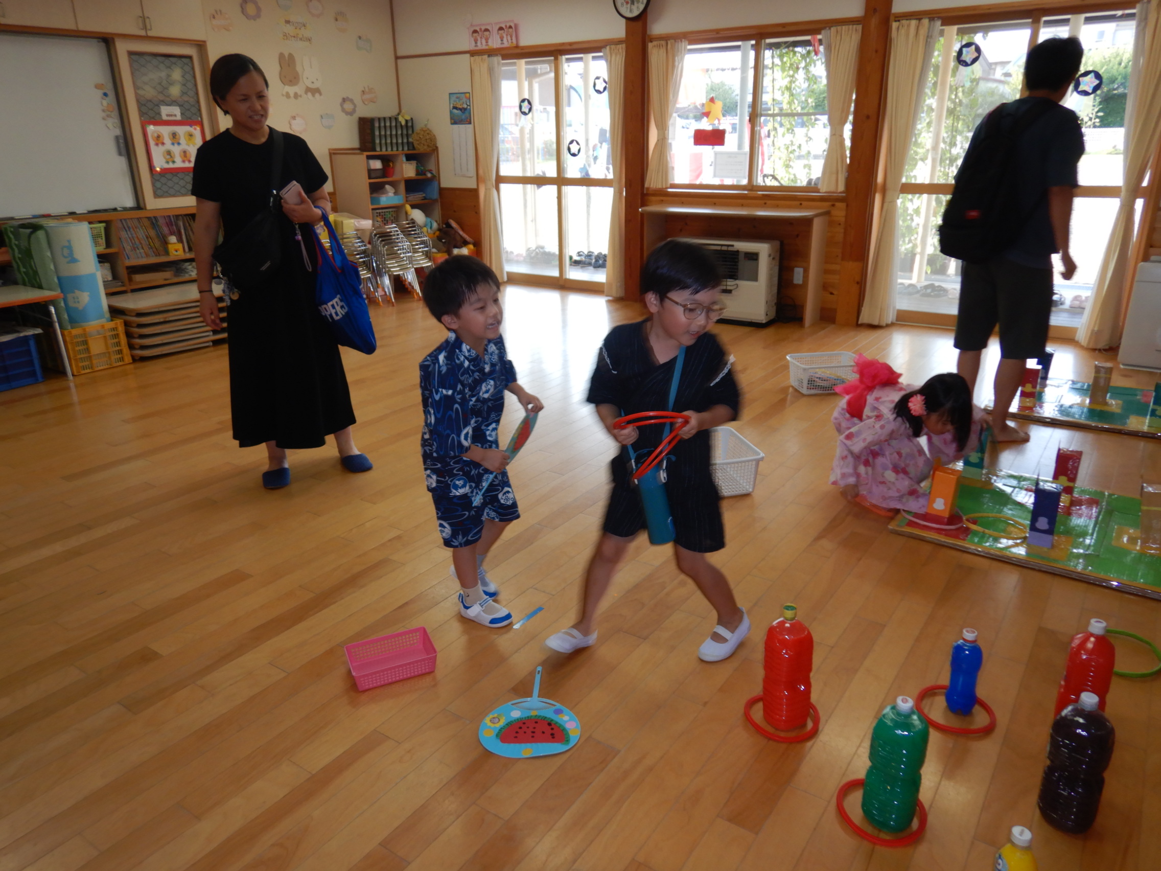 さっそくお泊まり保育の時に制作したうちわを持ちながら、園内のゲームコーナへレッツゴー!
