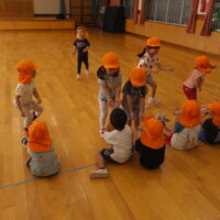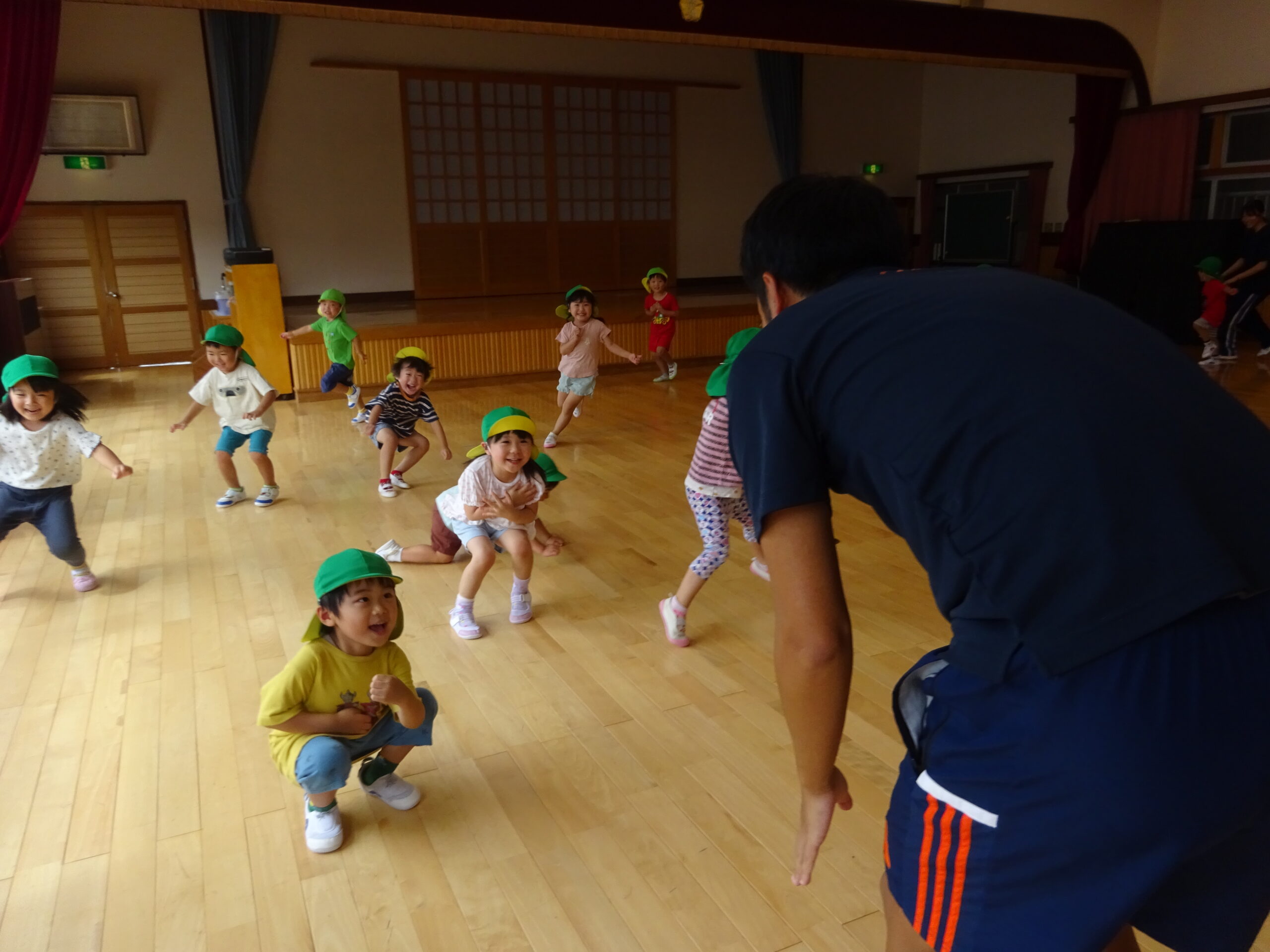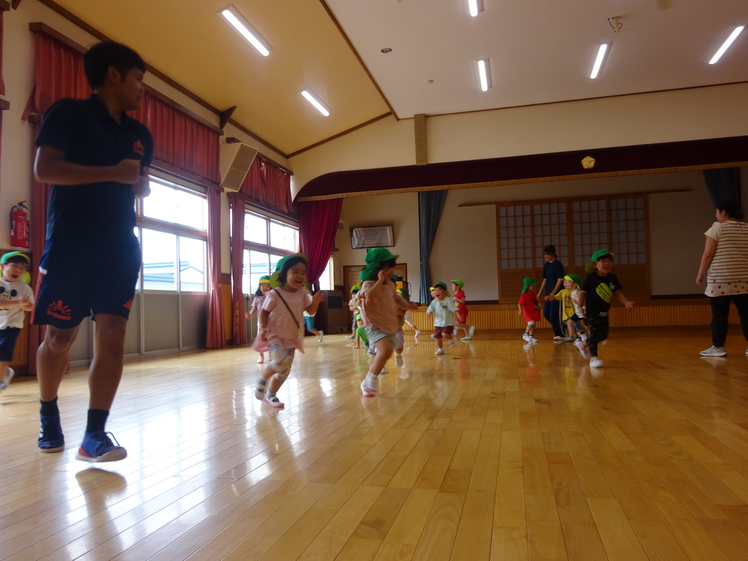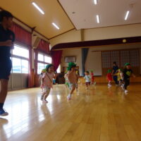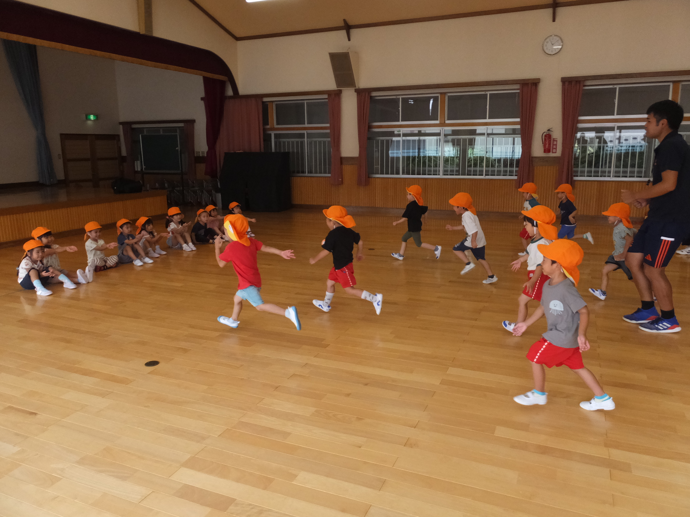 まずは体操教室の様子を紹介します。今回は運動会に向けて“陸上運動🏃♂️➡️”を行いました。2チームに分かれて相手の陣地まで走り、友達からお買い物をして走って戻ってくるを繰り返し行いました。はじめは「よーいドン」の合図より先に走り出してフライングをしてしまう子もいましたが、何度か行っていくと“合図を聞く”ができるようになり、また「よーい」の時に片足を1歩下げることも上手になってきました。