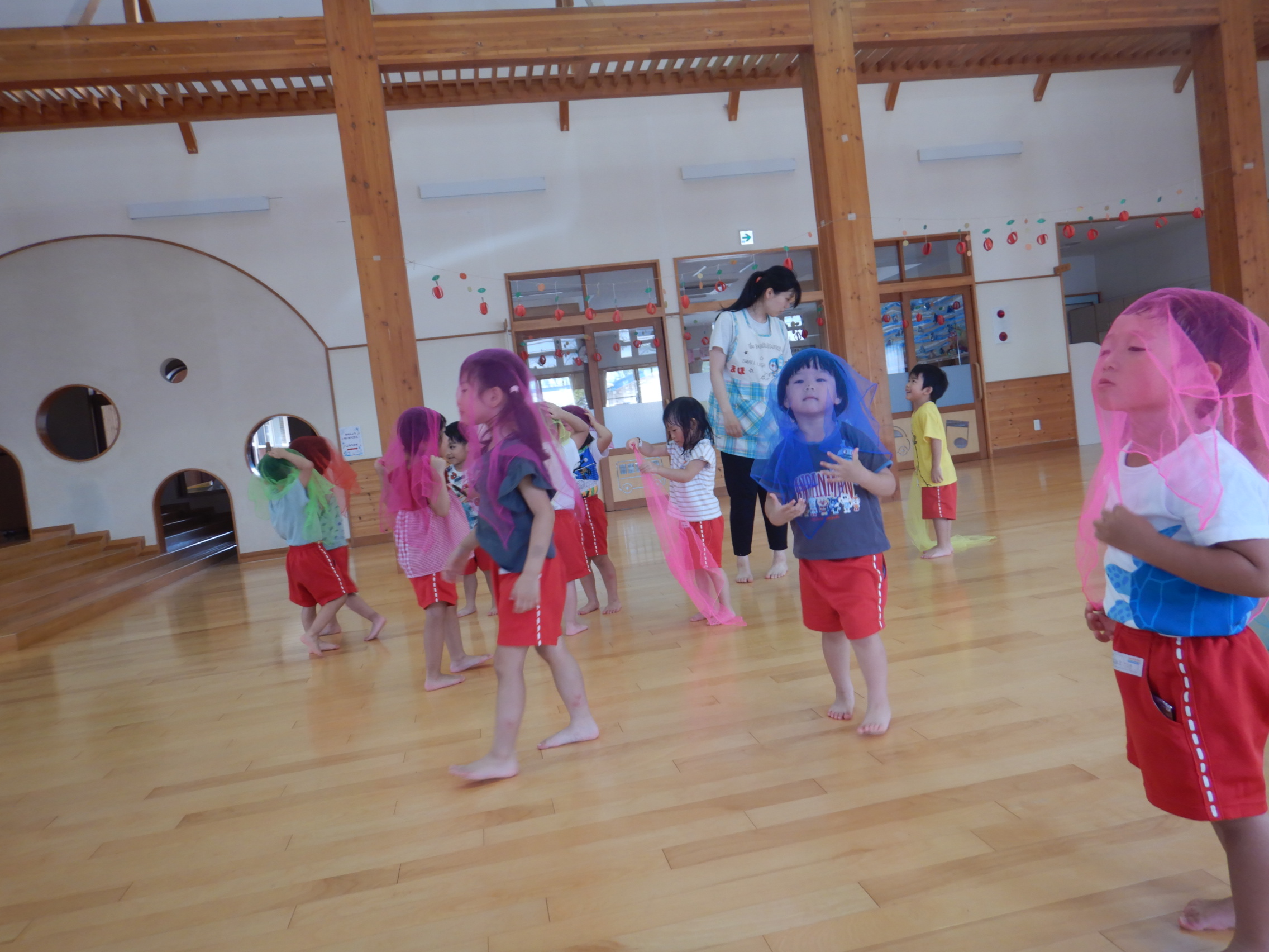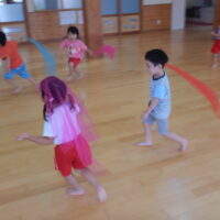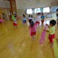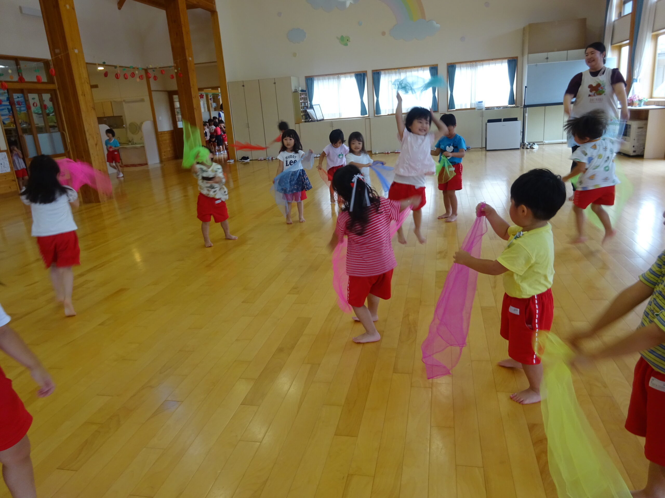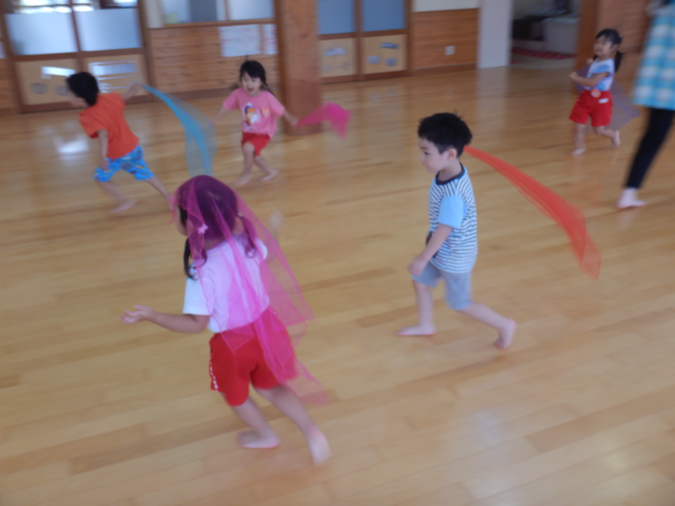 次にリトミックの様子を紹介します。今回はオーガンジーの布を使って風🌀を表現しました。ピアノの音に合わせて優しくヒラヒラと動かしたり、ピアノの音が大きくなったら布を大きく振ったり、くるくるとその場で竜巻のように回ってみたりと子ども達は自由に表現を楽しんでいました。