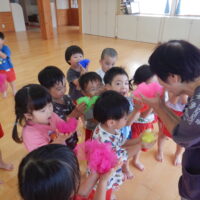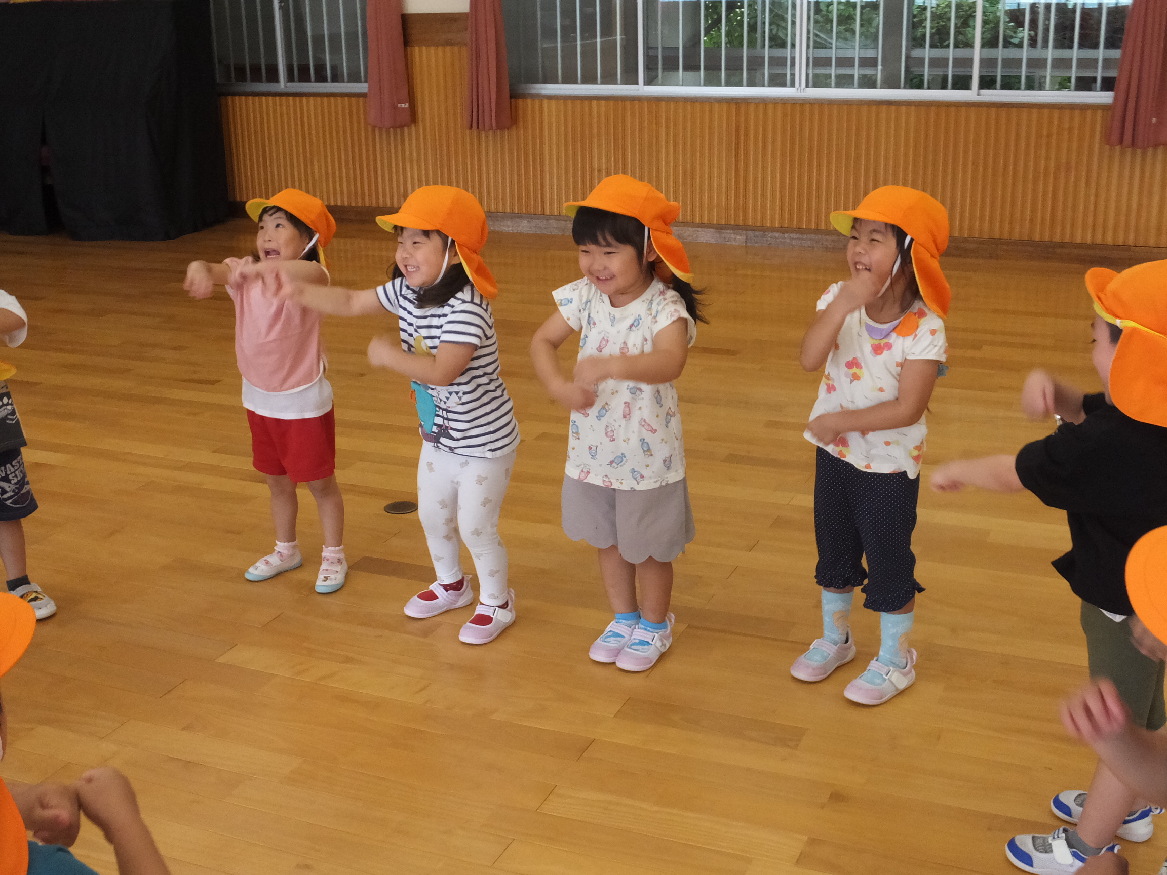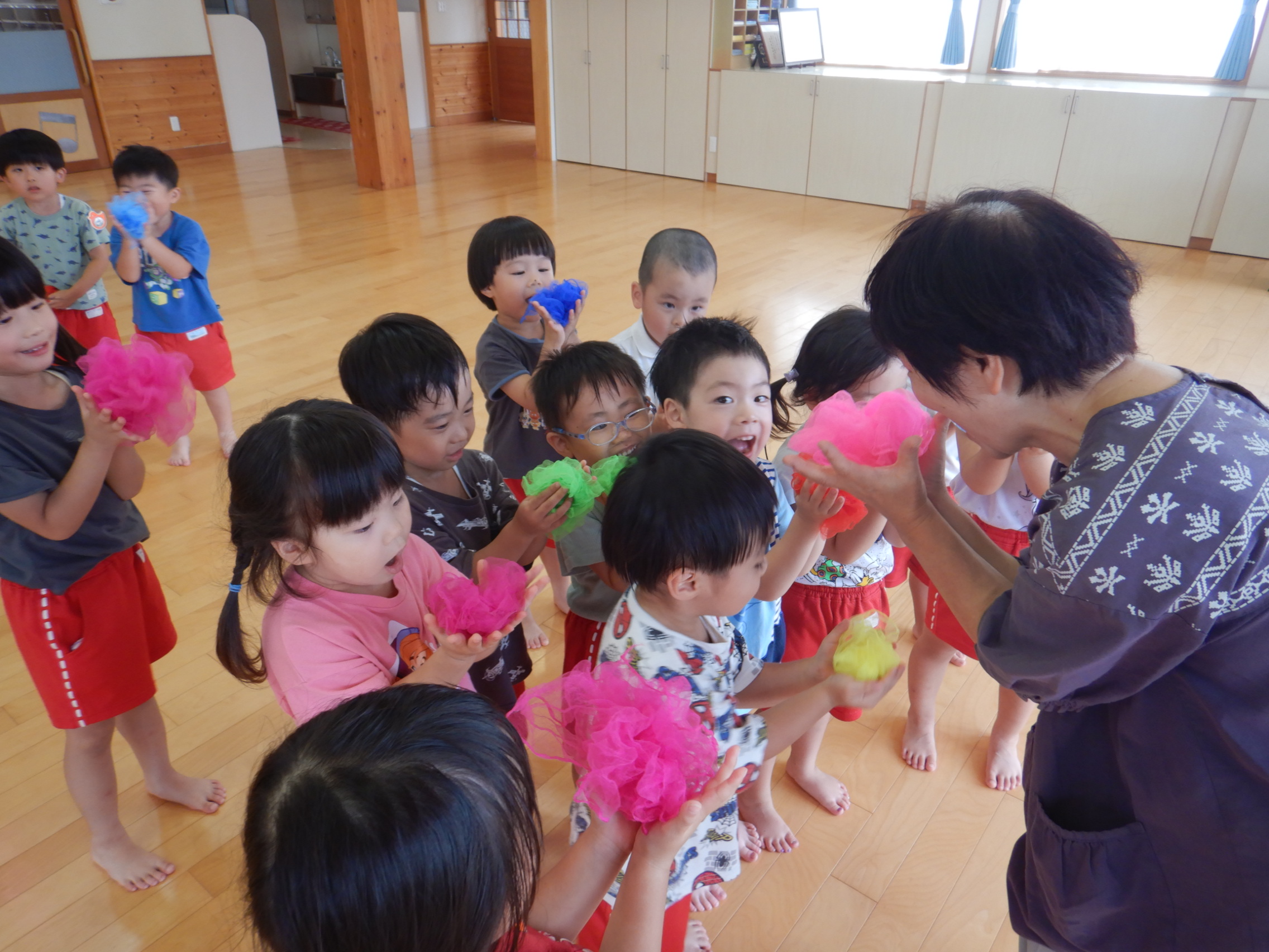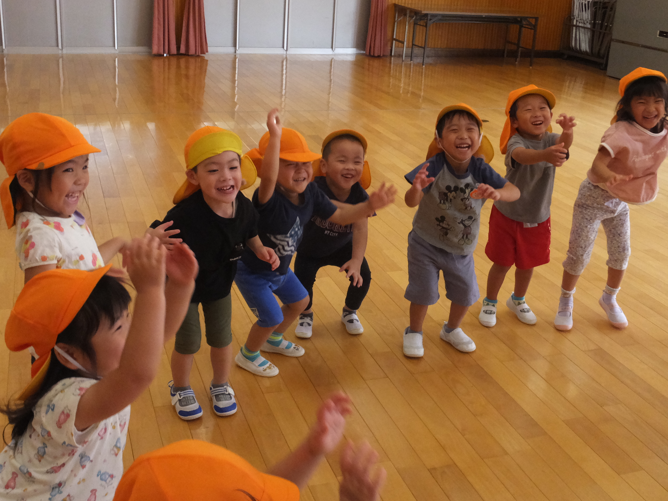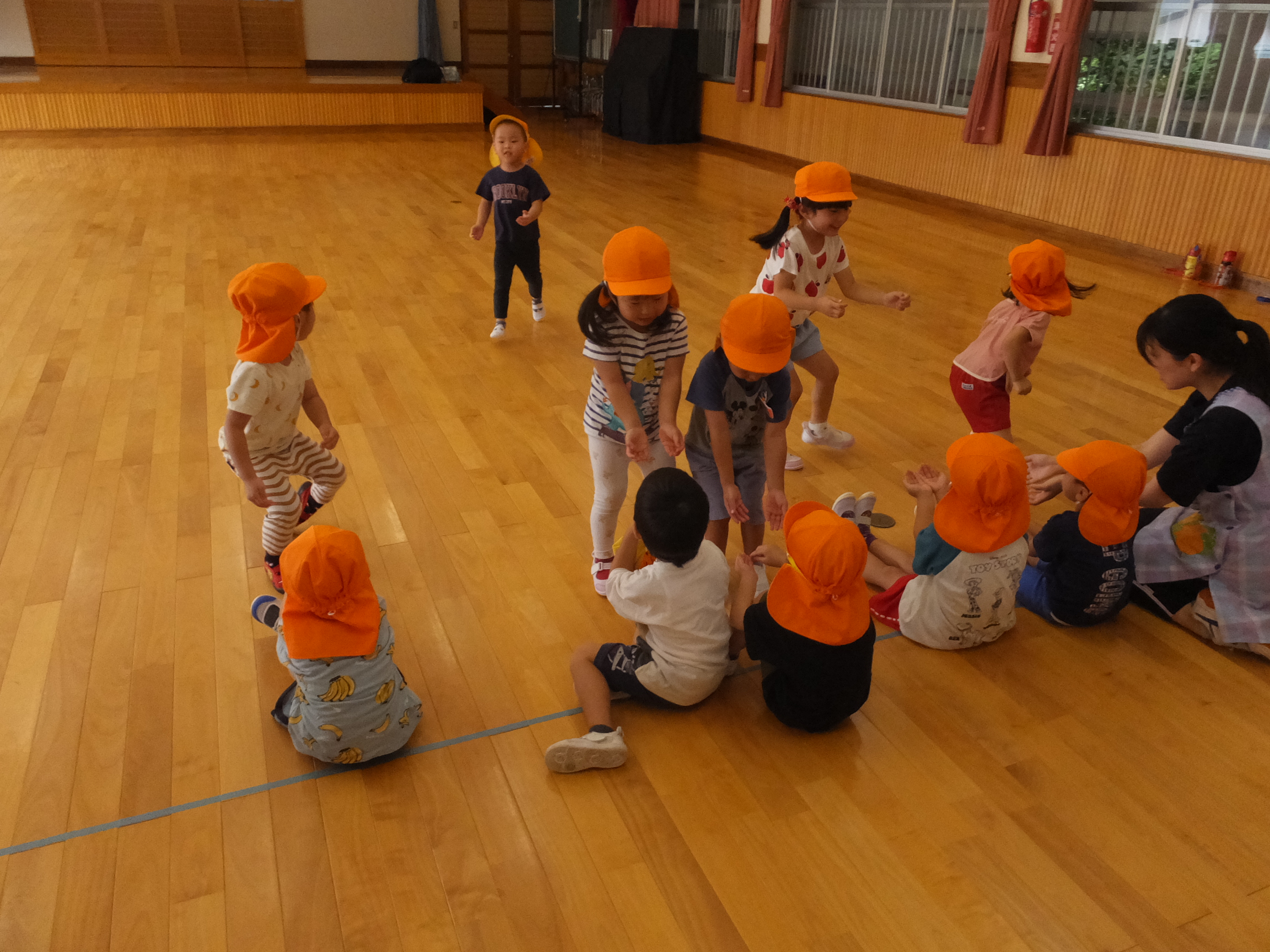 次にリトミックの様子を紹介します。今回はオーガンジーの布を使って風🌀を表現しました。ピアノの音に合わせて優しくヒラヒラと動かしたり、ピアノの音が大きくなったら布を大きく振ったり、くるくるとその場で竜巻のように回ってみたりと子ども達は自由に表現を楽しんでいました。
