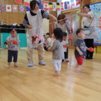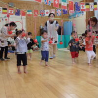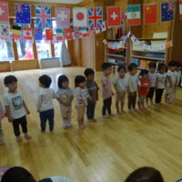 ホールに飾られた万国旗を見つけると、朝から大興奮の子どもたち。