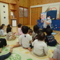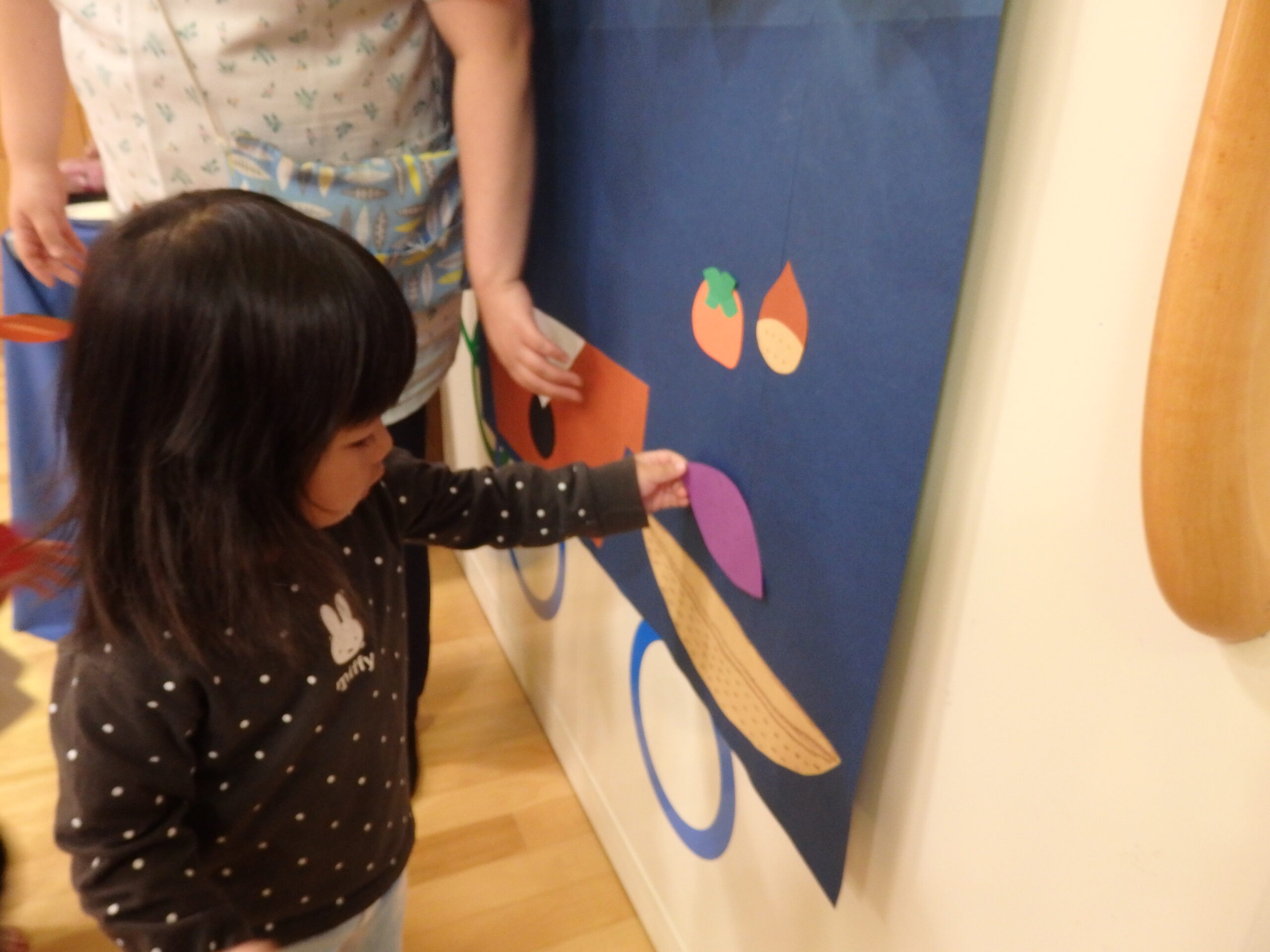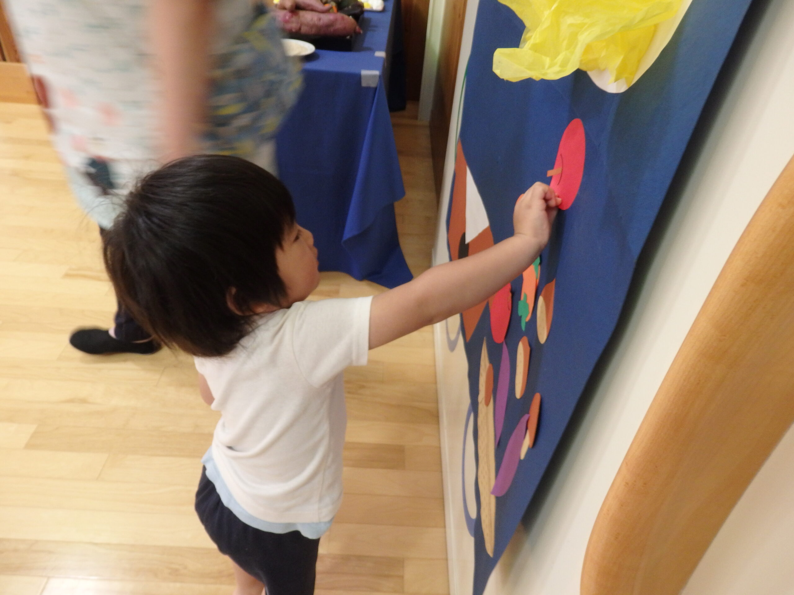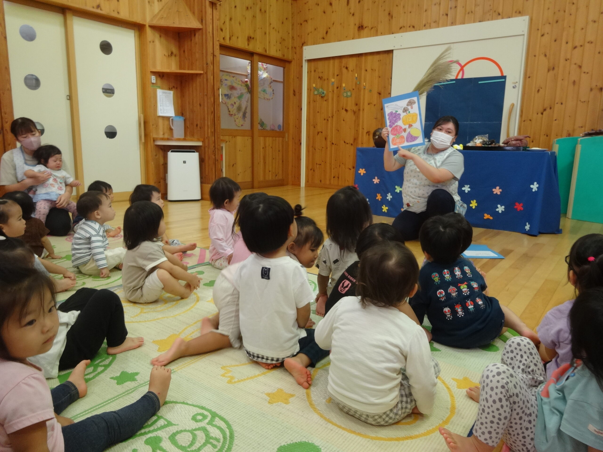 先生から『十五夜』の紙芝居を読んでもらい、お供えしてあるたくさんの野菜や果物を前にじーっと見つめていると・・・👀