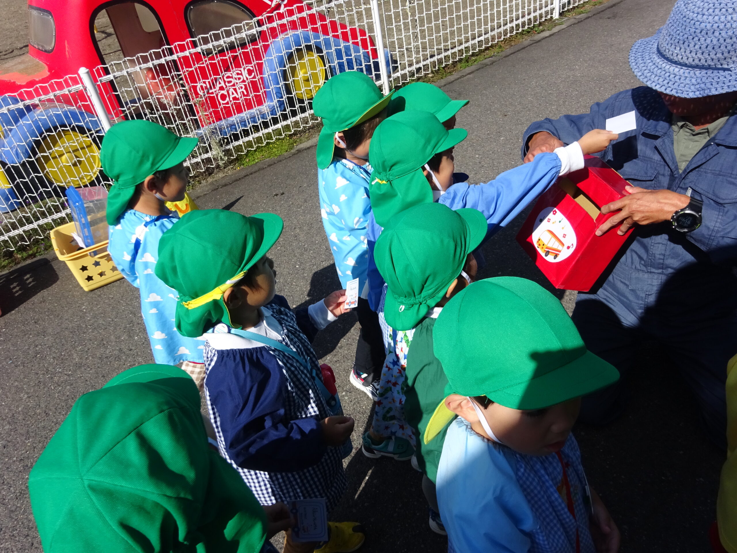 年少組は前日にバスくんからの手紙が届き、封筒の中にお手紙と乗車券が入っていて子ども達は「バスの絵が描いてある!」と興味津々★