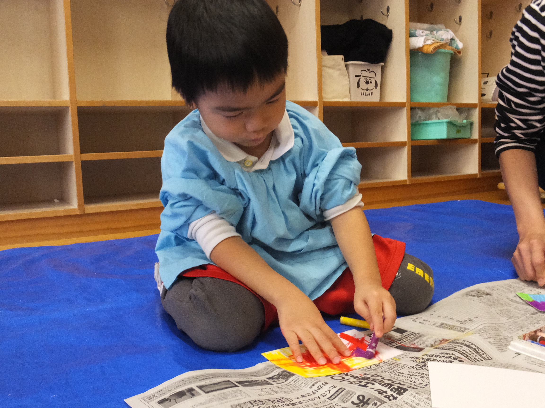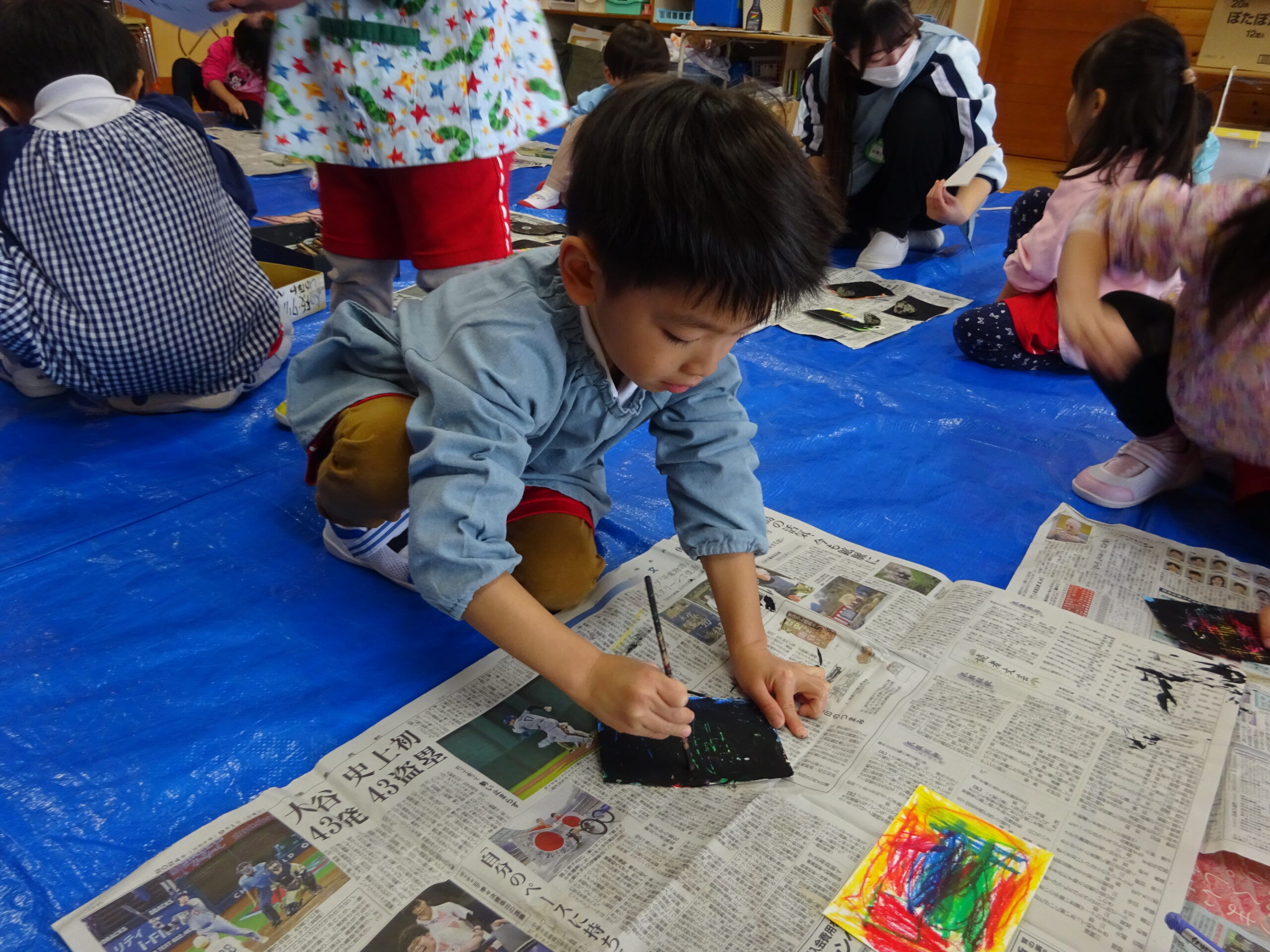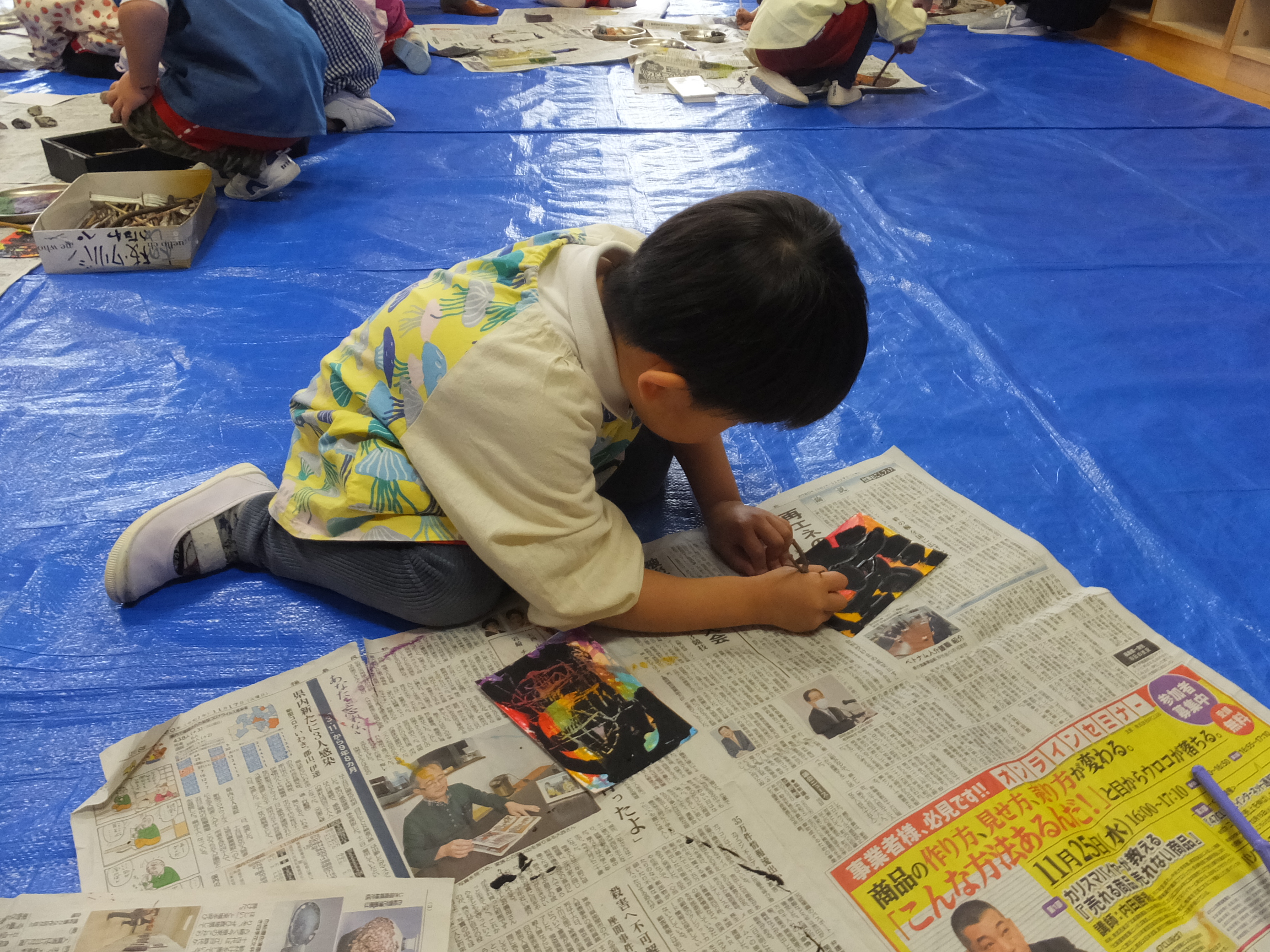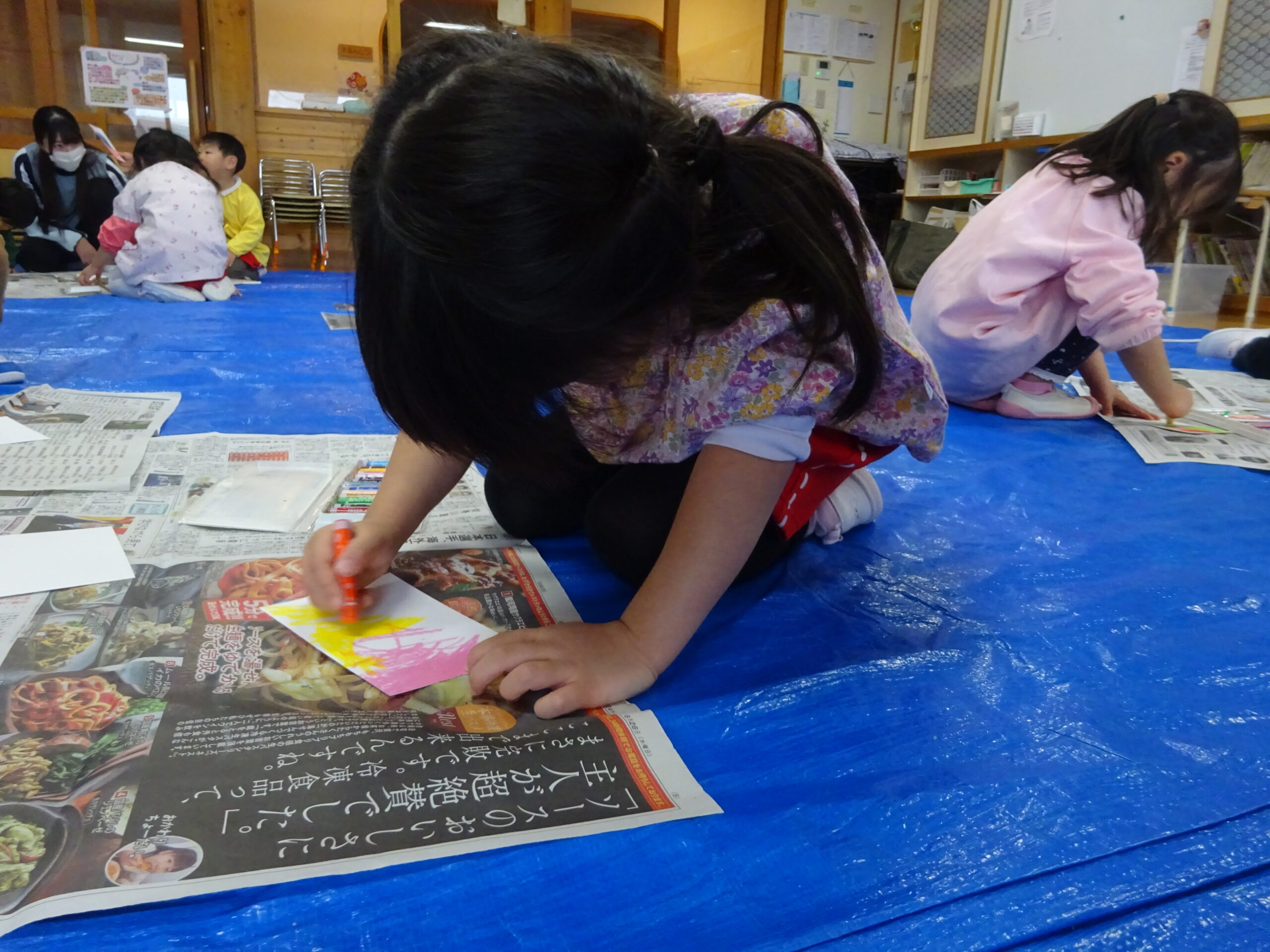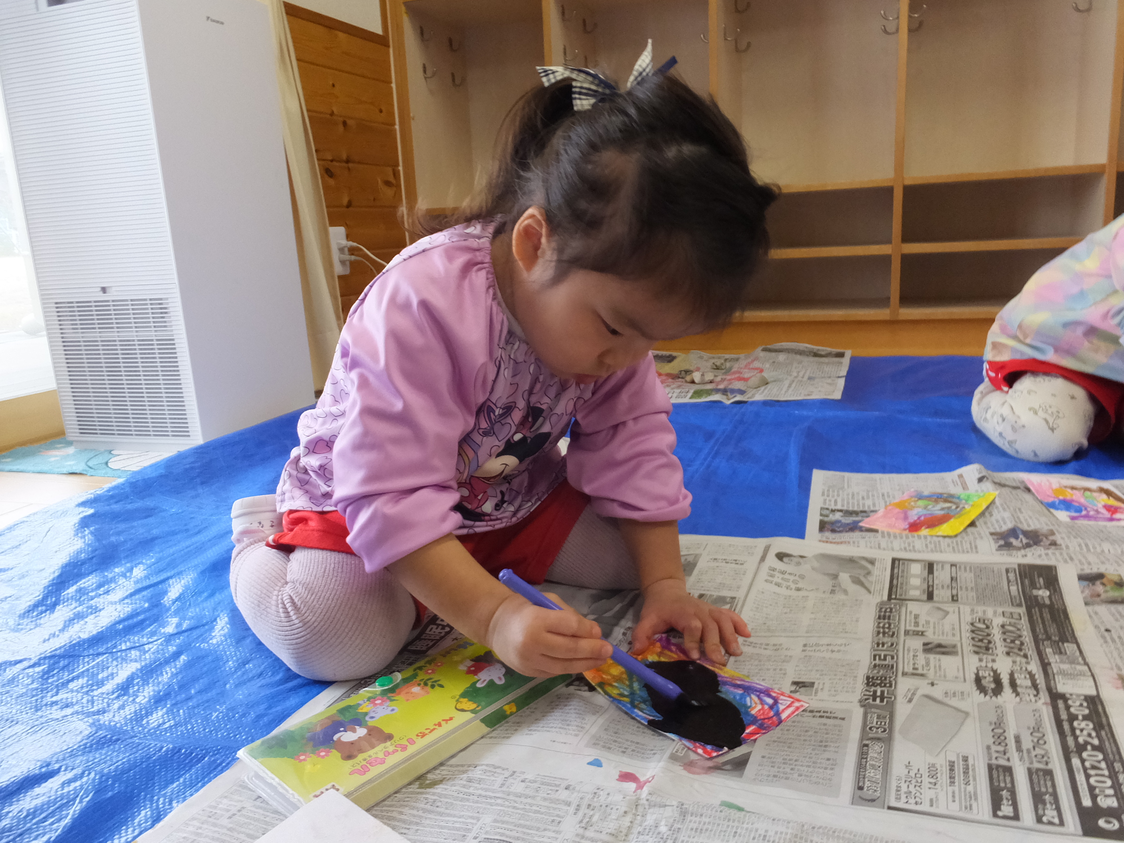 11月25日(火)に子ども達が楽しみにしていた絵画教室がありました。馬場先生からクレヨンの下の方を持って描くときれいに色が出ることを教えてもらい、はがき大の画用紙いっぱいに一人ひとり色を塗りました。その後、馬場先生がクレヨンで描いた上からアクリル絵の具で黒く塗りフォークで削るとカラフルな色が出てきて子ども達も「すごーい!」「きれい!」と前のめりで見ていました。子ども達も塗りつぶしたり、バスなどの絵を描いたりしてからフォークや枝を使ってスクラッチに挑戦!カラフルな模様が見えてくると「できた!みてー!」と嬉しそうな表情を見せていました😊