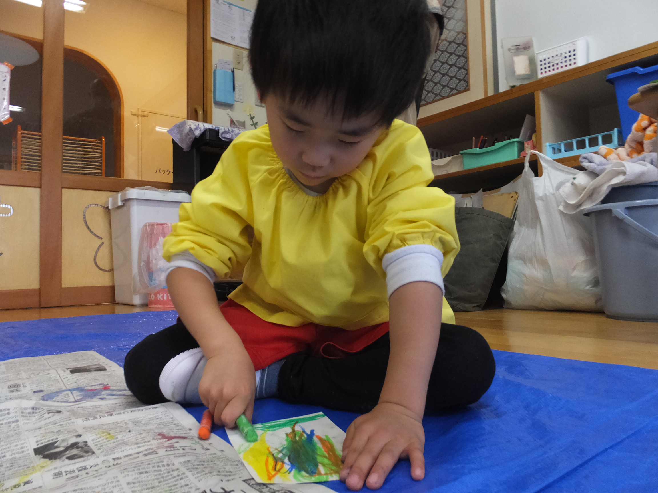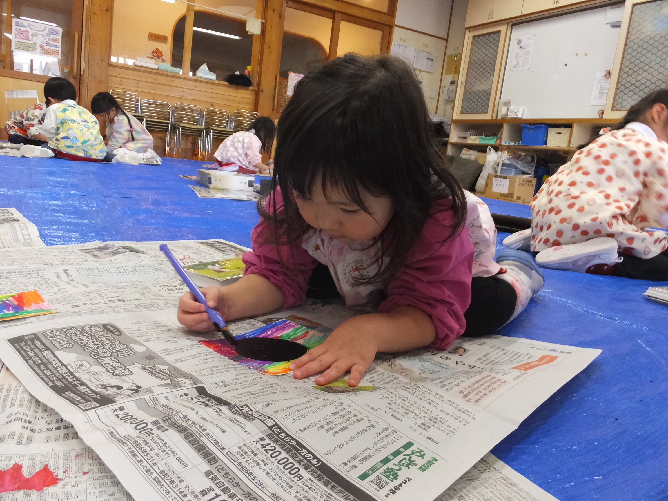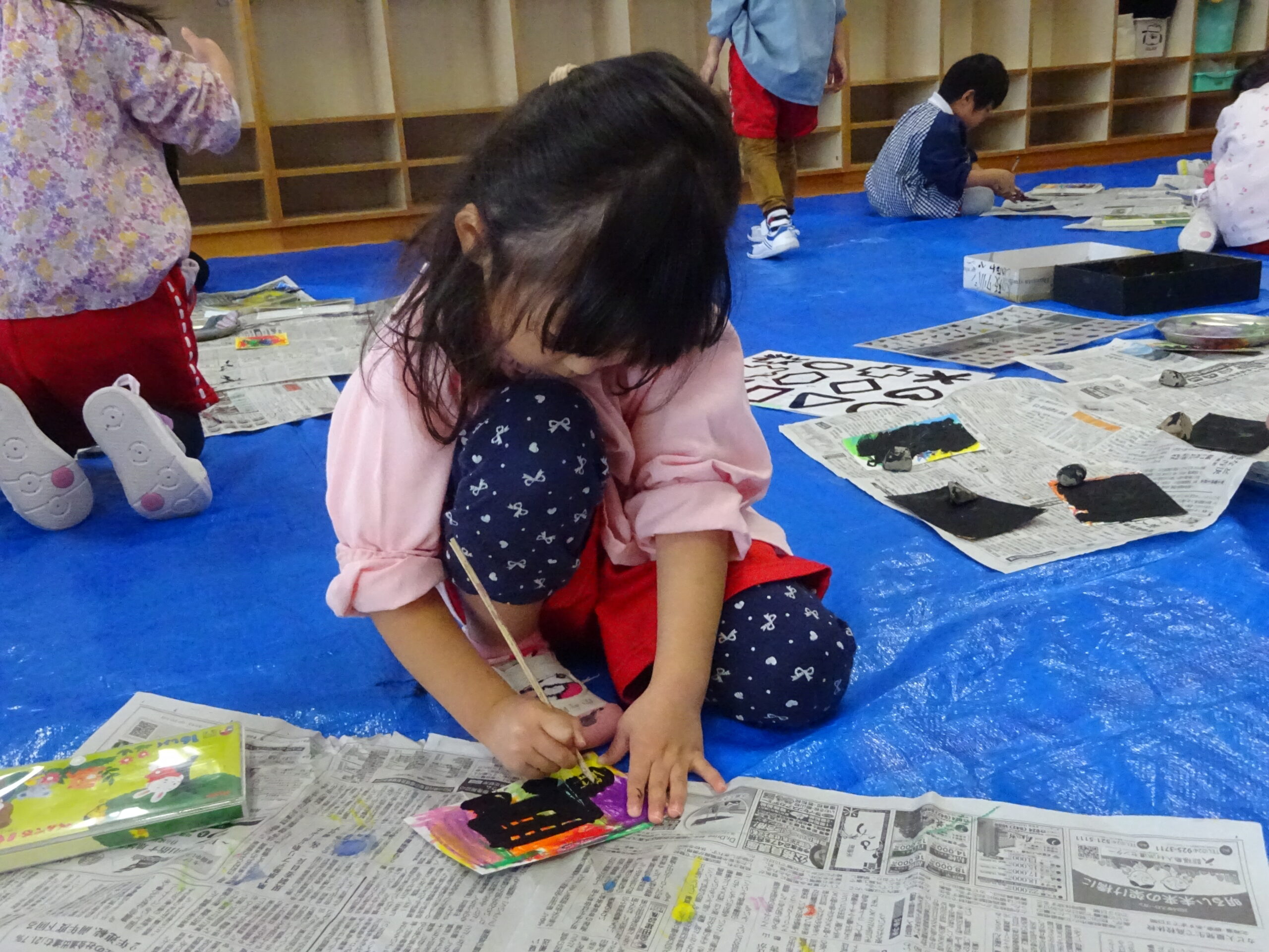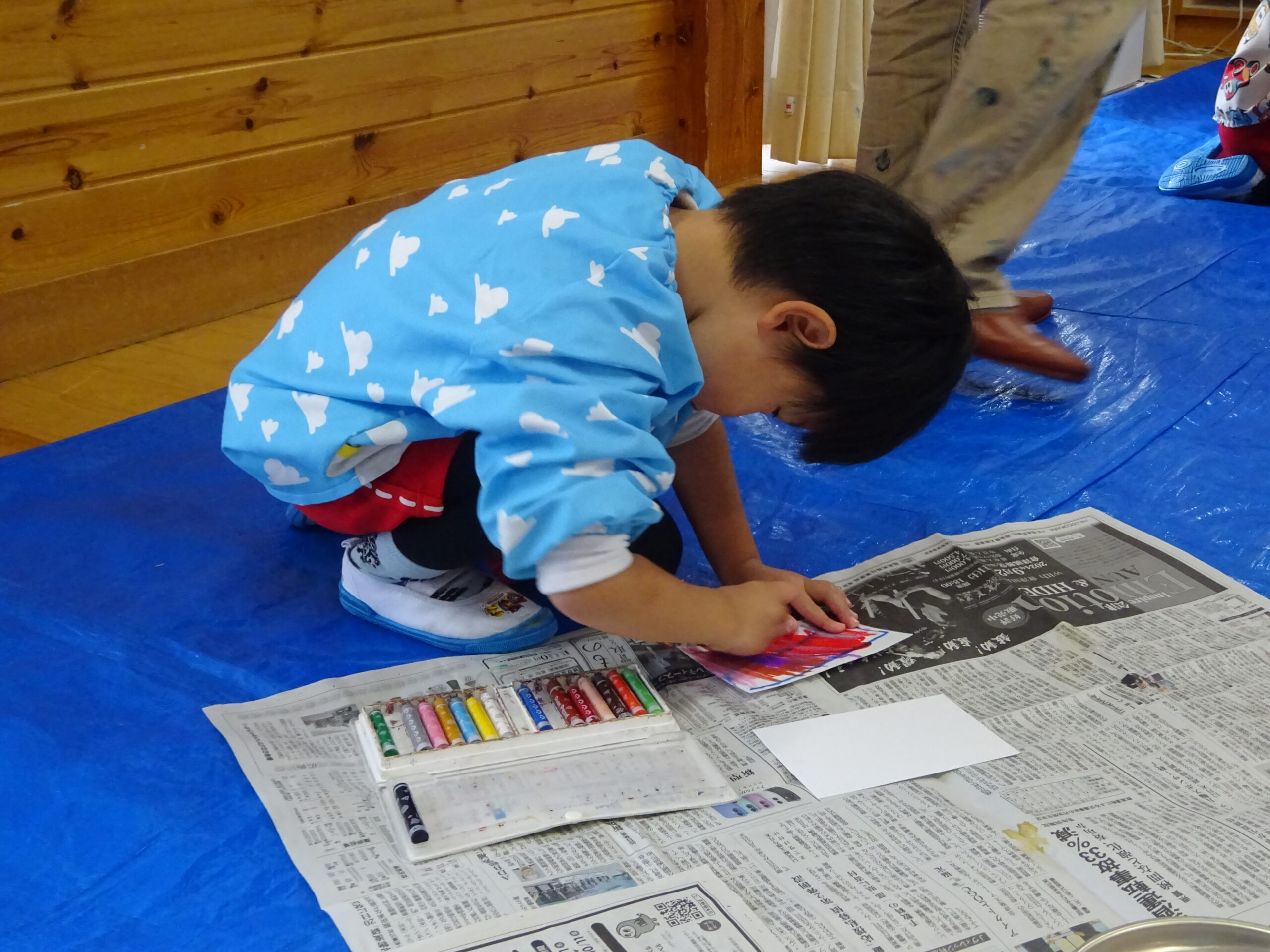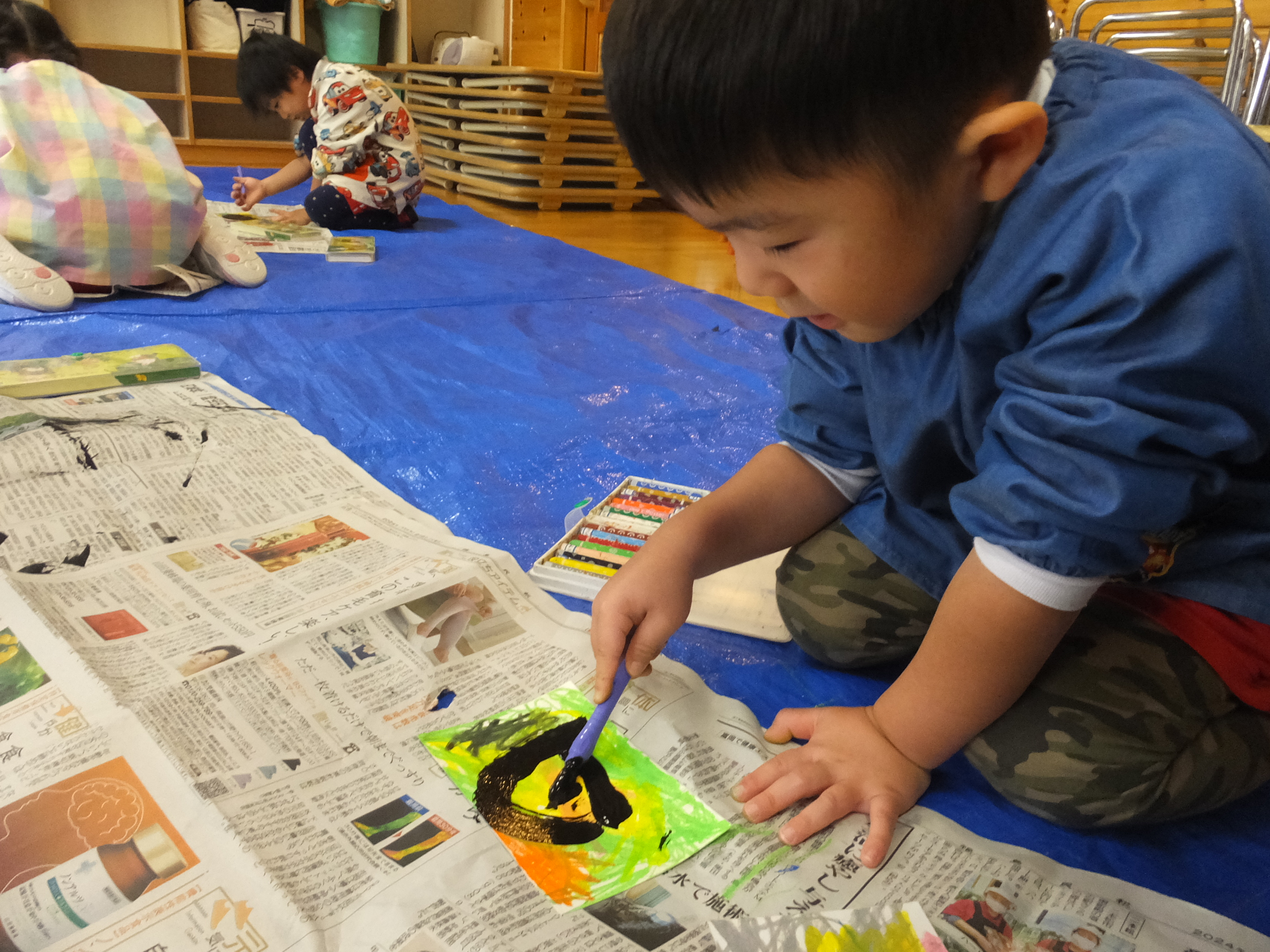 11月25日(火)に子ども達が楽しみにしていた絵画教室がありました。馬場先生からクレヨンの下の方を持って描くときれいに色が出ることを教えてもらい、はがき大の画用紙いっぱいに一人ひとり色を塗りました。その後、馬場先生がクレヨンで描いた上からアクリル絵の具で黒く塗りフォークで削るとカラフルな色が出てきて子ども達も「すごーい!」「きれい!」と前のめりで見ていました。子ども達も塗りつぶしたり、バスなどの絵を描いたりしてからフォークや枝を使ってスクラッチに挑戦!カラフルな模様が見えてくると「できた!みてー!」と嬉しそうな表情を見せていました😊