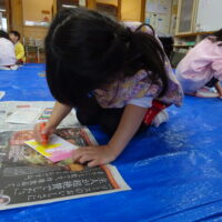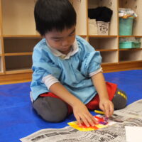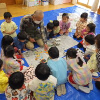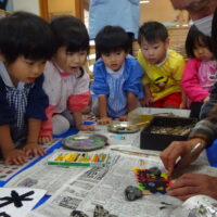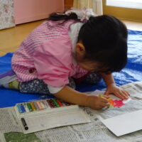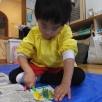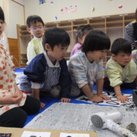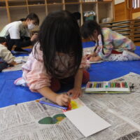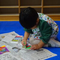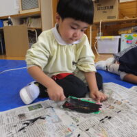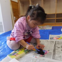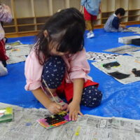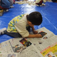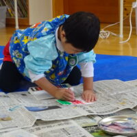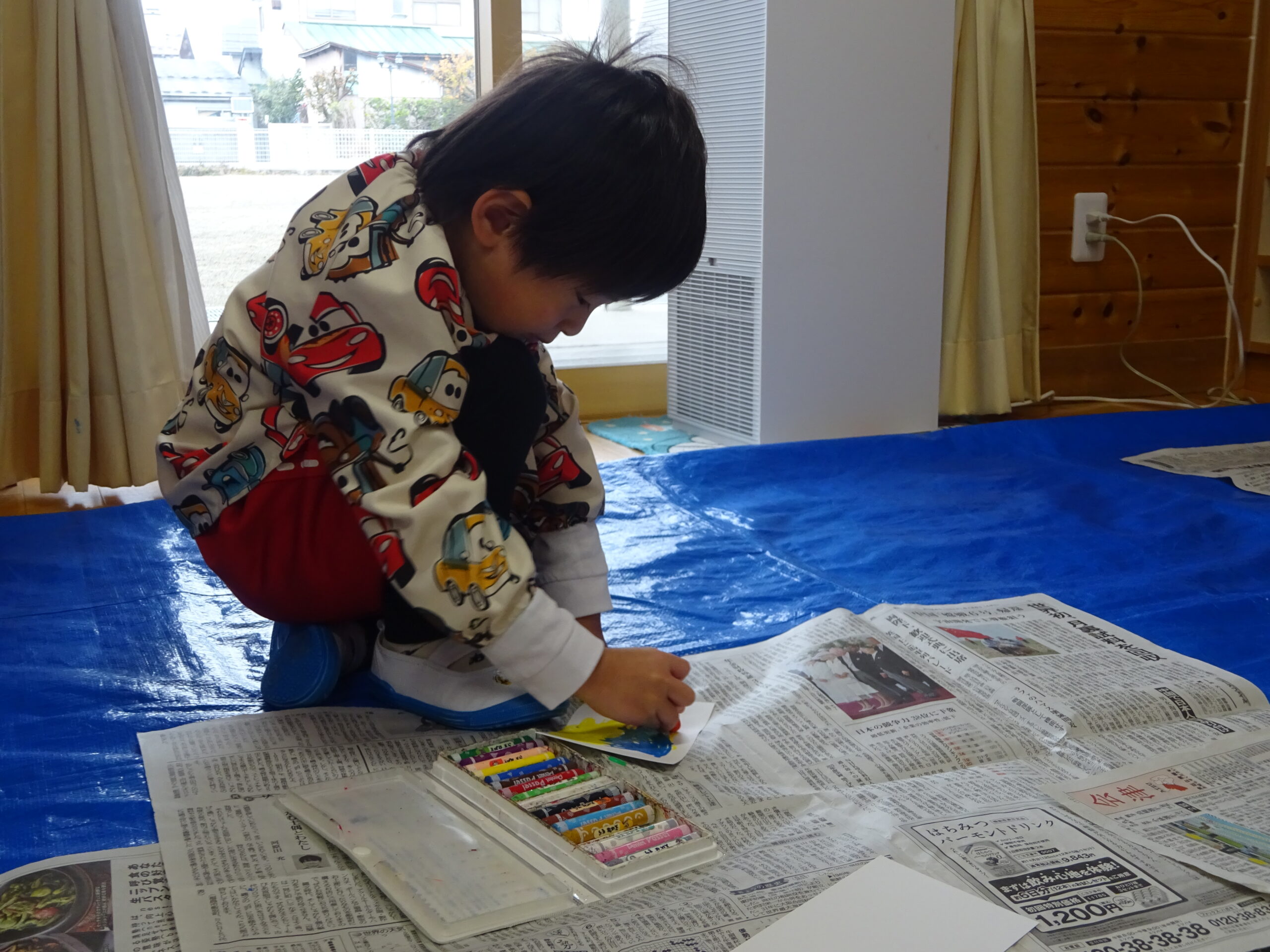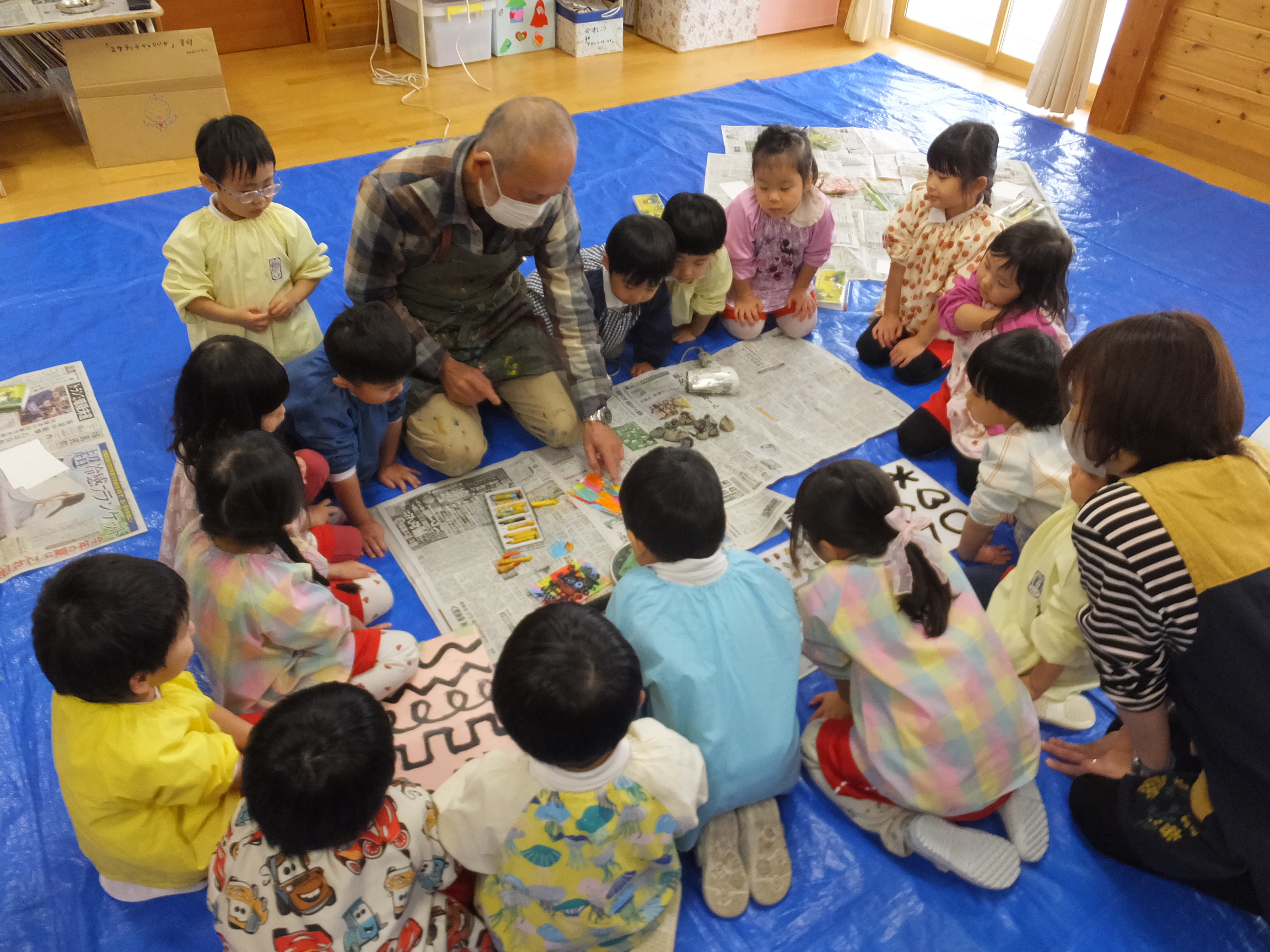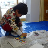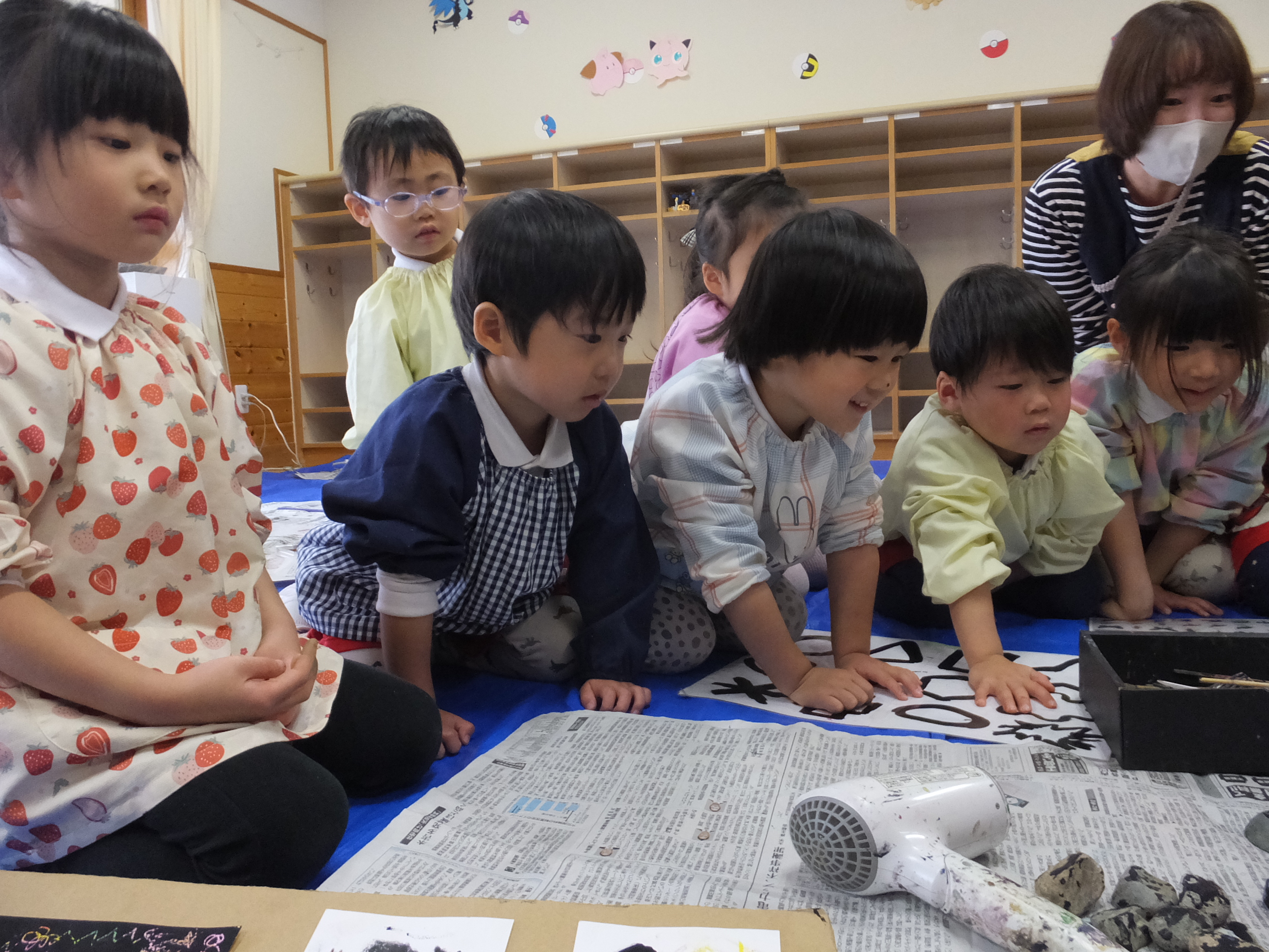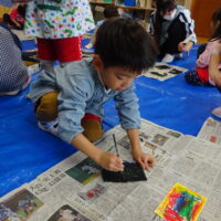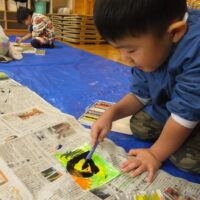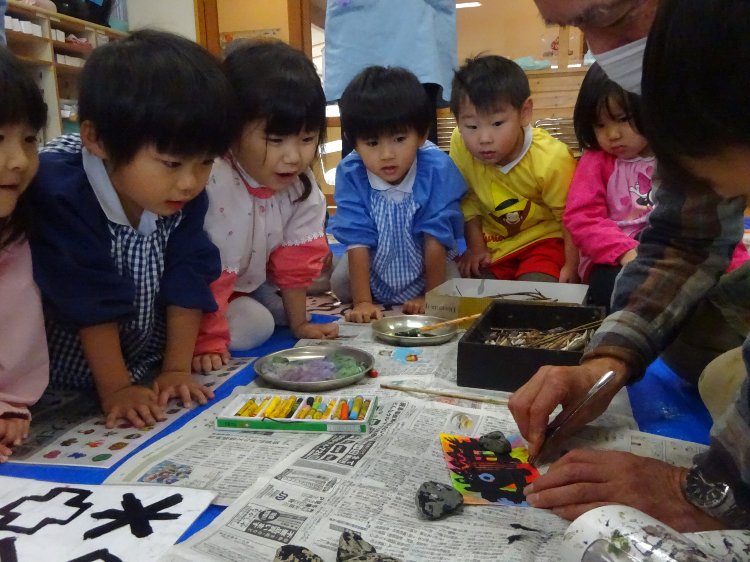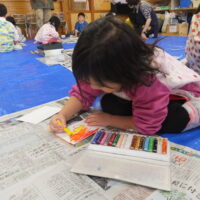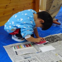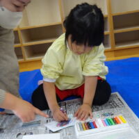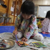11月25日(火)に子ども達が楽しみにしていた絵画教室がありました。馬場先生からクレヨンの下の方を持って描くときれいに色が出ることを教えてもらい、はがき大の画用紙いっぱいに一人ひとり色を塗りました。その後、馬場先生がクレヨンで描いた上からアクリル絵の具で黒く塗りフォークで削るとカラフルな色が出てきて子ども達も「すごーい!」「きれい!」と前のめりで見ていました。子ども達も塗りつぶしたり、バスなどの絵を描いたりしてからフォークや枝を使ってスクラッチに挑戦!カラフルな模様が見えてくると「できた!みてー!」と嬉しそうな表情を見せていました😊