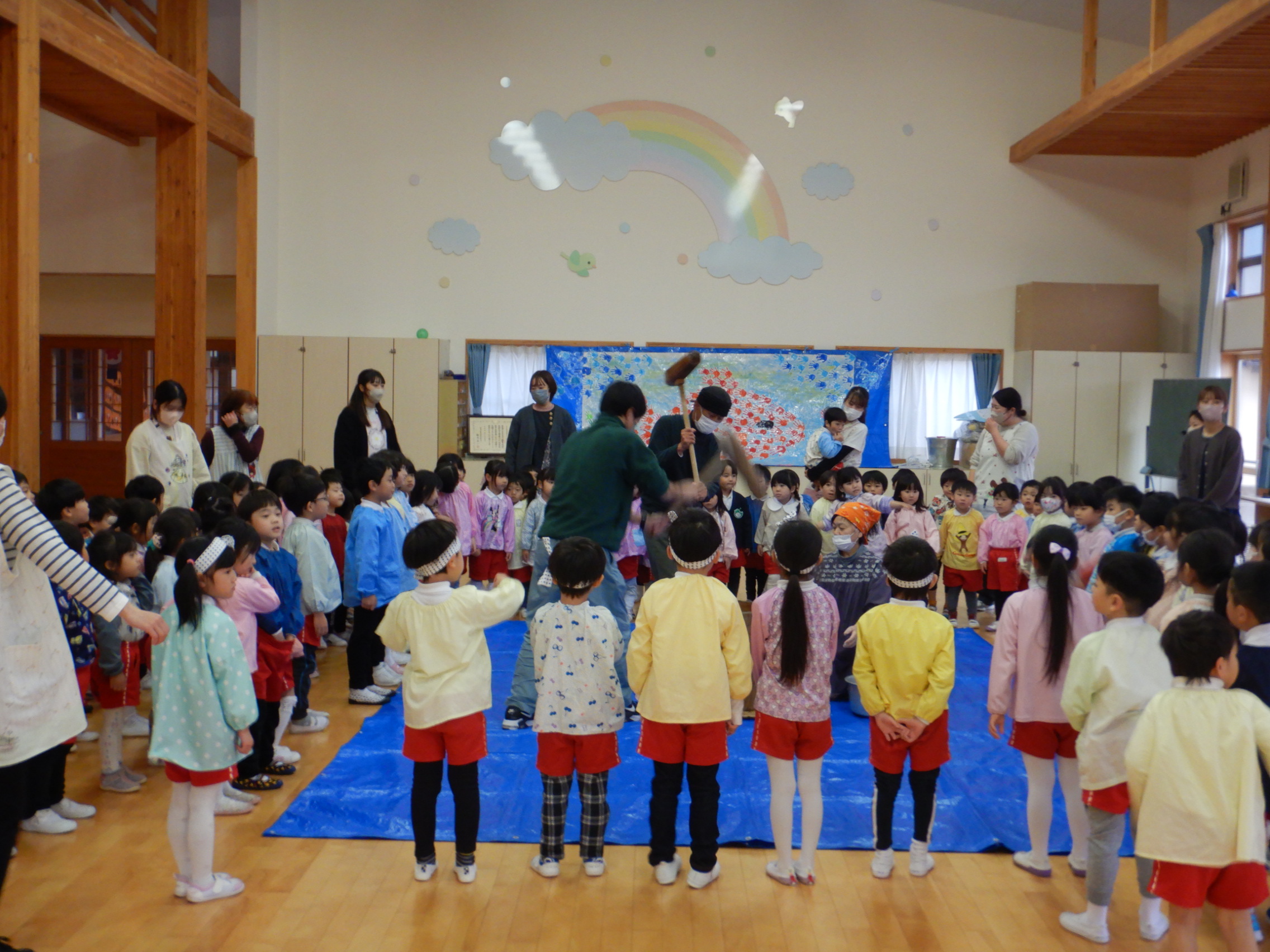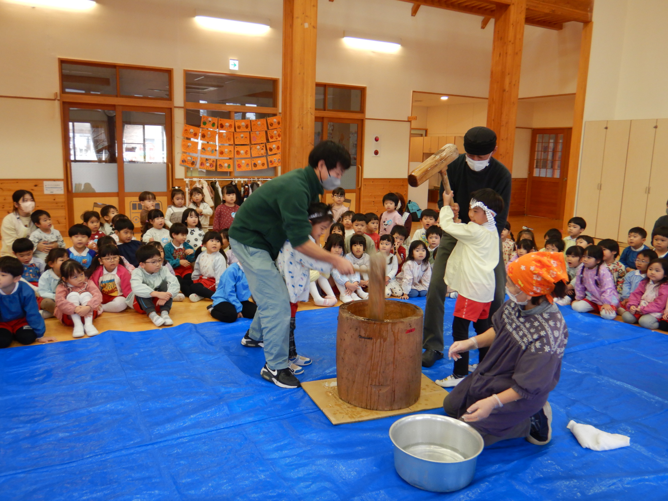 ホールの真ん中には大きな臼と杵があり、“どうやっておもちができるのかなぁ?”とワクワクした様子😊