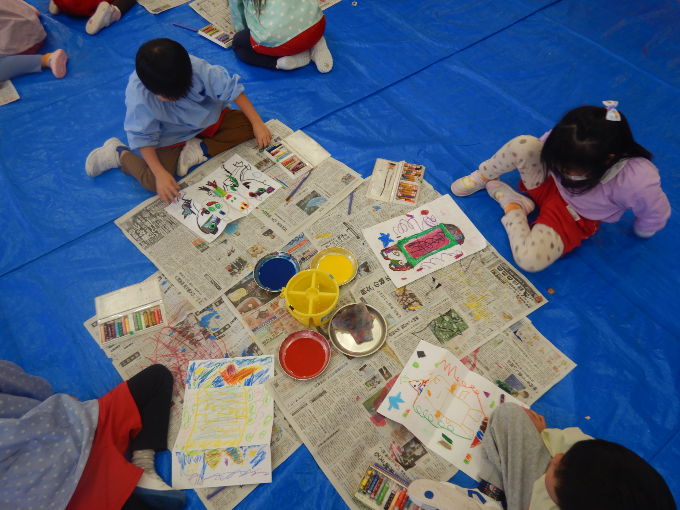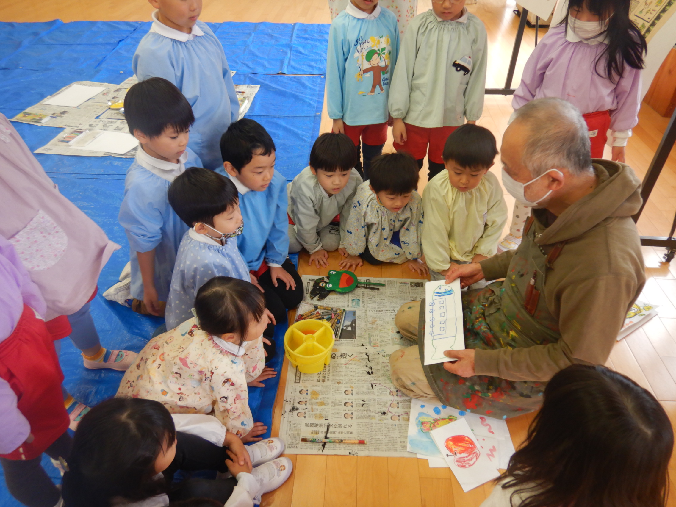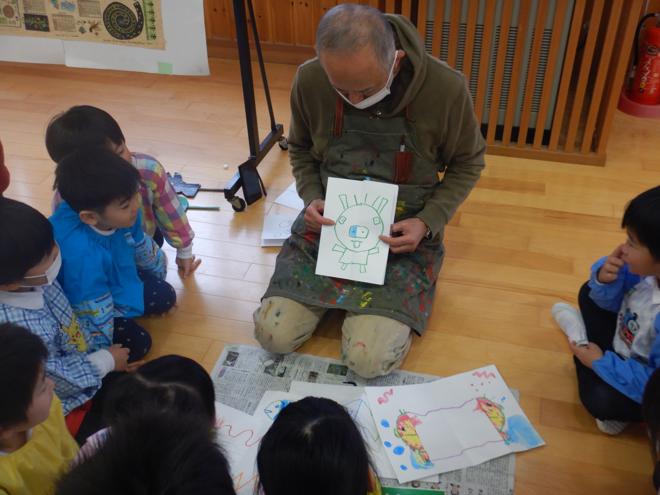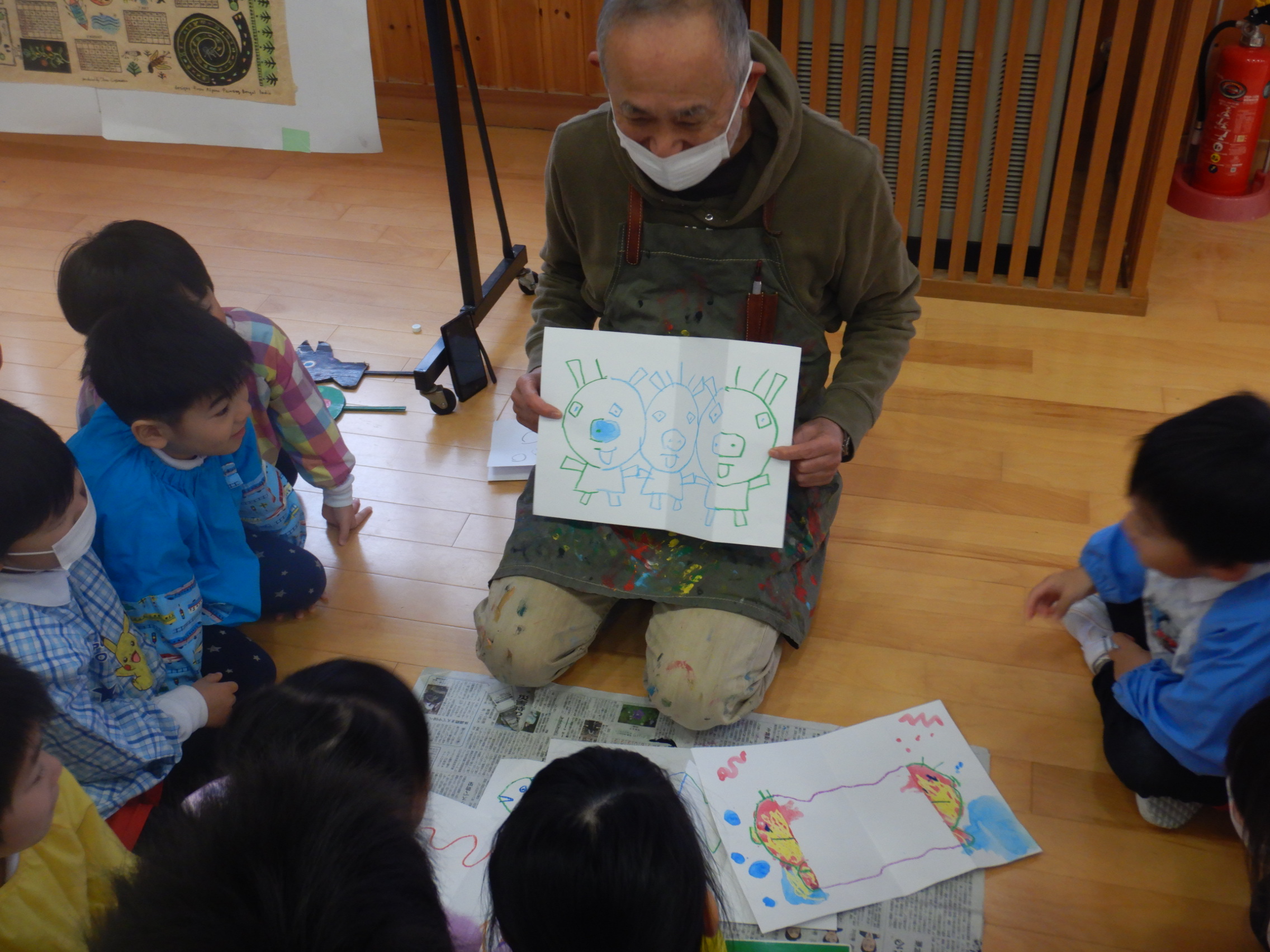 12月8日(月)に「Z折りの絵は楽しいよ!」という題材で馬場先生ご指導のもと、年長児で絵画教室を行いました。