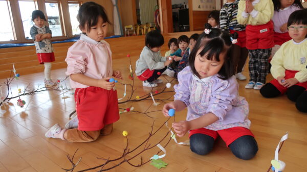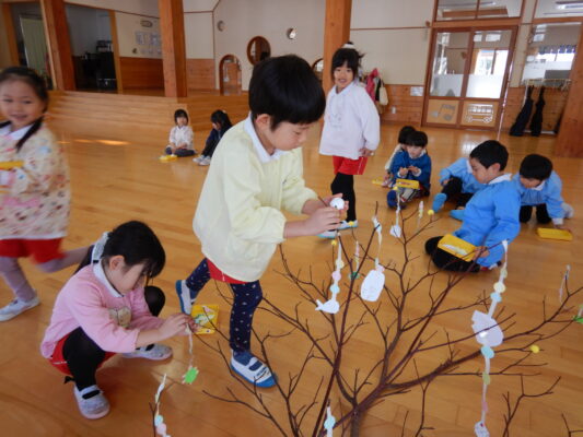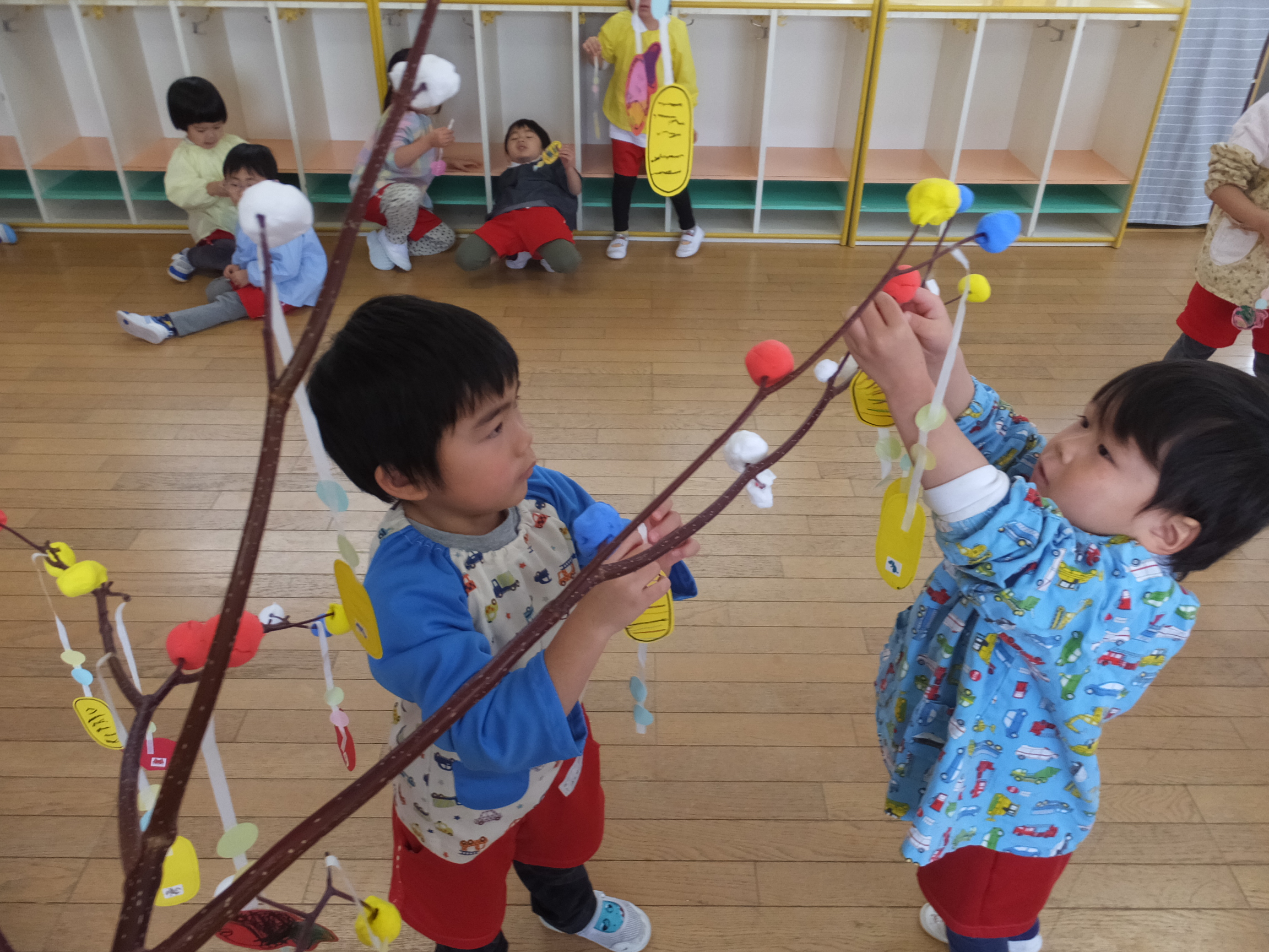 出来上がった飾りと団子は、学年ごとに大きなみず木に飾りました。