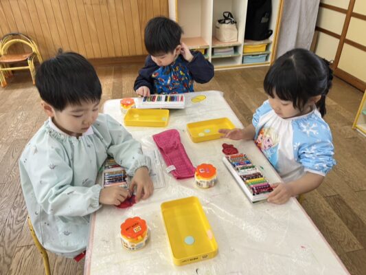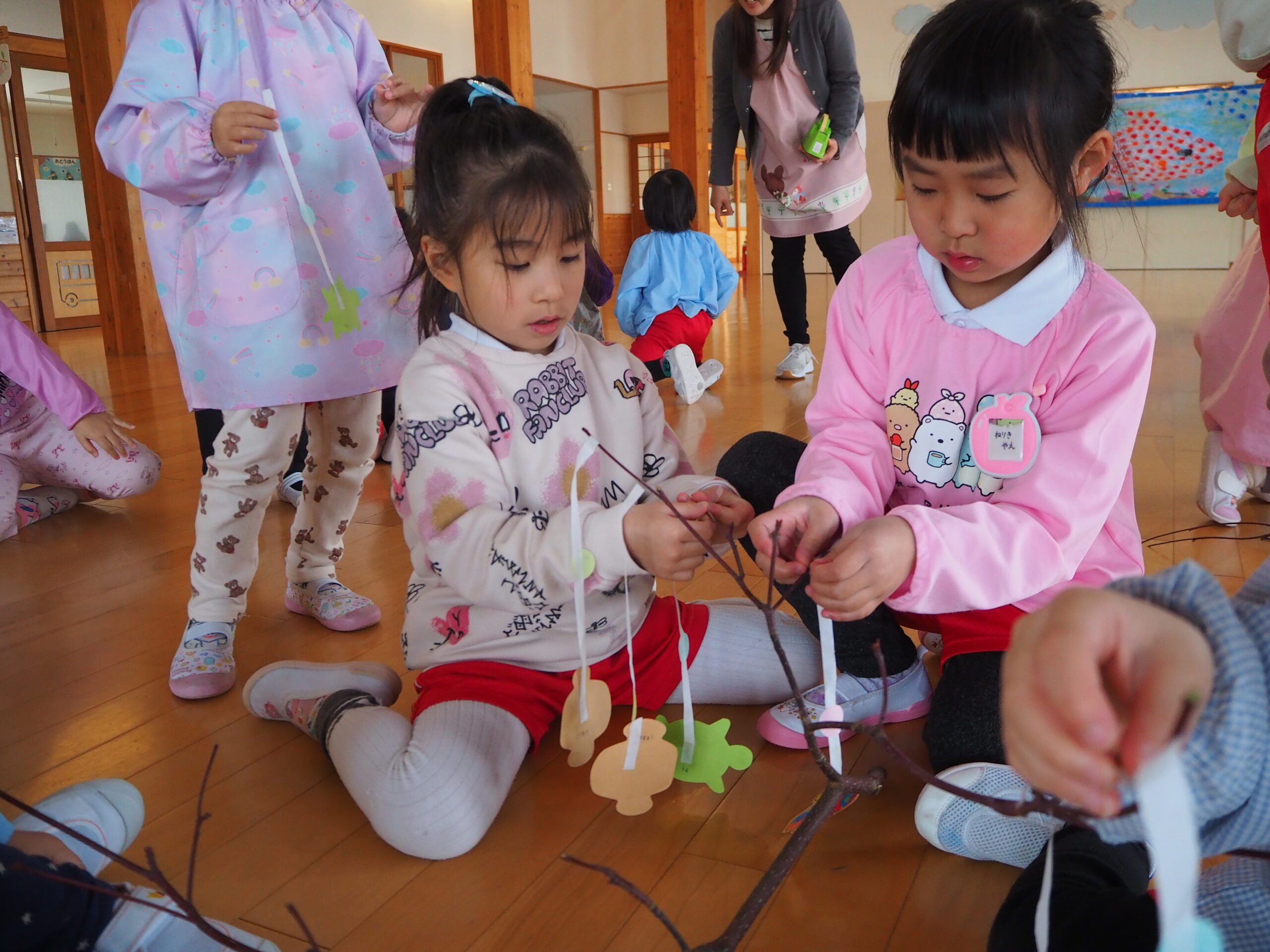 飾りは年少さんが鯛と小判、年中さんは亀と小槌から好きな飾りを選んで色を塗り、
