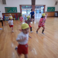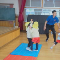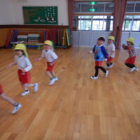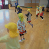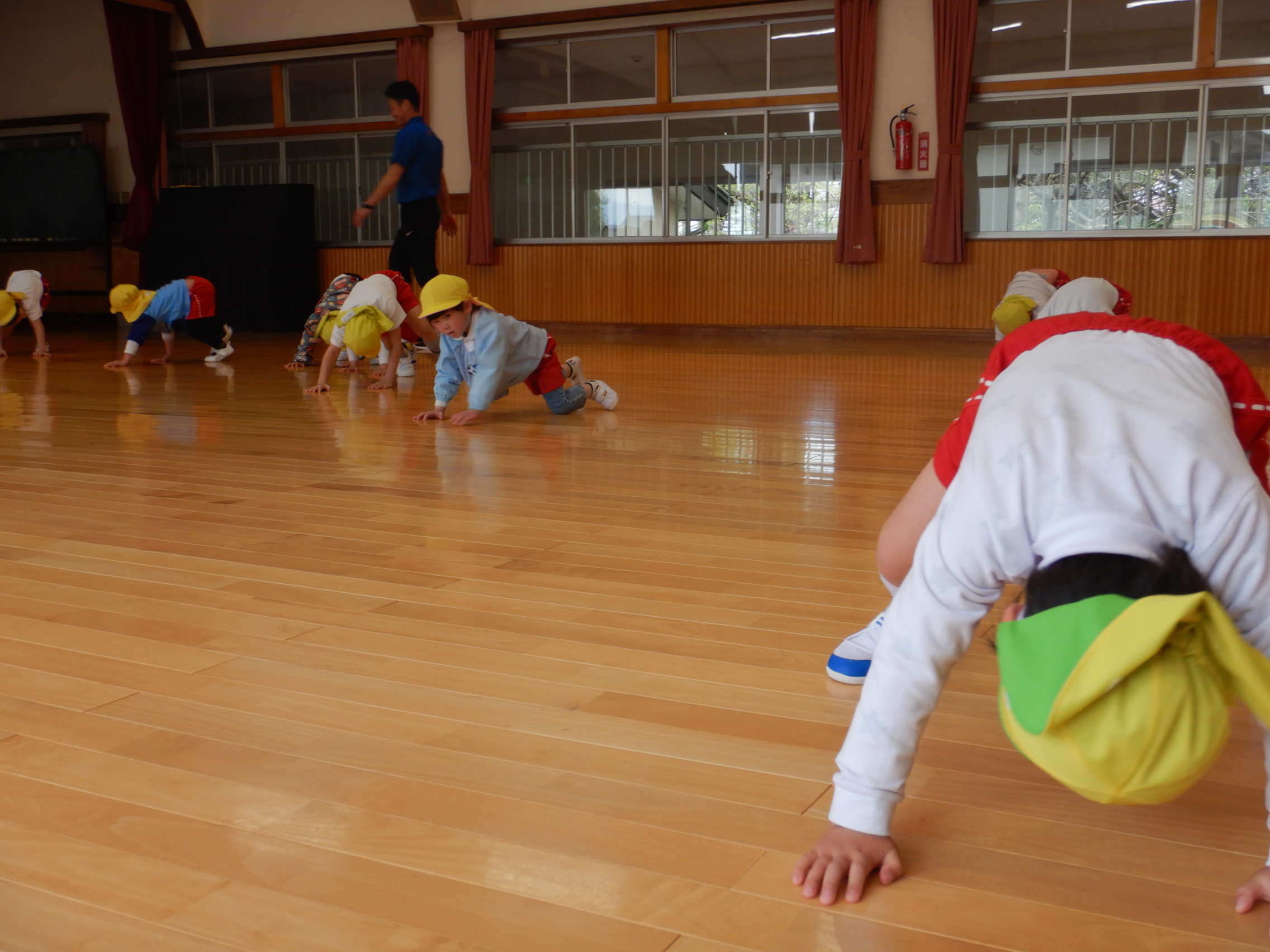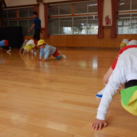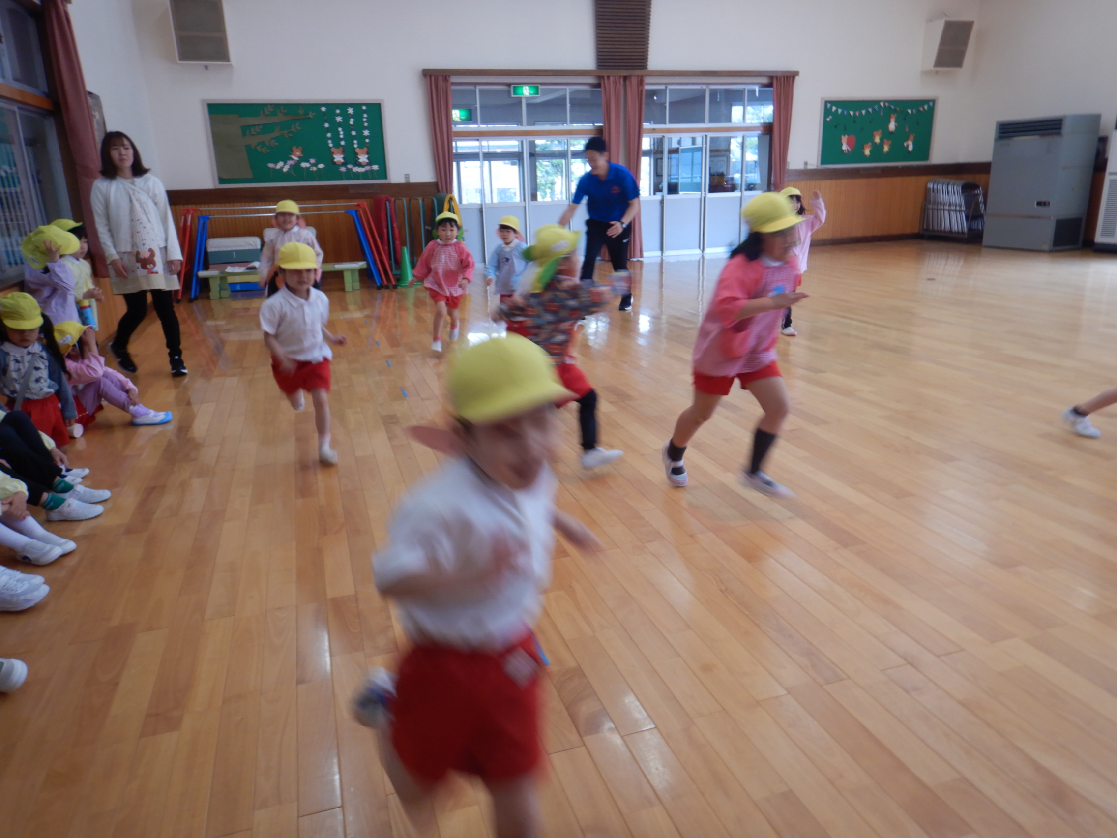 2つのチームに分かれてうさぎ(両足をくっつけてジャンプ)やくま(膝を床につかないで四つん這いで歩く)など、子ども達も良く知っている動きで、おいしいご飯(うさぎは人参🥕、くまはお肉🍖など)を持って待っている友達ところまで全速力!