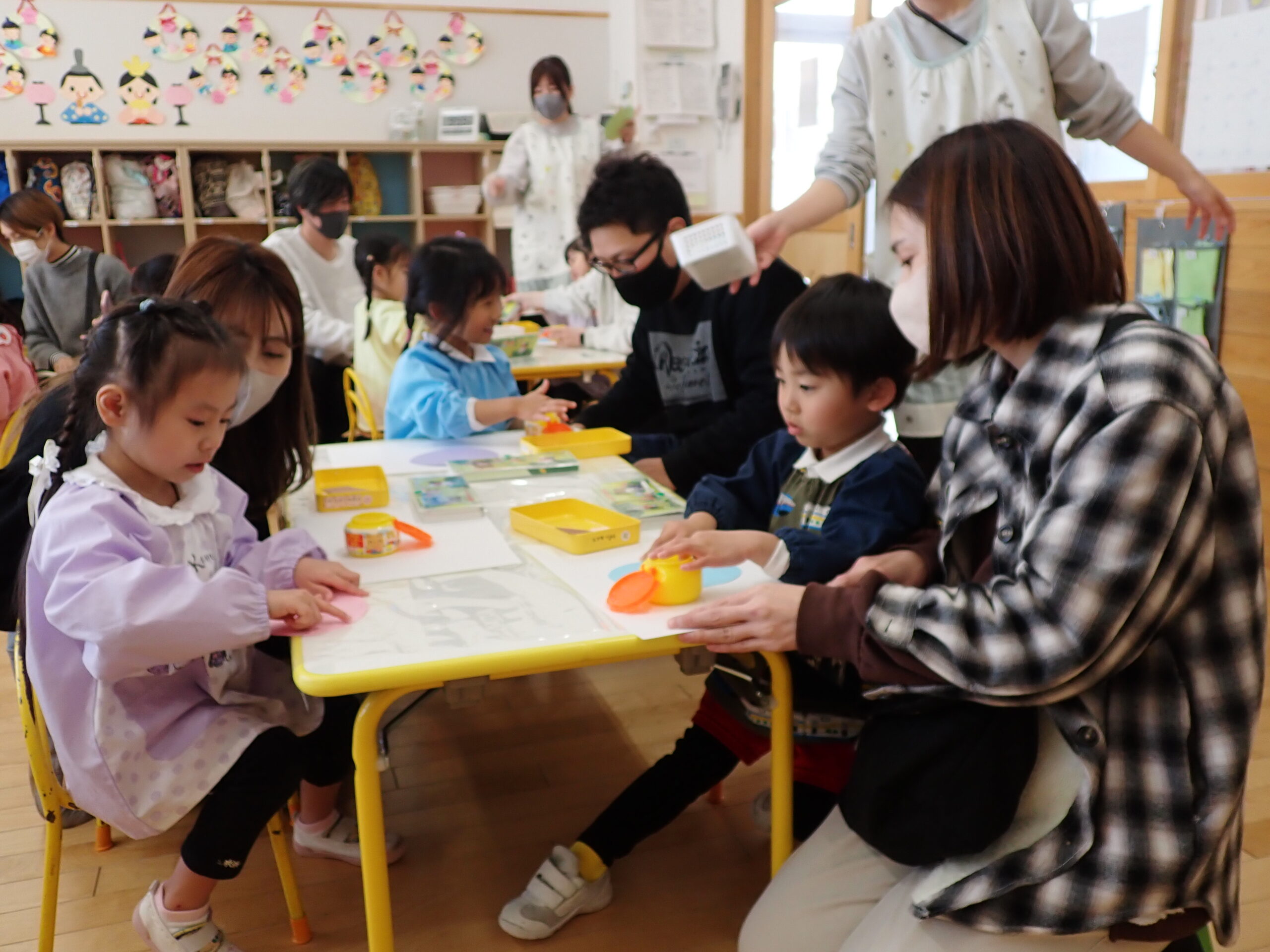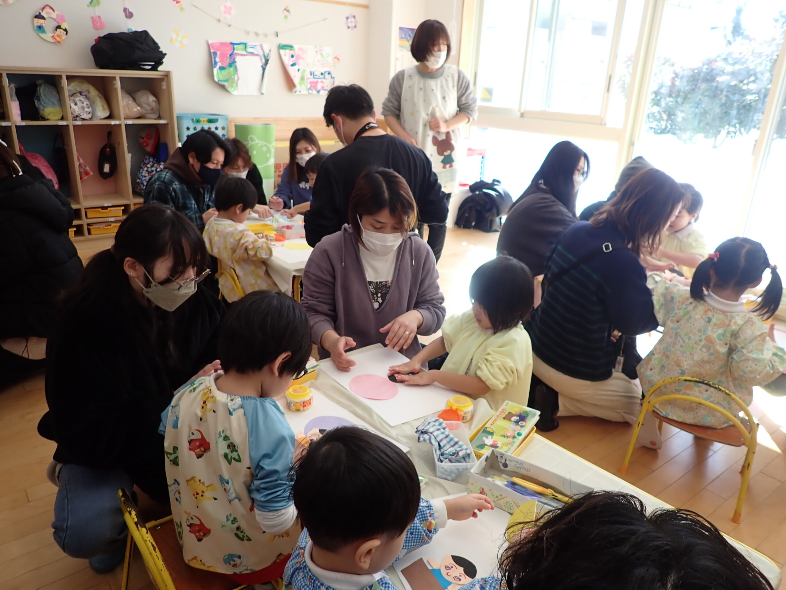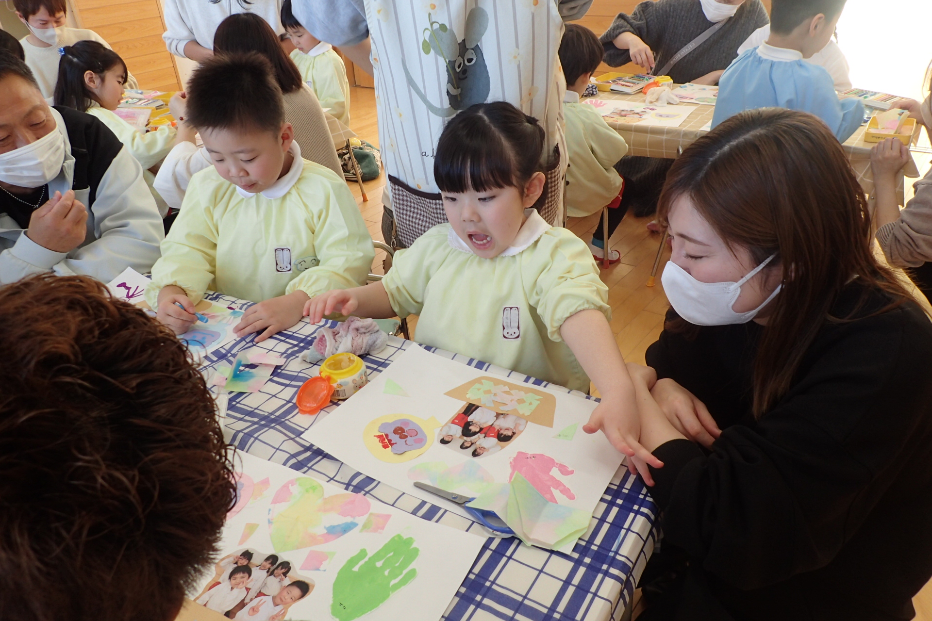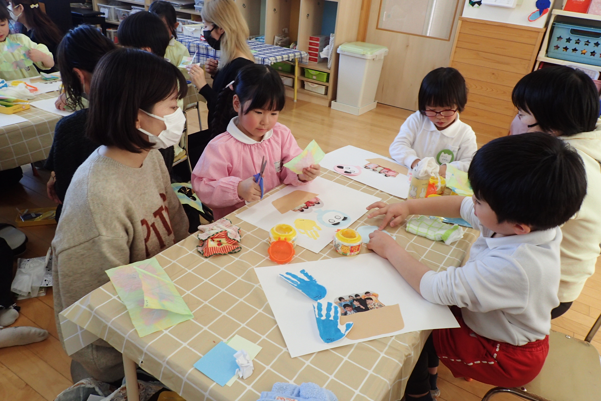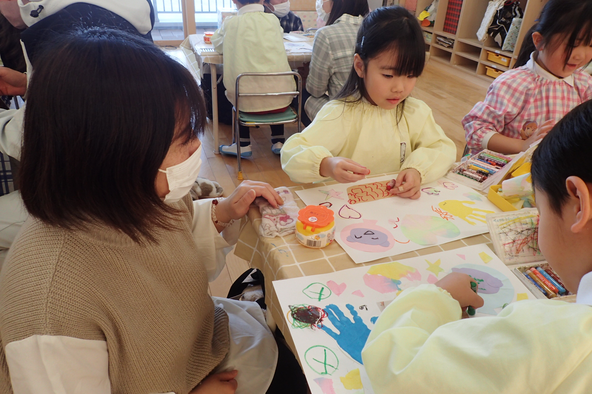 参観がスタートすると各クラスから元気な歌声🎵や挨拶が聞こえてきましたよ。年少、中組は「おもいでの表紙」を親子で製作しました。お子さんのリクエストに答えながらお家の方が製作したり、お子さんが製作している様子をお家の方が温かい眼差しで見守ってくださったりと終始温かい空気が流れていました💗年中さんは完成した作品をちょっぴり照れながらも嬉しそうに見せてくれました。