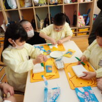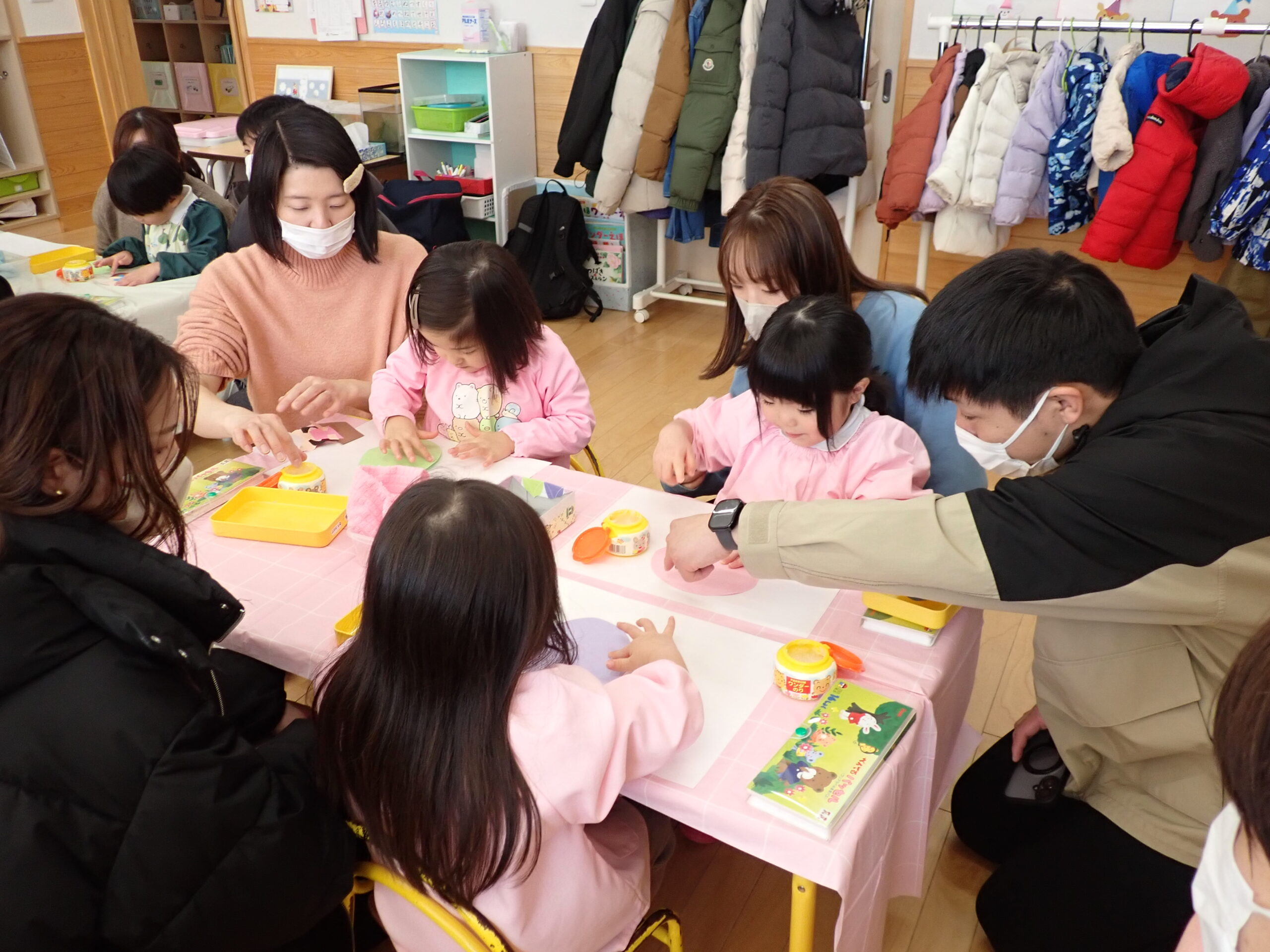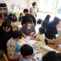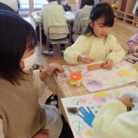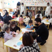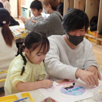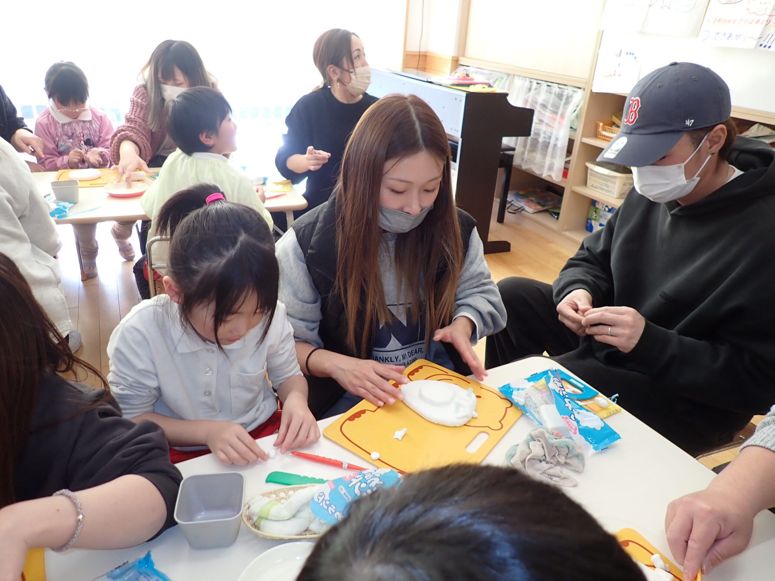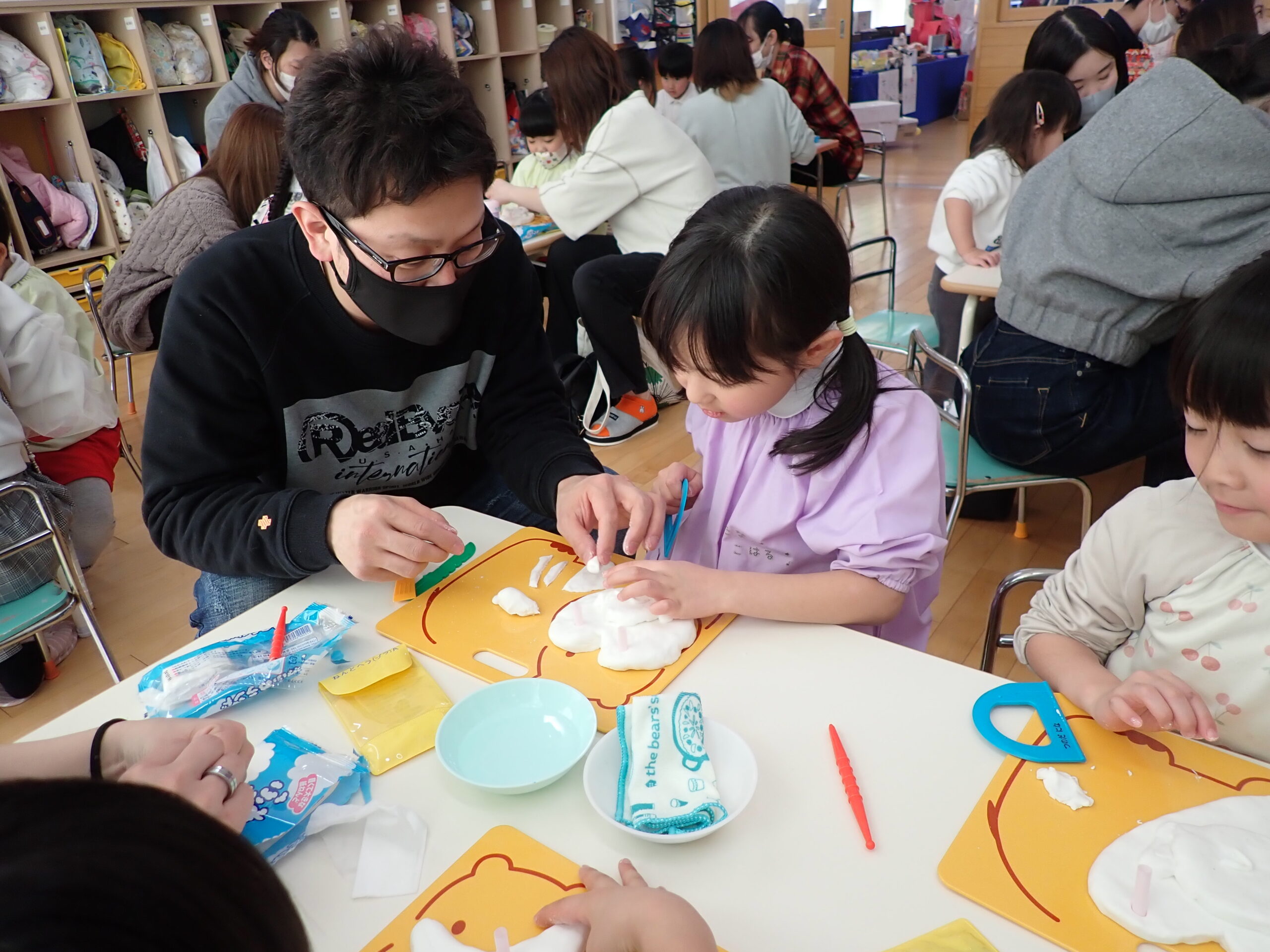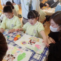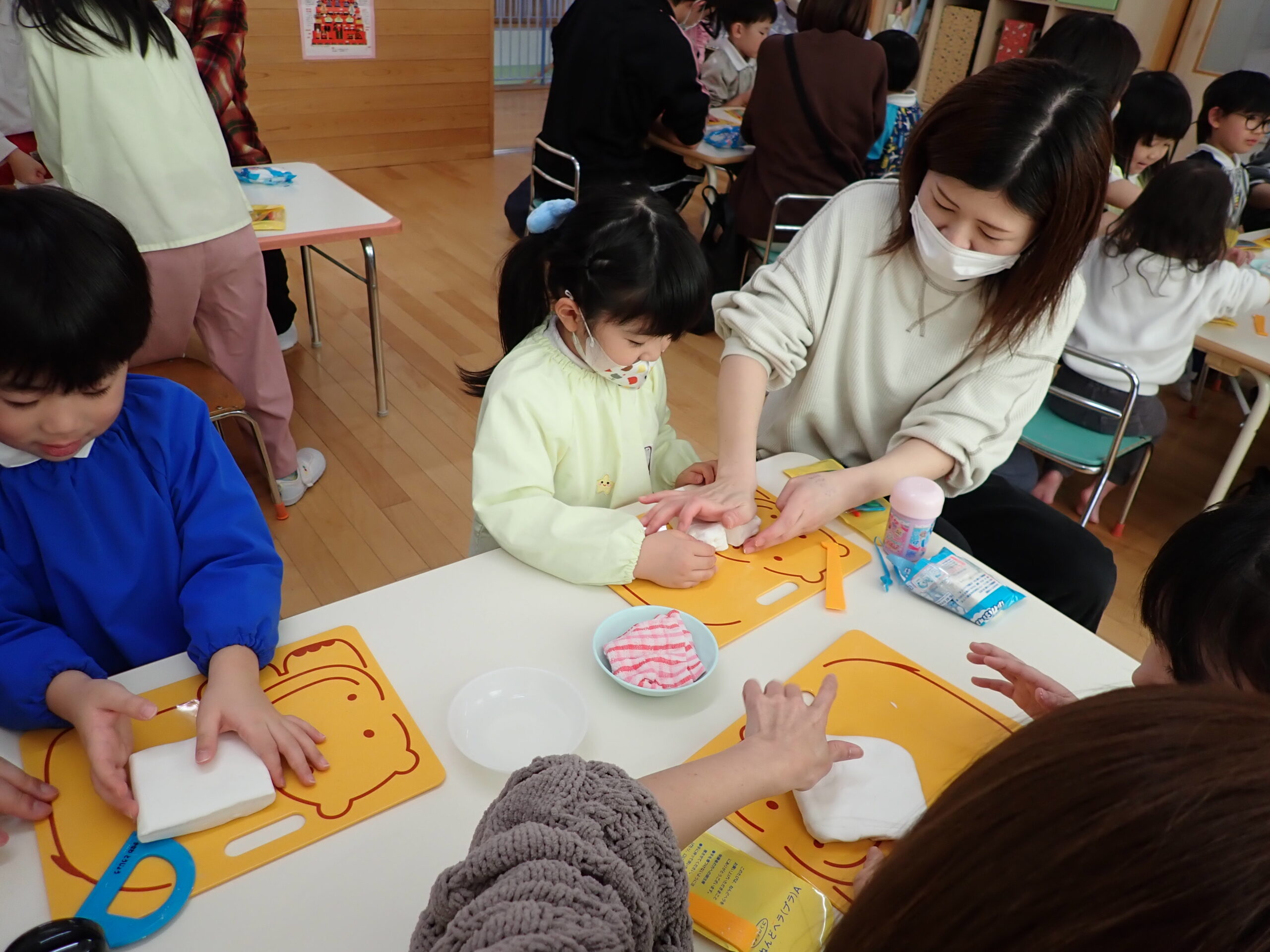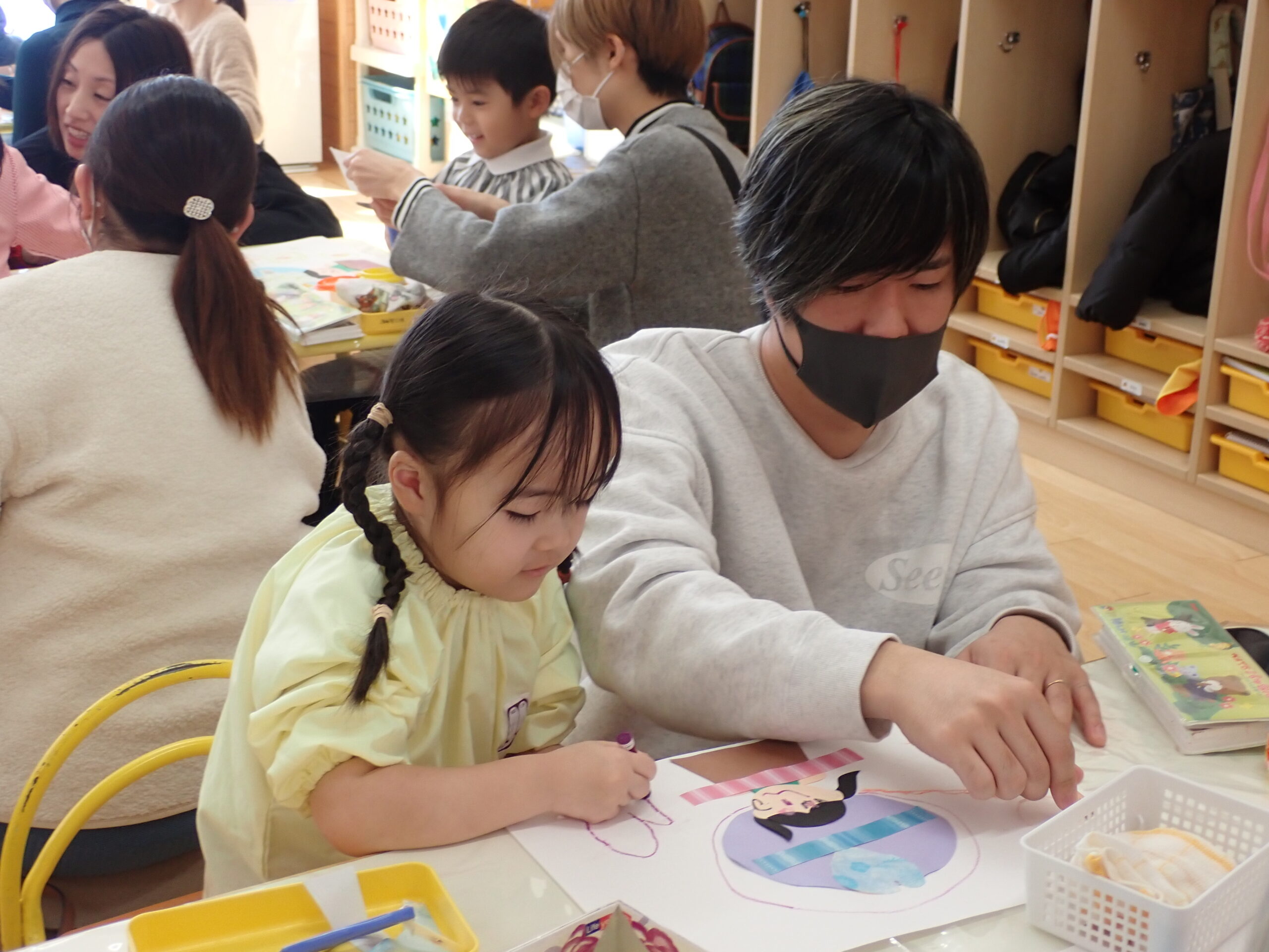 参観がスタートすると各クラスから元気な歌声🎵や挨拶が聞こえてきましたよ。年少、中組は「おもいでの表紙」を親子で製作しました。お子さんのリクエストに答えながらお家の方が製作したり、お子さんが製作している様子をお家の方が温かい眼差しで見守ってくださったりと終始温かい空気が流れていました💗年中さんは完成した作品をちょっぴり照れながらも嬉しそうに見せてくれました。