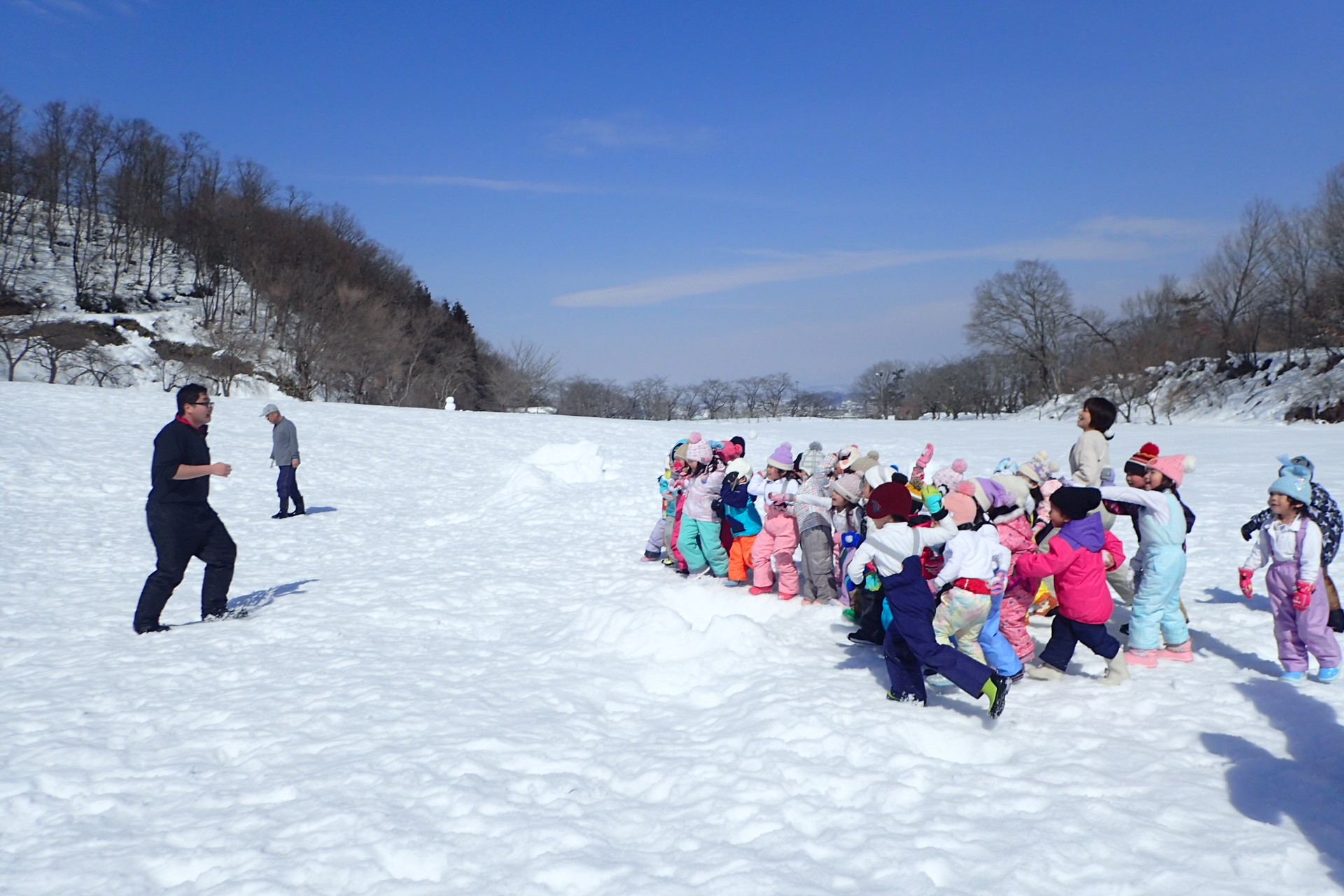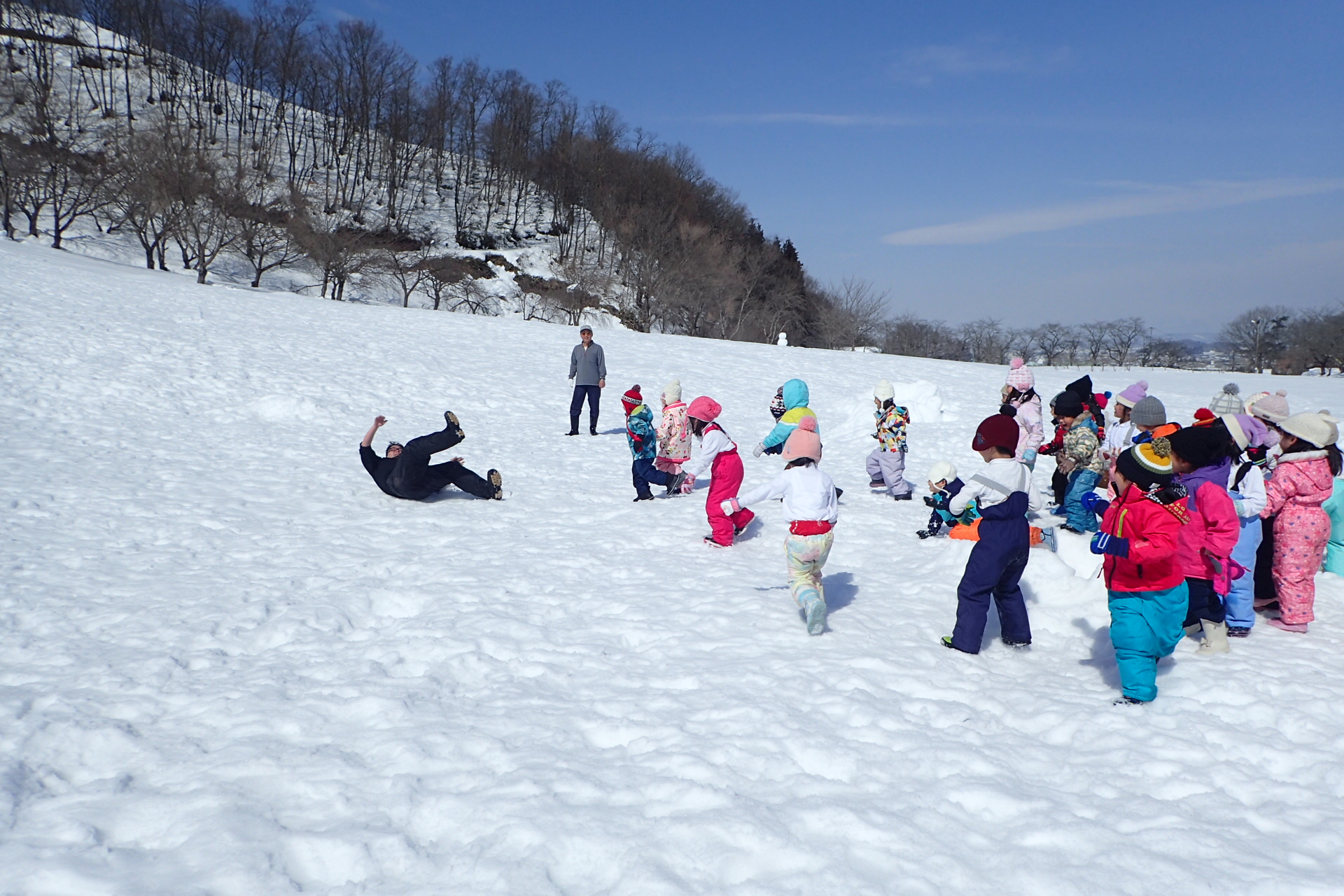 最後は何やらみんなで作戦会議…「あきらせんせい~」と呼んだら雪玉をあてて晶先生を驚かす作戦のようです。みごとに晶先生にたくさんの雪玉が命中!晶先生は驚いて倒れてしまいました。作戦大成功✌
