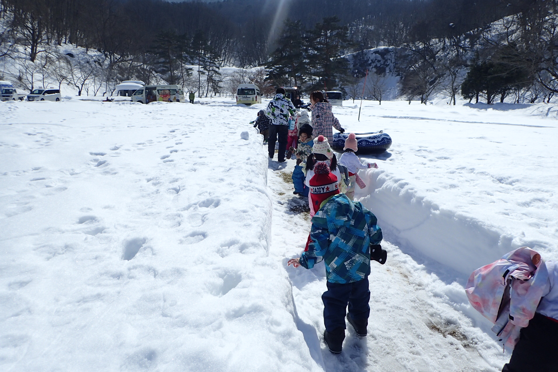 準備をしたら、バスに乗って子どもの森へ出発🚌今年は雪がたくさん降って子どもの森にはまだまだ50センチ以上もの雪が積もっていました☃除雪された一本道をみんなで歩いているだけでも楽しい!!ワクワクが止まらない様子の子ども達!