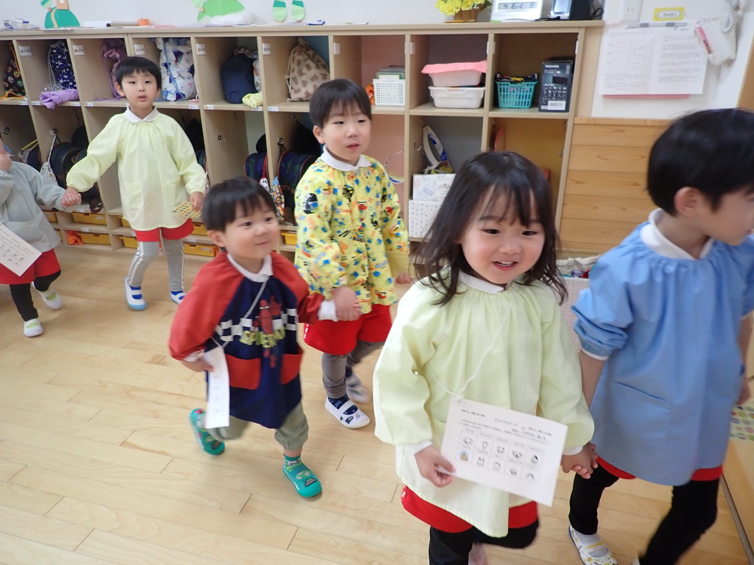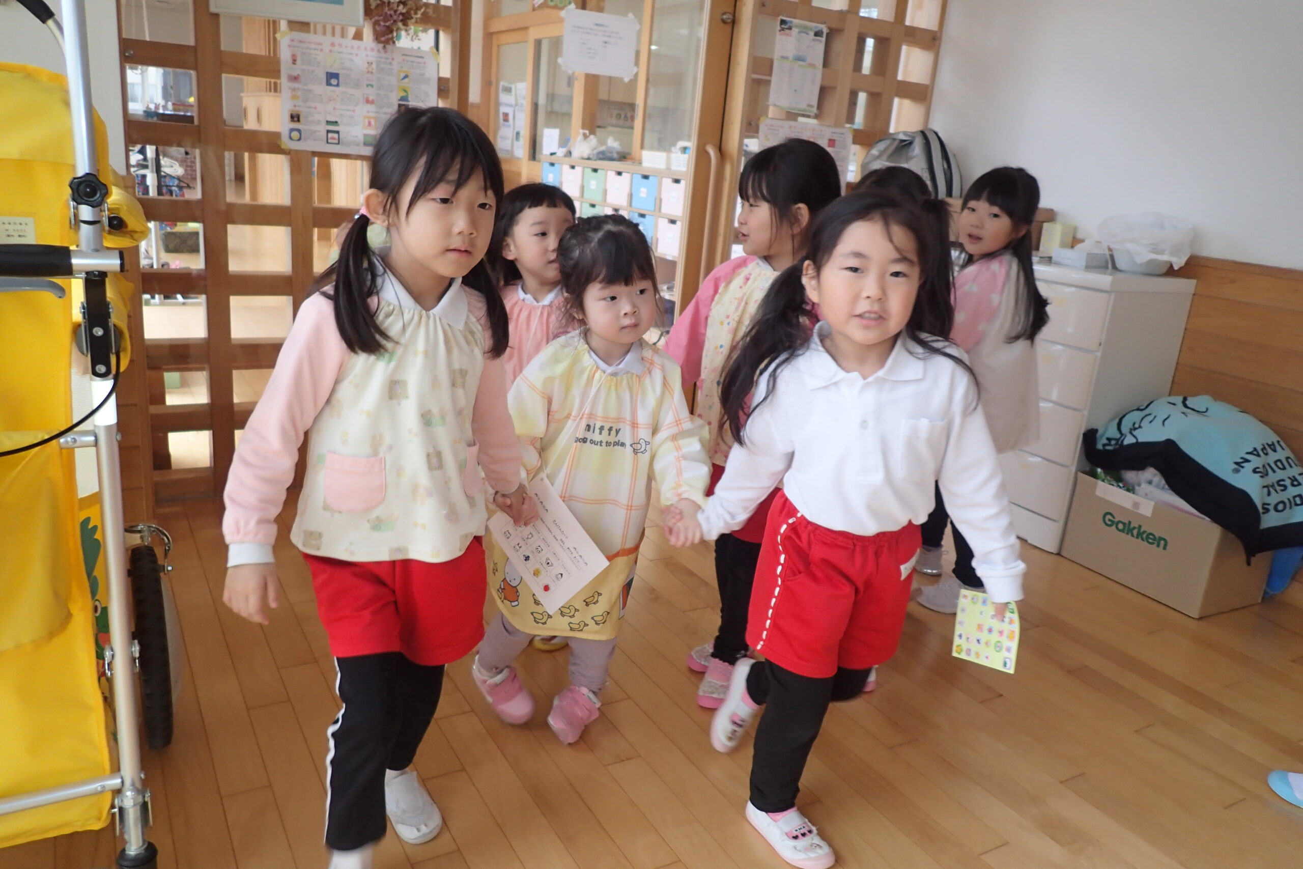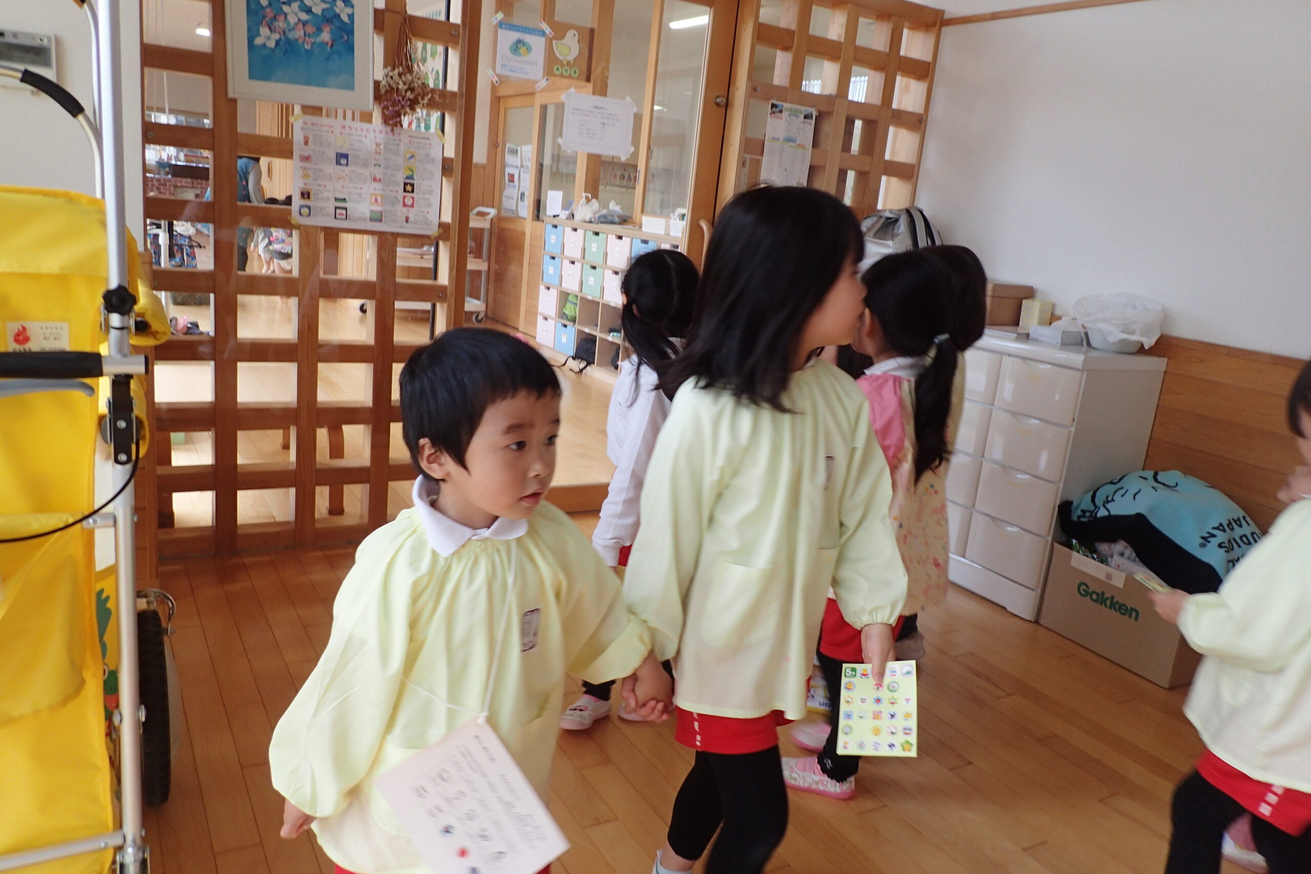年長さんにも手伝ってもらい、りす組さんはきりん組さんと、うさぎ組さんはぞう組さんと手をつなぎ「たんけんカード」をもって元気に出発!🏃