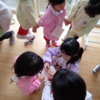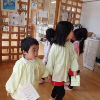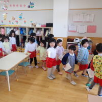 入園式から1週間が過ぎ、年少さんも少しずつ園生活に慣れ、クラスや玄関、水道の場所や使い方を覚えてきました