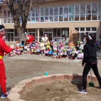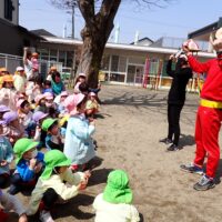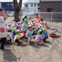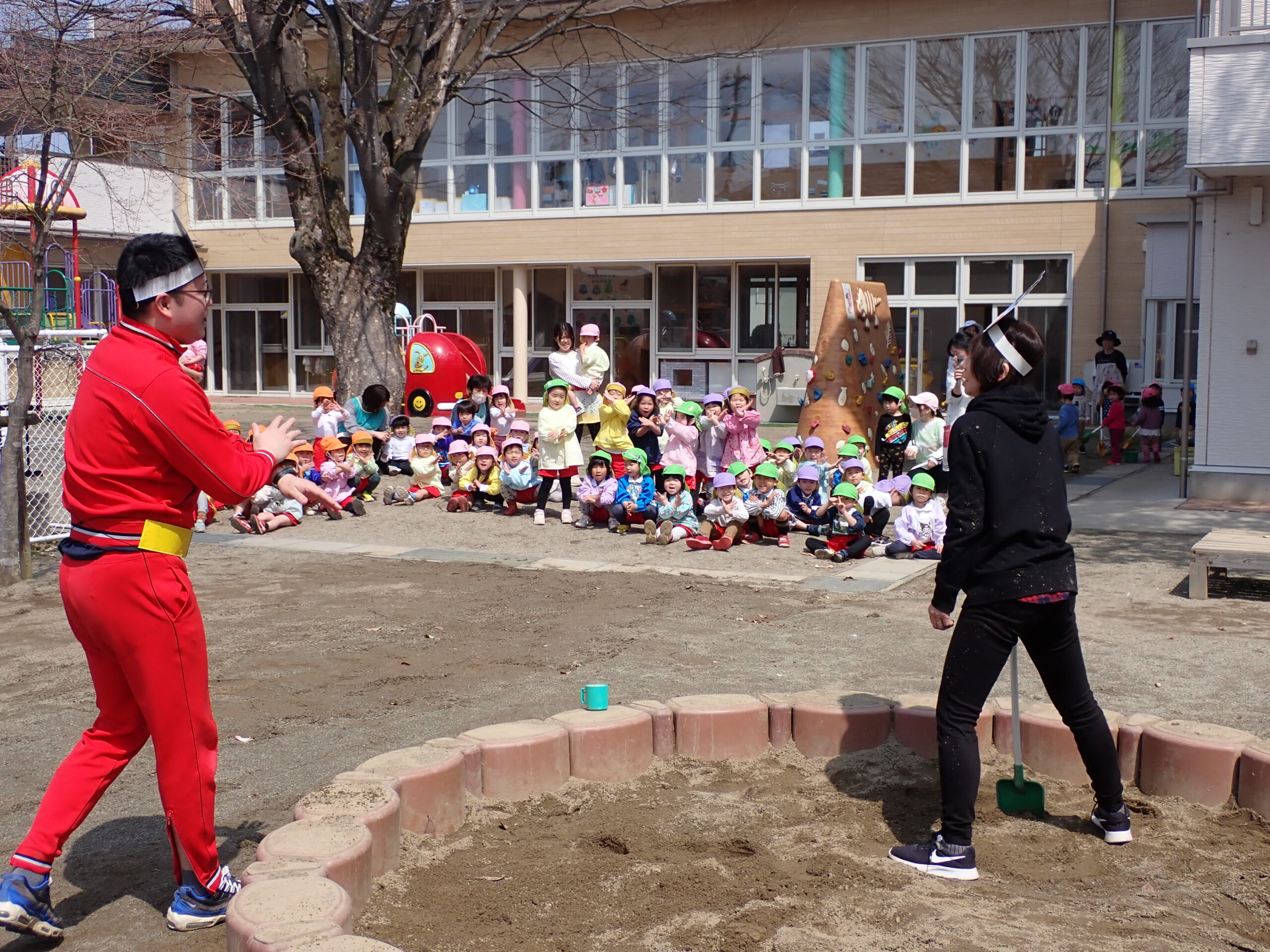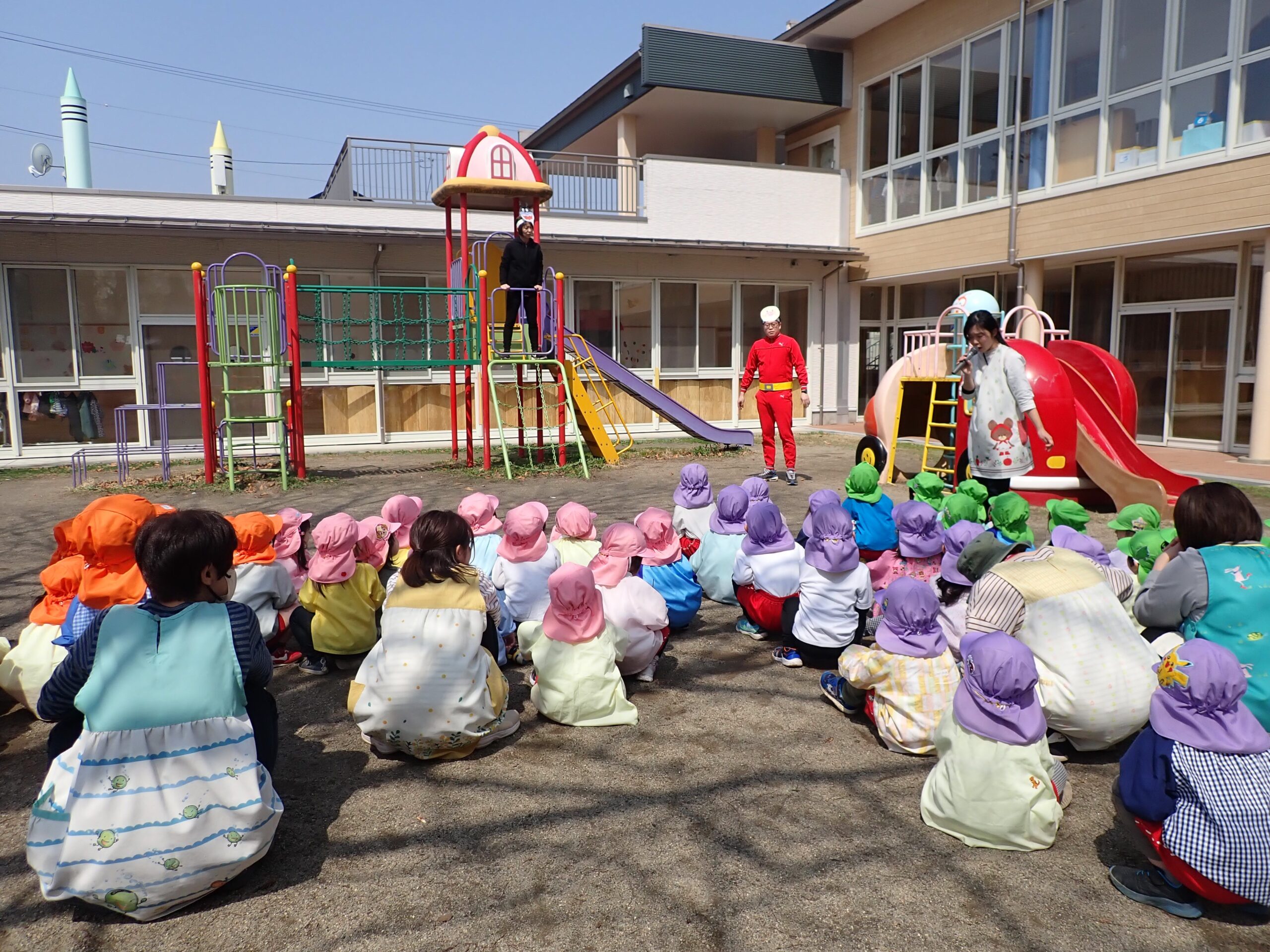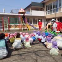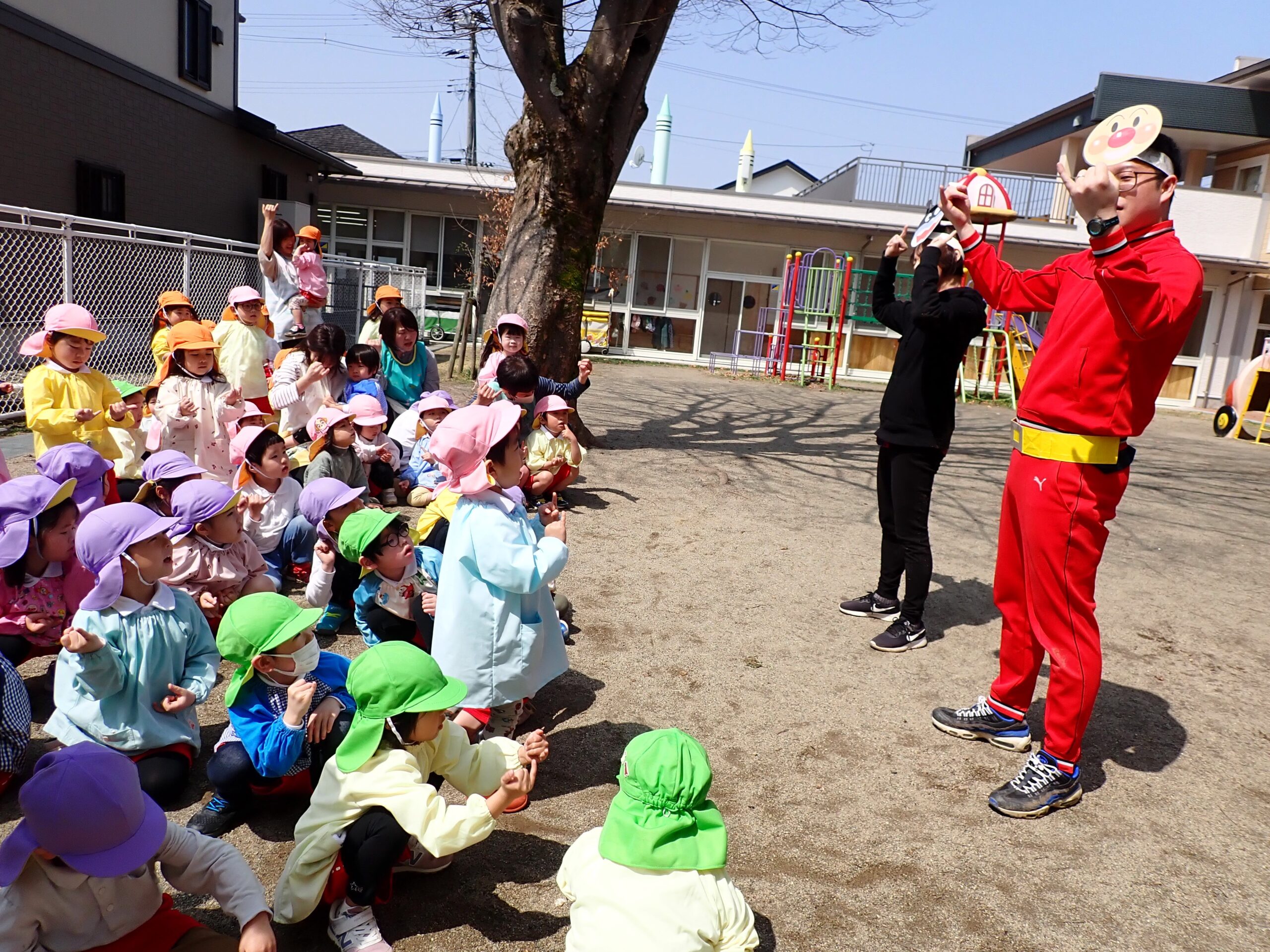 年少組さん・年中組さんが園庭に集まり、アンパンマン・バイキンマンと一緒にすべり台や砂場での遊び方を確認しました。