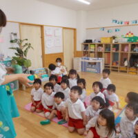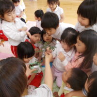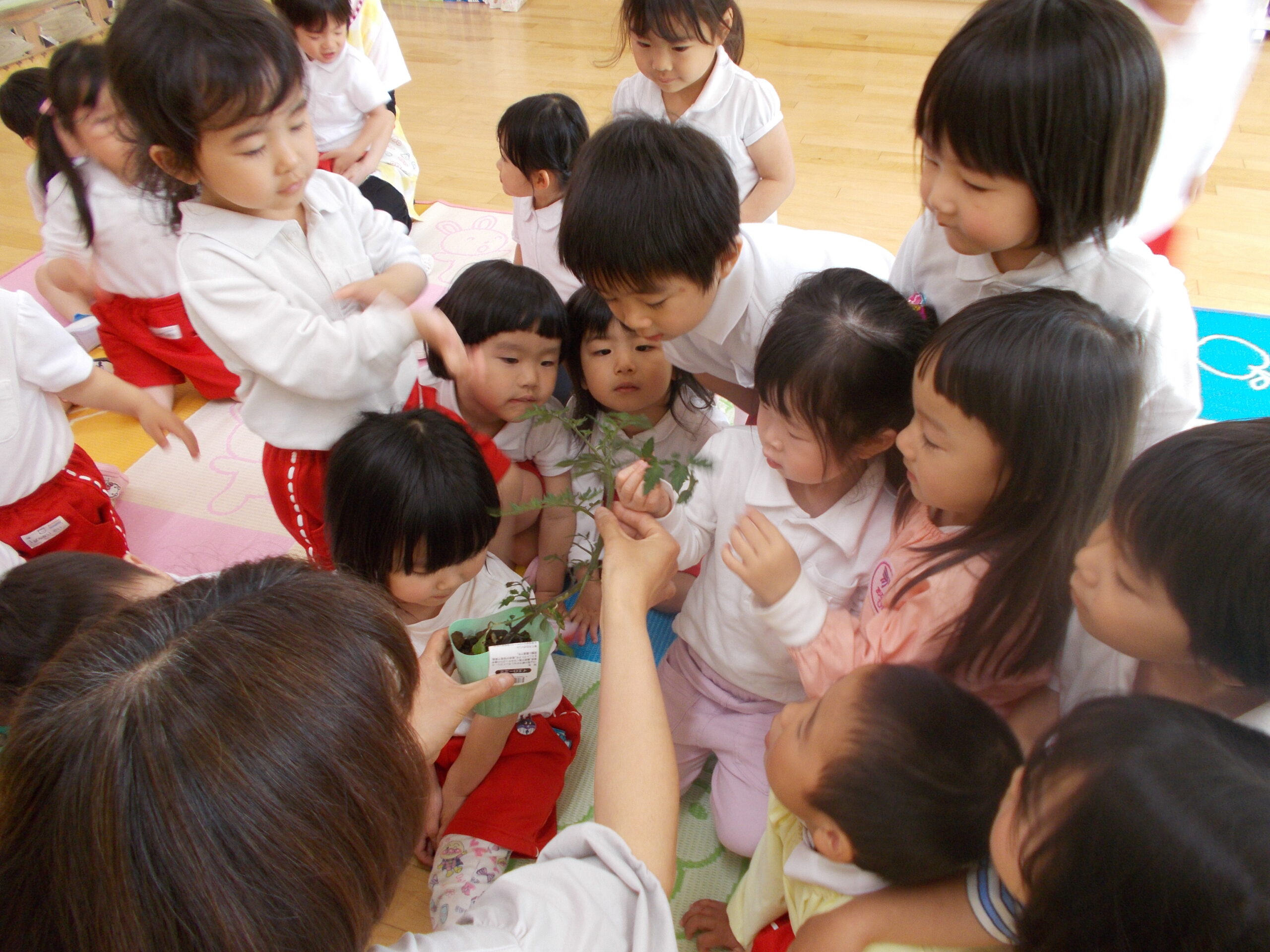 「ピーマン!」「トマト!」「じゃがいも!」といろいろな答えが返ってきました。葉っぱを触り、においをかいでみると・・・
