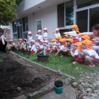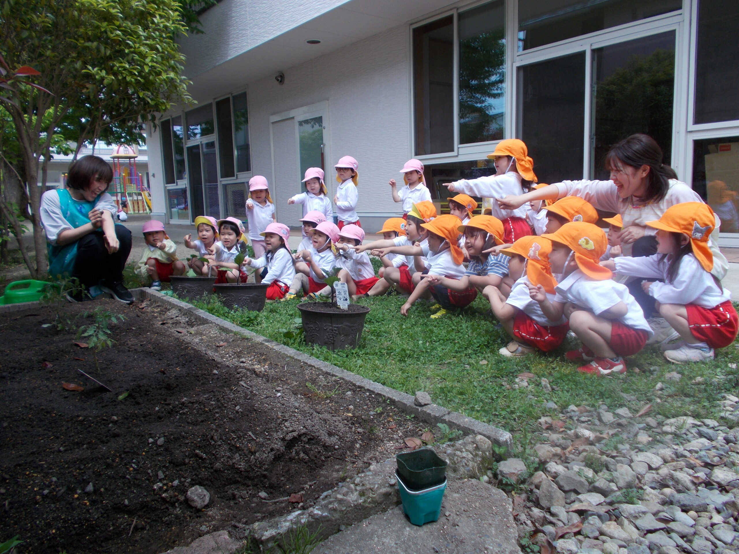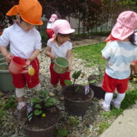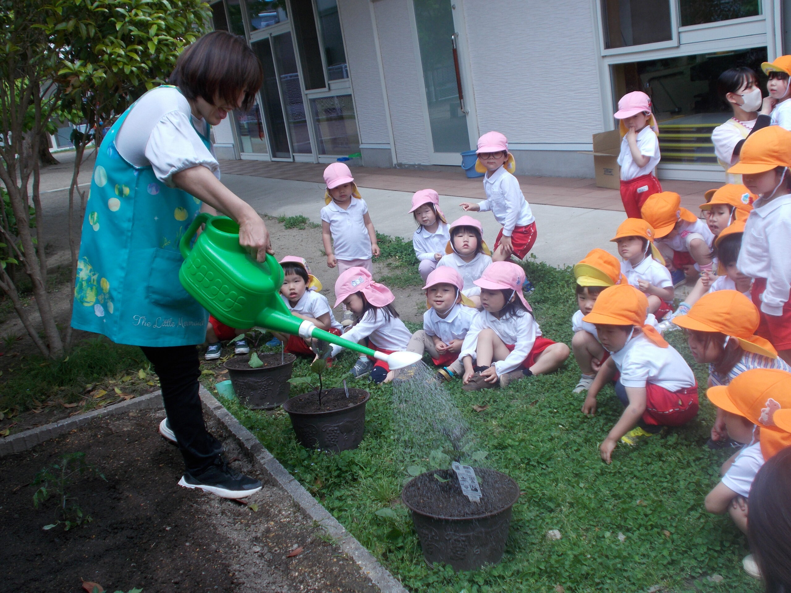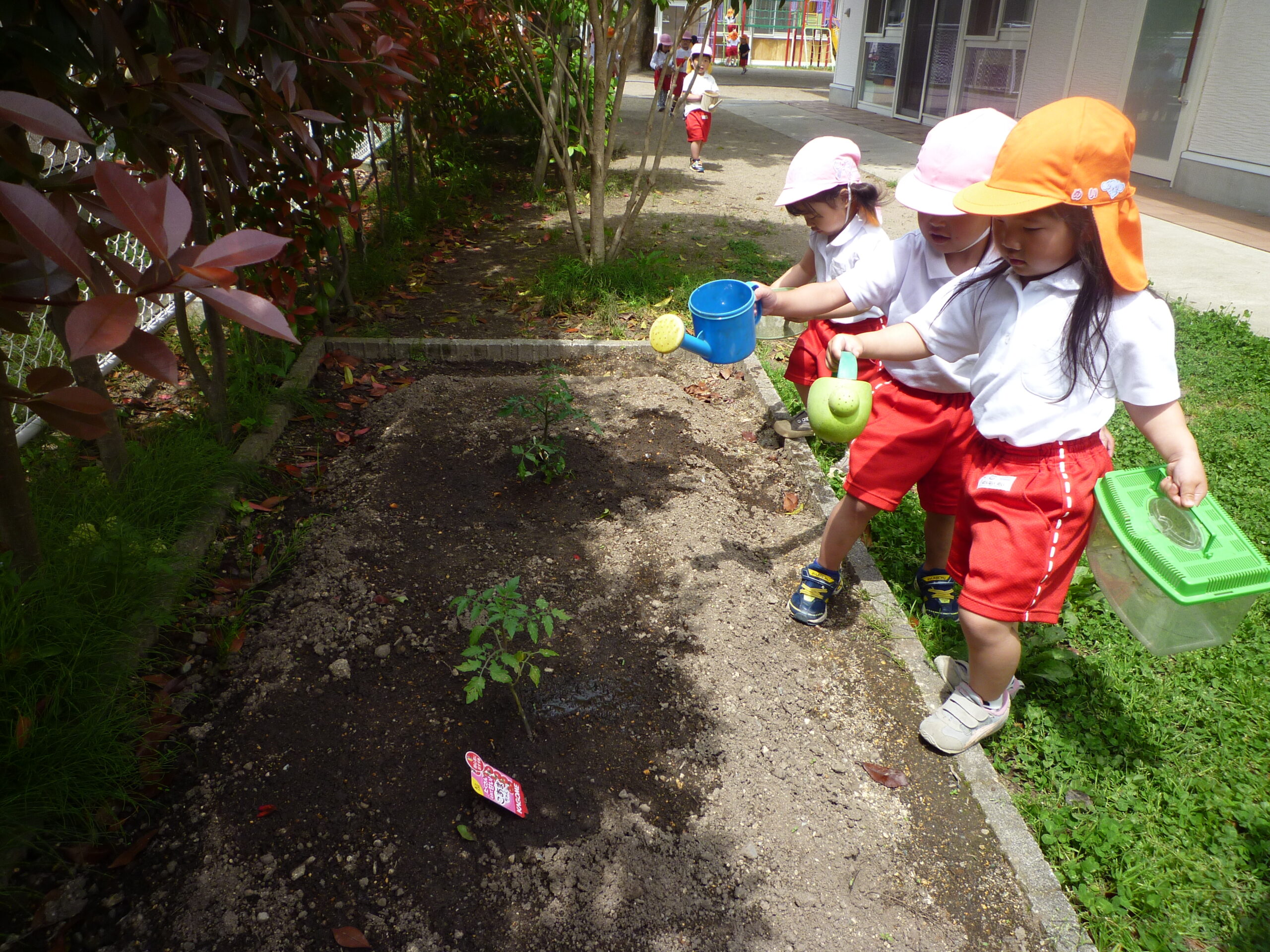 園庭の畑に植え、お水をあげた後は「元気に育つように!」「おいしくなるように!」とみんなで魔法をかけました✨