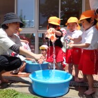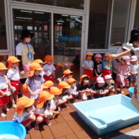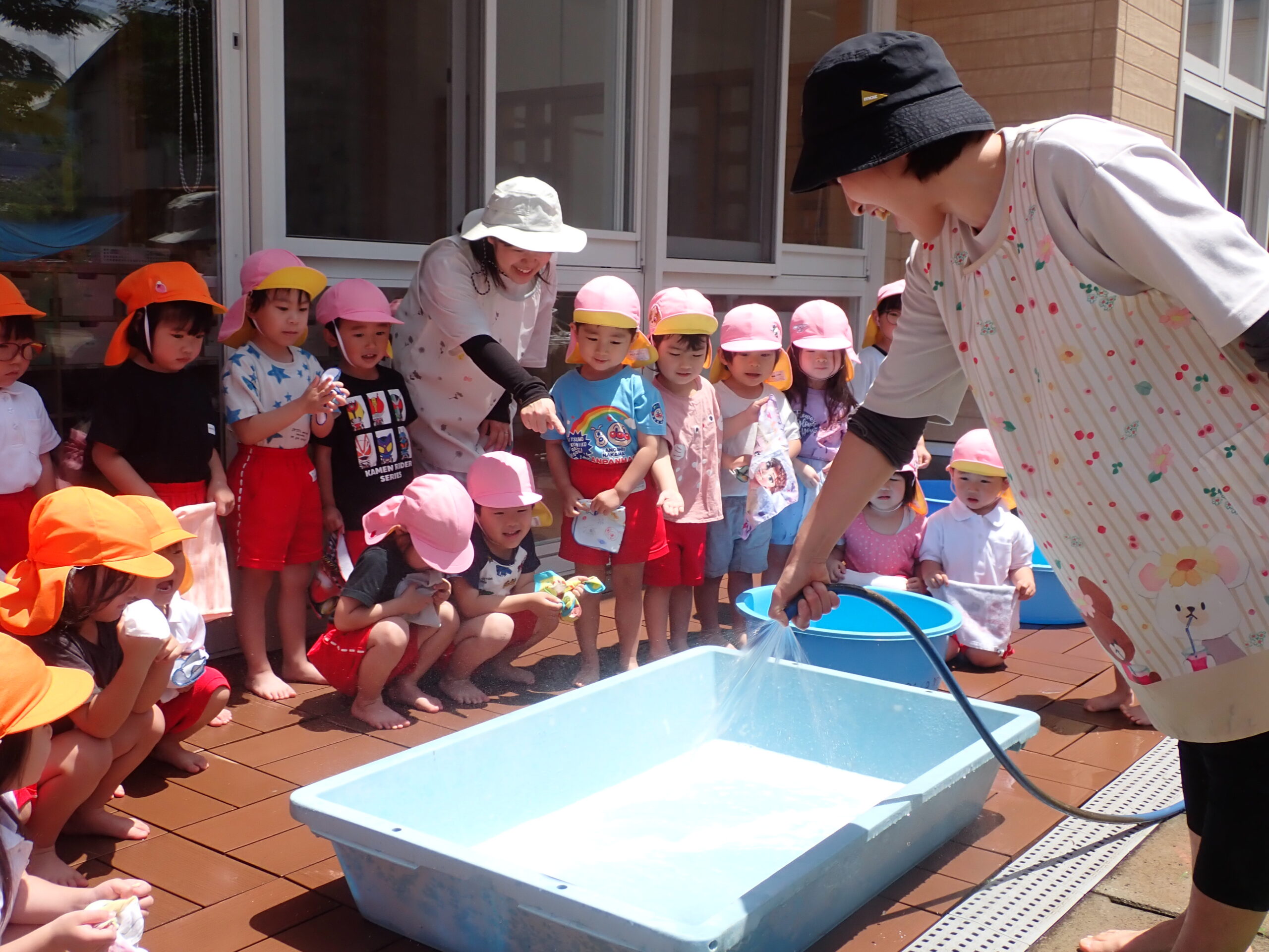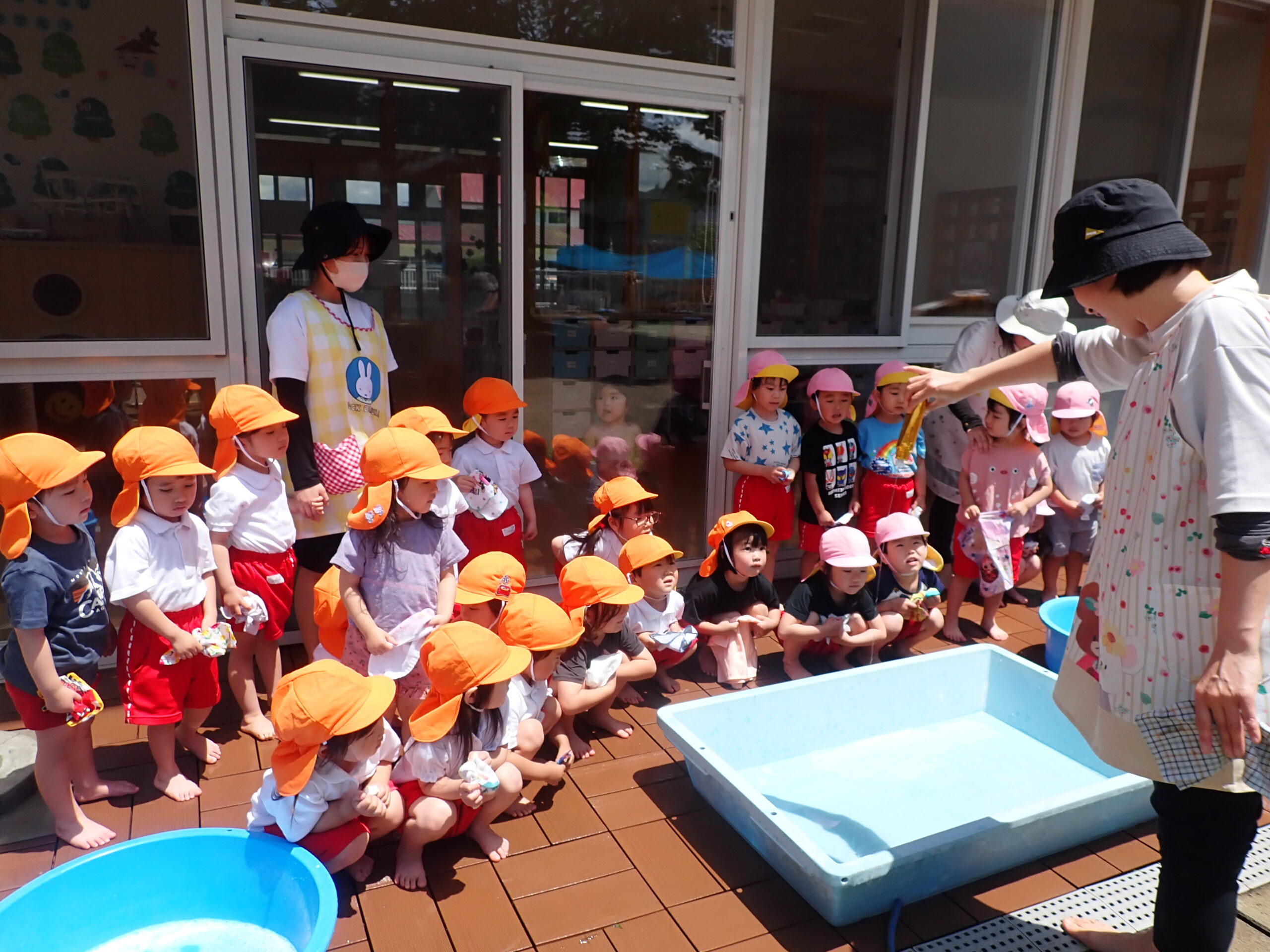 あら不思議!😮モコモコモコと泡が出てきました。たくさんの泡と飛んでくる水しぶきにみんな大喜び!「キャー!」「うわぁ!!」と歓声があがりましたよ😊