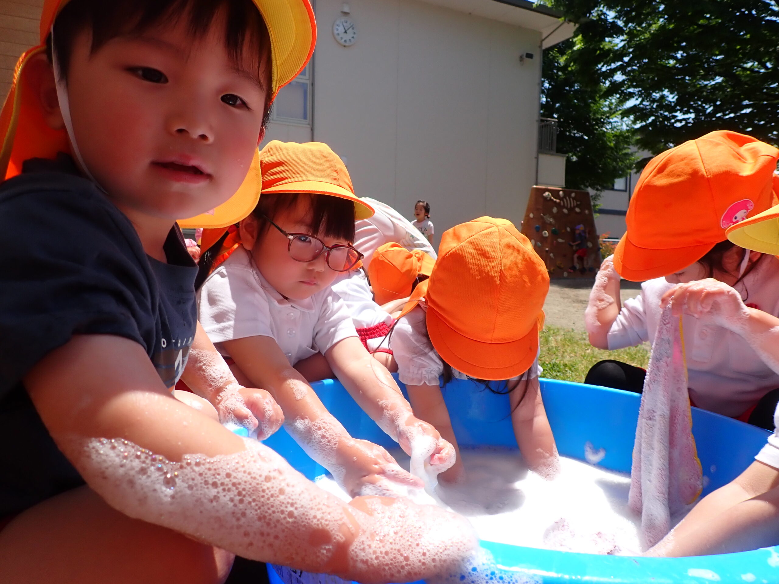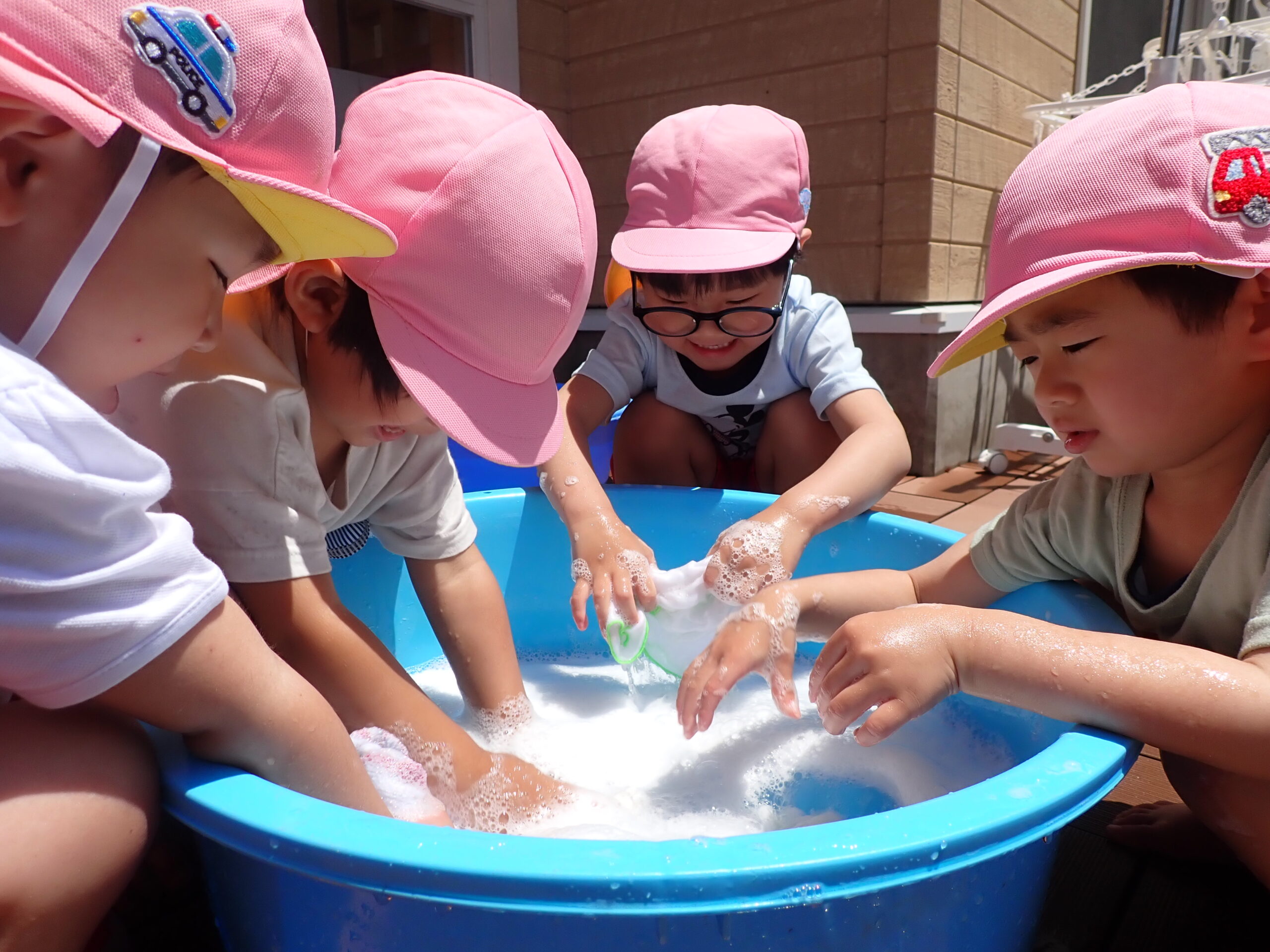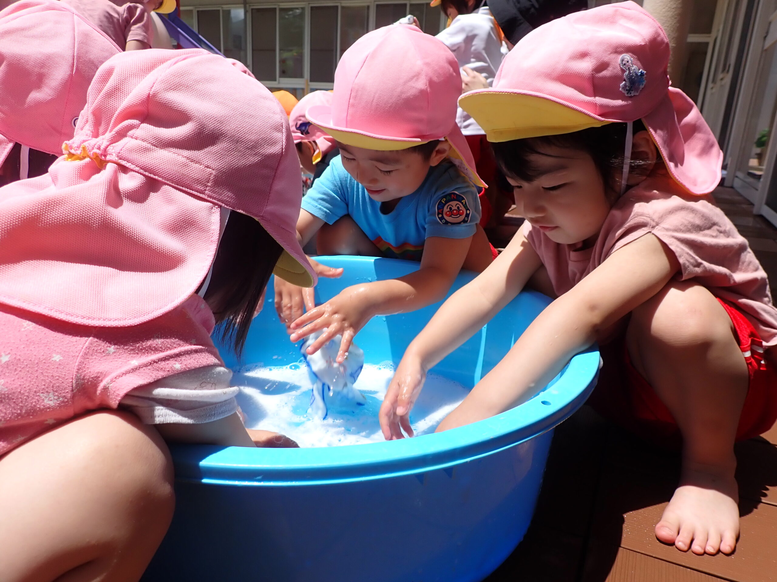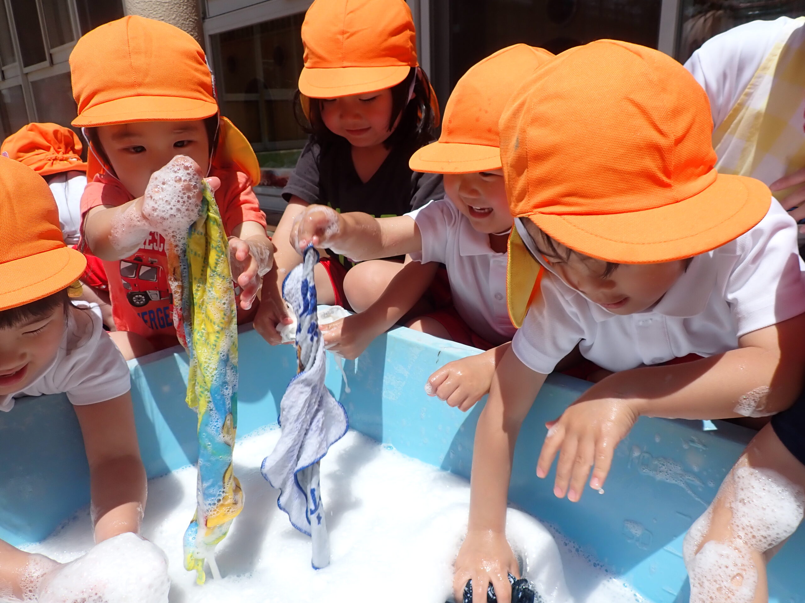 泡の中にハンカチを入れごしごし洗ったり、泡をたくさん集めたり・・・泡の感触を楽しみながらハンカチを洗い、きれいな水ですすいだ後は
